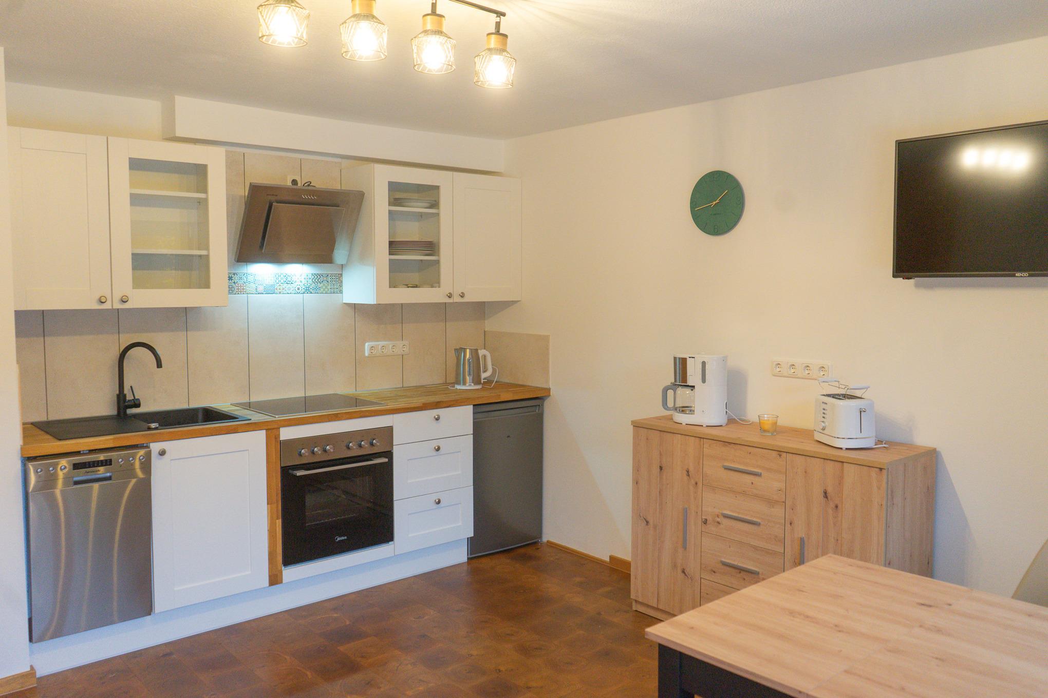 Für den abendlichen Schlummertrunk ist die schöne Terrasse ideal. Die gut ausgestattete Küche besitzt unter anderem einen Kühlschrank, einen Herd zum Kochen und sogar eine Spülmaschine.