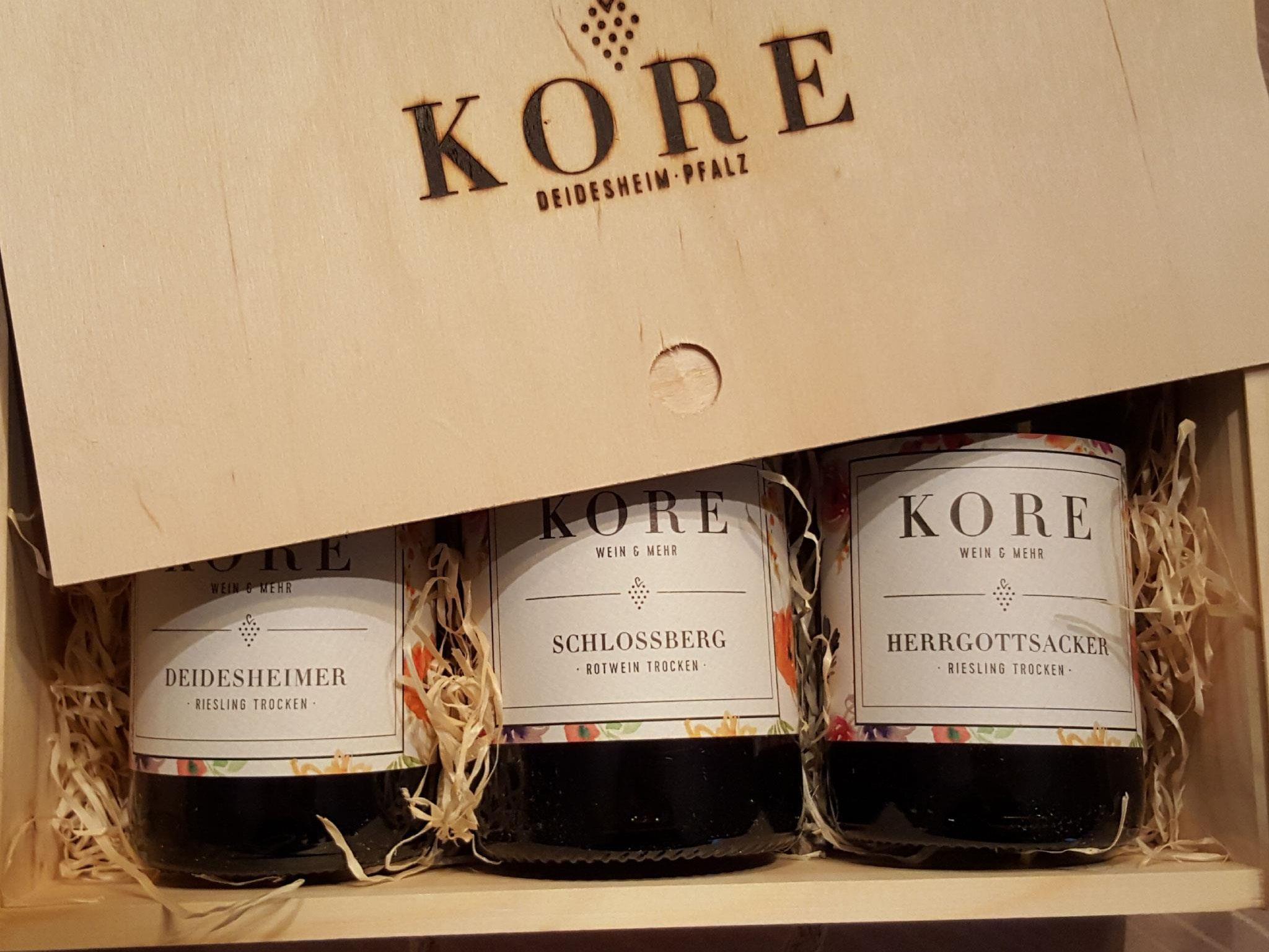 Wir kooperieren mit dem Weingut KORE Wein und mehr, Laura und Fabian Kerbeck aus Deidesheim/Pfalz, und bieten Ihnen bei Interesse gerne ausgewählte Weine zum Verkauf an. Weitere Infos unter http://www.kore-wein.de