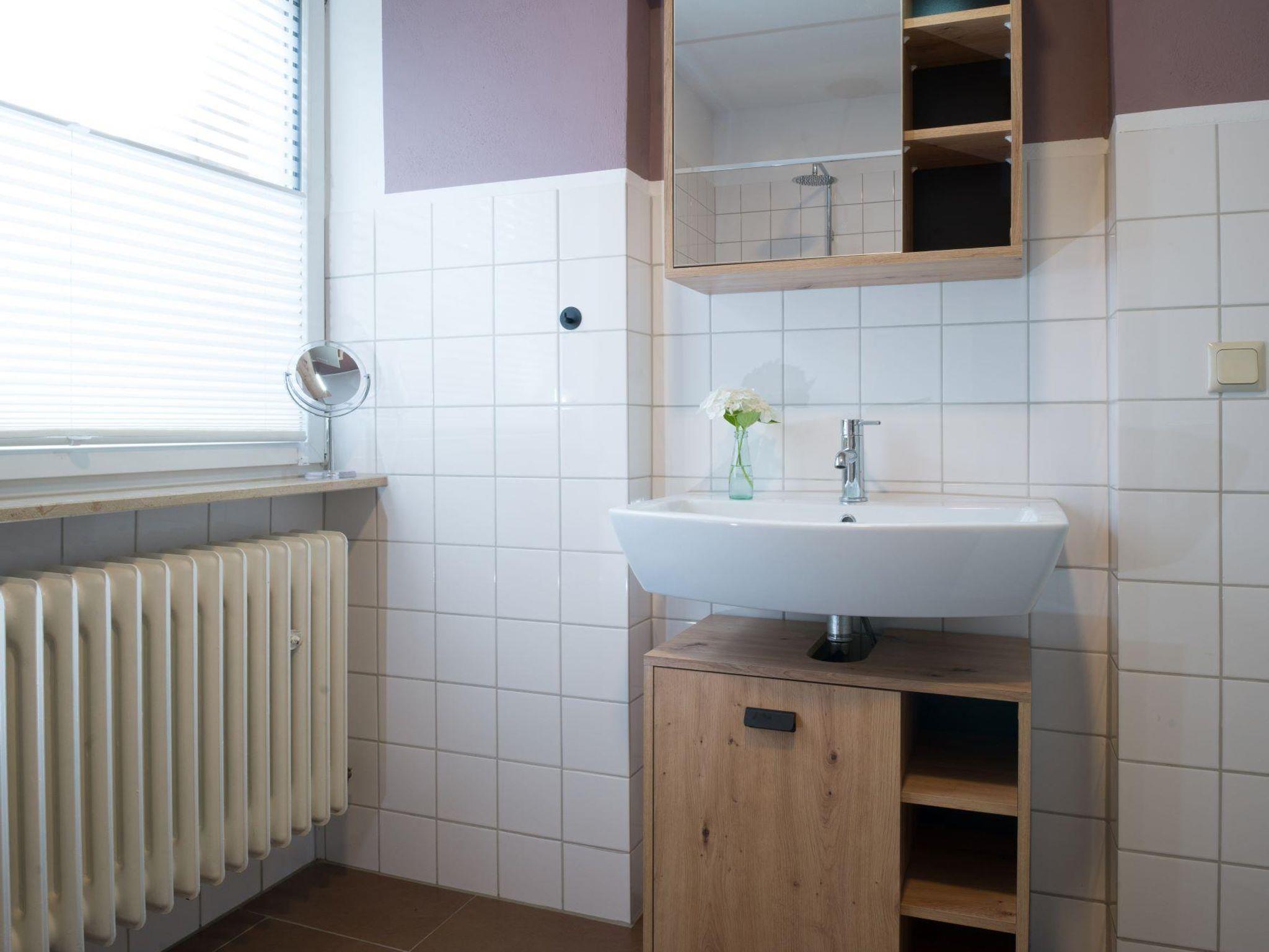 Das Bad verfügt über ein Fenster. Föhn, beleuchteter Spiegelschrank und Kosmetikspiegel vorhanden. Das WC ist seperat.