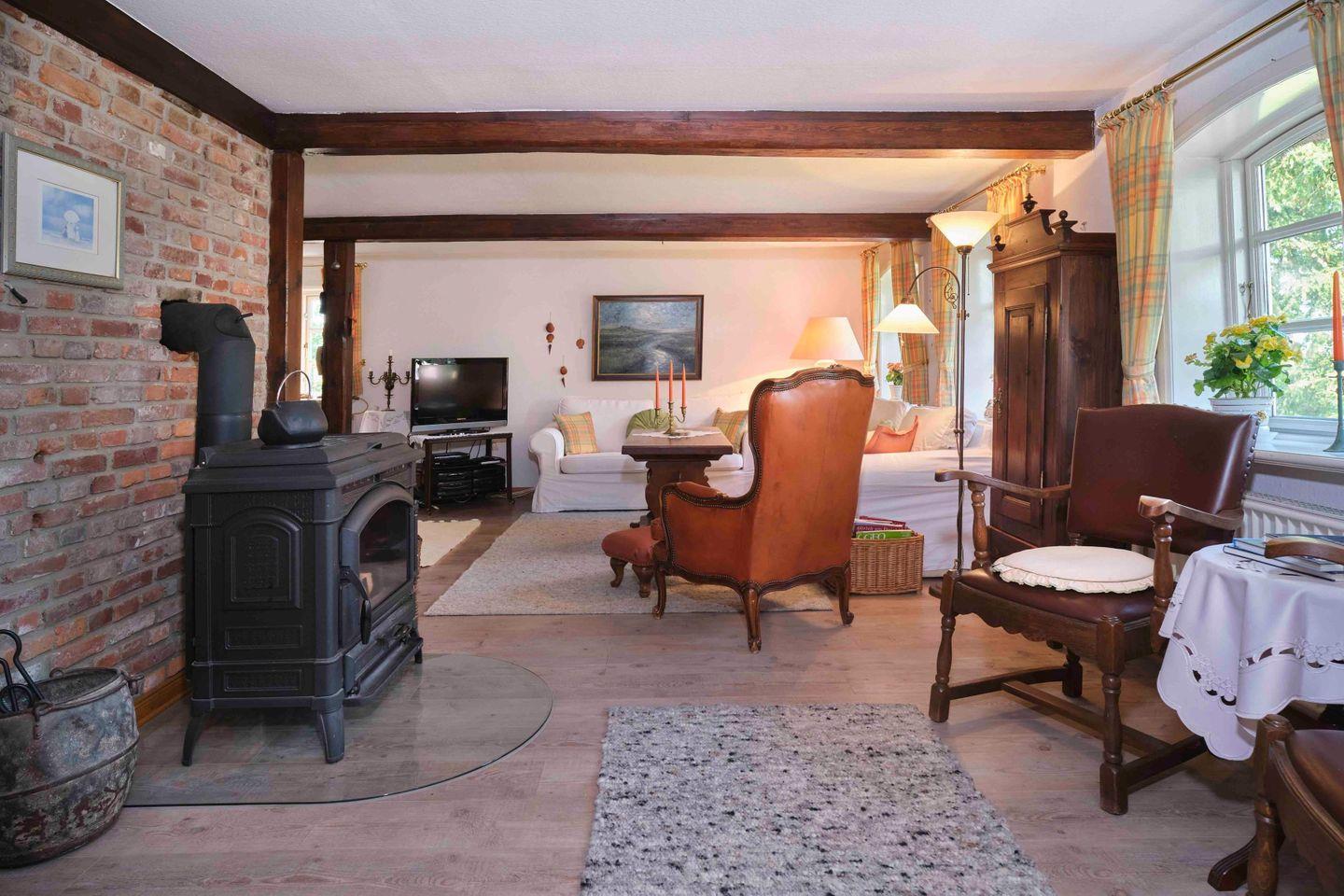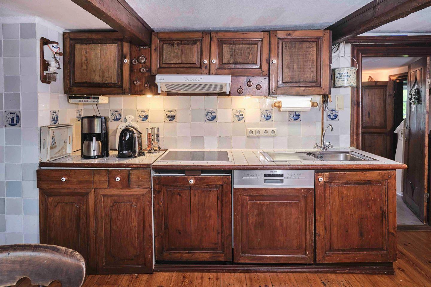 Beim Eintreten fällt sogleich die liebevolle Anordnung antiker Kleinigkeiten und teilweise antiquarische Einrichtung ins Auge. Die Küche, mit einer Balkenhöhe von nur 1,85 m, ist gemütlich und hat ihren alten Charakter bewahrt.