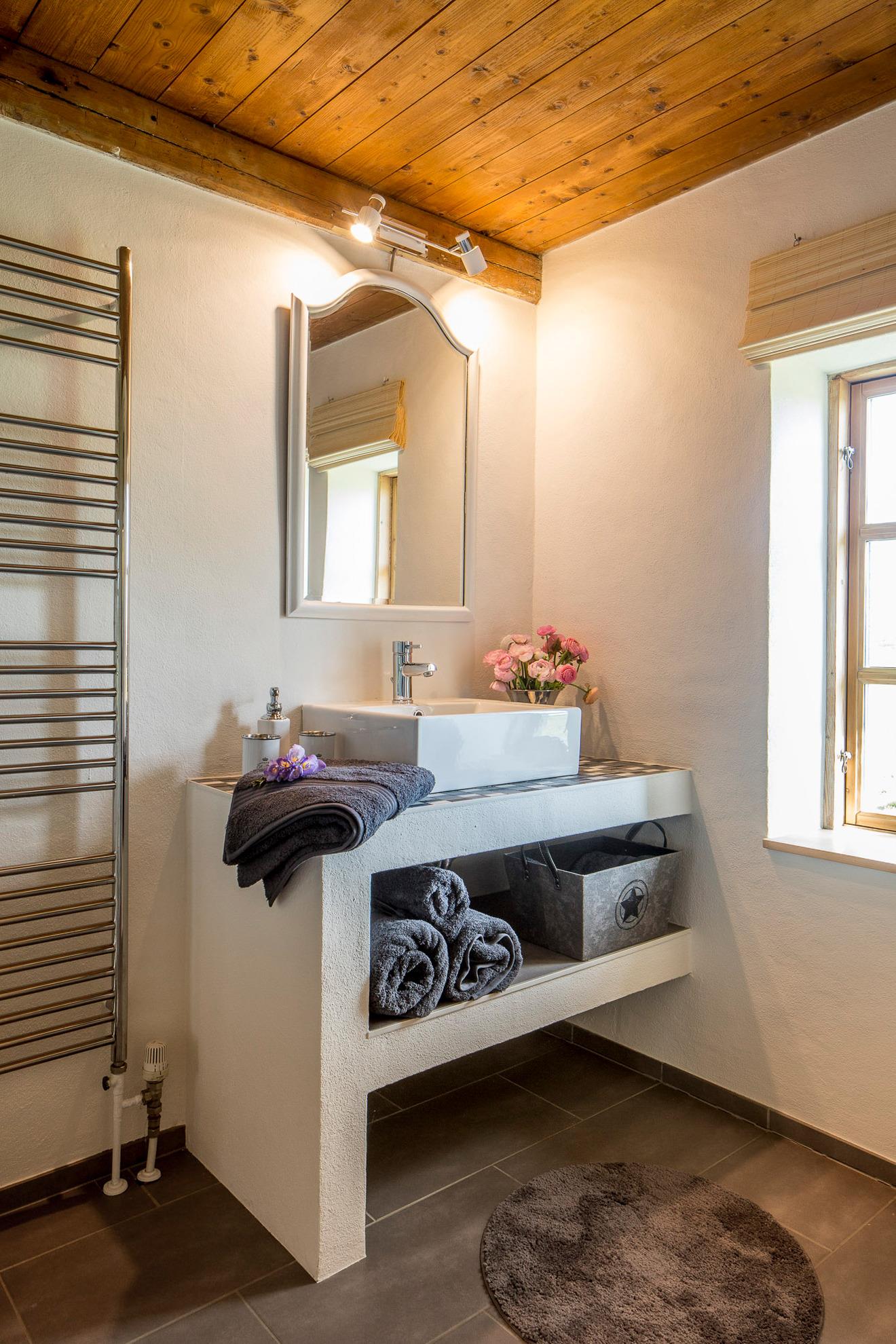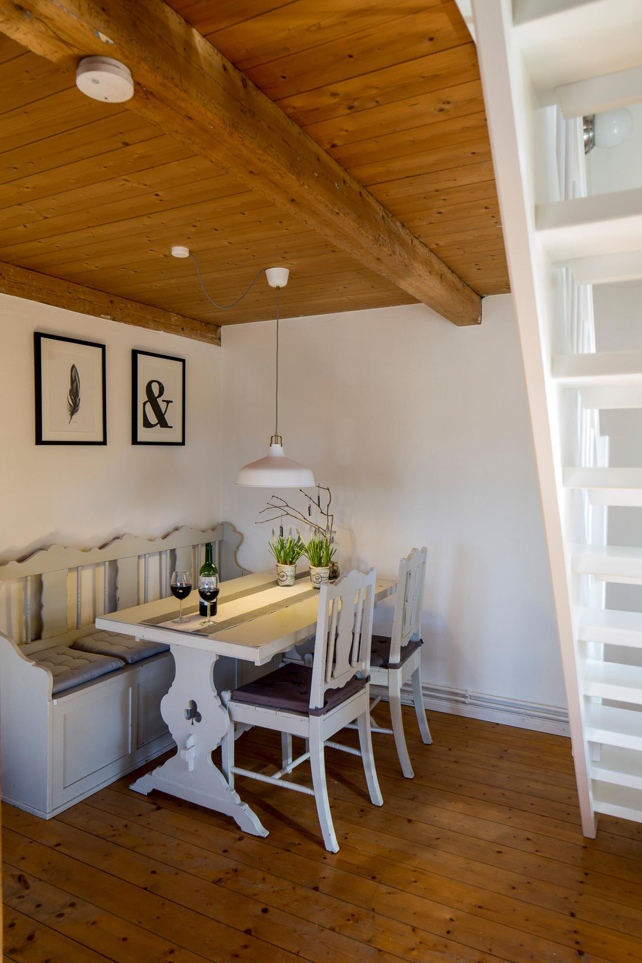 Das untere Schlafzimmer ist mit einem 1,40-Bett ausgestattet, im oberen Schlafzimmer steht den Gästen neben dem 1,80-Bett eine Schlafcouch zur Verfügung. Fernseher befinden sich im Wohnzimmer und im oberen Schlafzimmer. Ein Babybett kann gestellt werden. Das Haus ist auch auf Gäste eingestellt, die länger bleiben möchten und selbstverständlich mit Waschmaschine, Trockner und Geschirrspüler ausgestattet.
