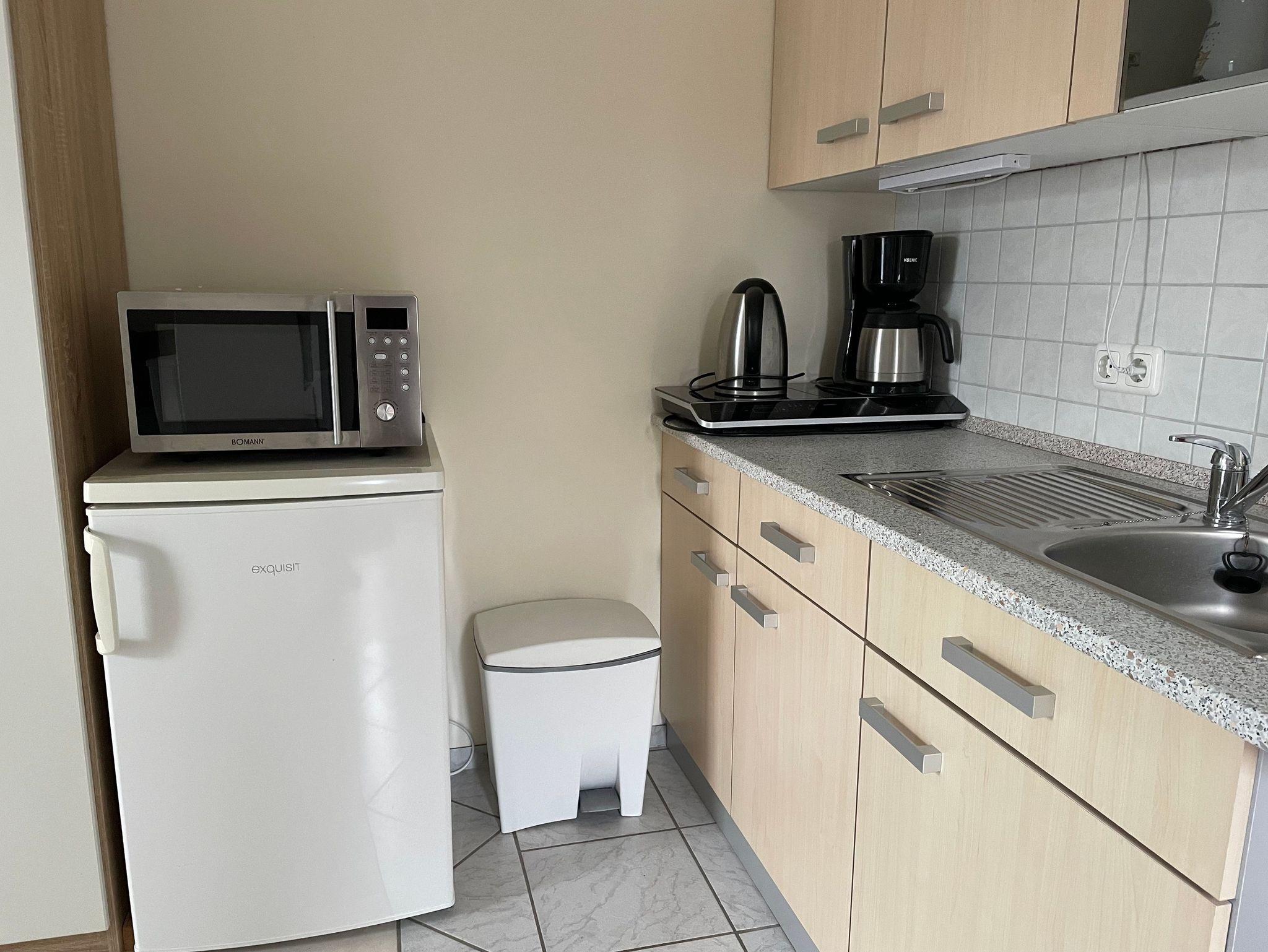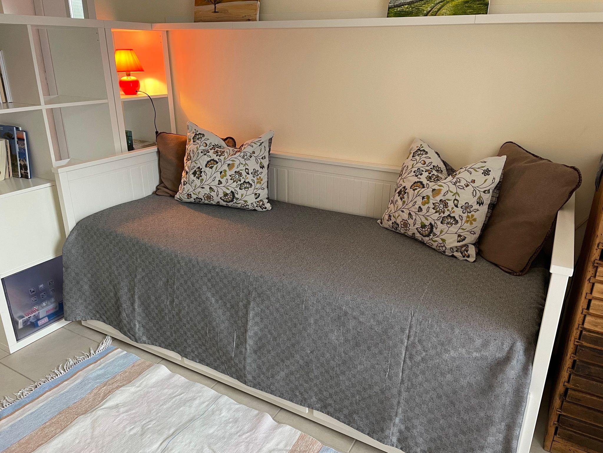 Wir vermieten unsere kleine Ferienwohnung an max. zwei Personen. In der Ferienwohnung befindet sich ein Bett welches über Tag als Couch benutzt werden kann. Bei einer Belegung mit zwei Personen kann diese als Doppelbett (1,6 m x 2,00 m) genutzt werden. In dem Wohn- und Schlafraum befindet sich eine kleine Küche für die Selbstversorgung. Das Bad ist übersichtlich und geräumig.