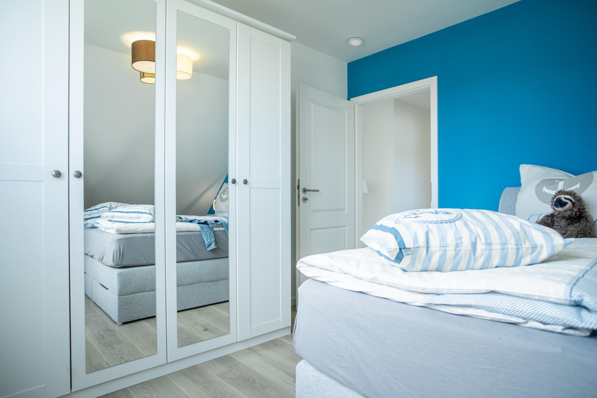 Die drei liebevoll gestalteten Schlafzimmer im Obergeschoss sind mit komfortablen Boxspringbetten ausgestattet – zwei Schlafzimmer jeweils mit einem 1,80 x 2,00 m Boxspringbett und großem Kleiderschrank. Das dritte Schlafzimmer mit zwei zusammen schiebbaren Einzelbetten je 1,00 x 2,00 m. Das Schlafzimmer verfügt über einen kleinen Kleiderschrank, Kommode, Nachttische und einen 40 Zoll Flatscreen-TV.