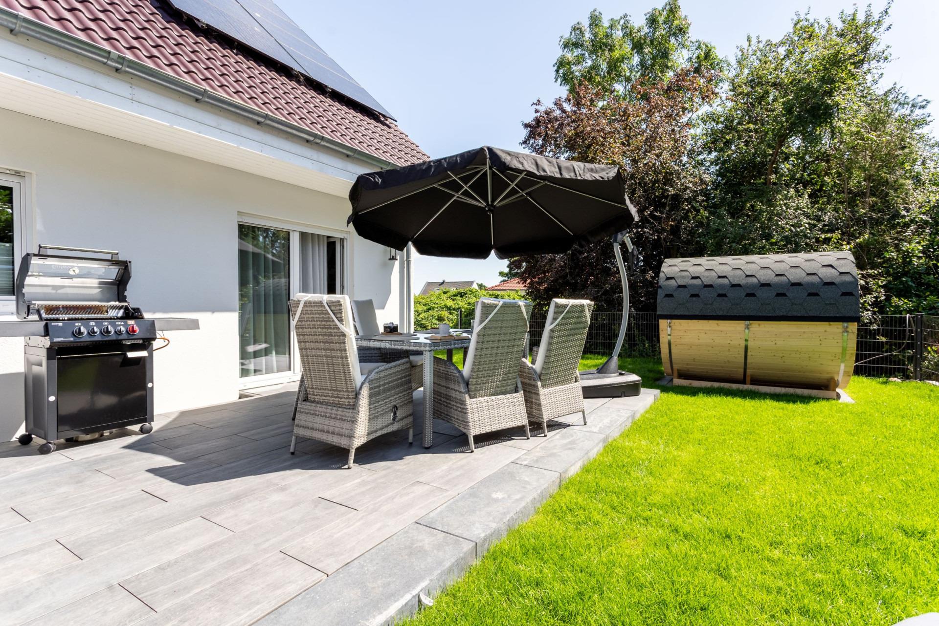 Eine Fasssauna sorgt für noch mehr Entspannung.