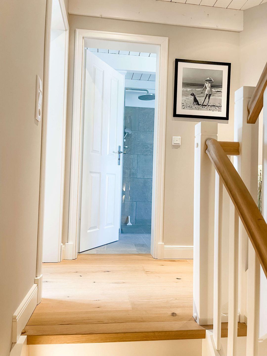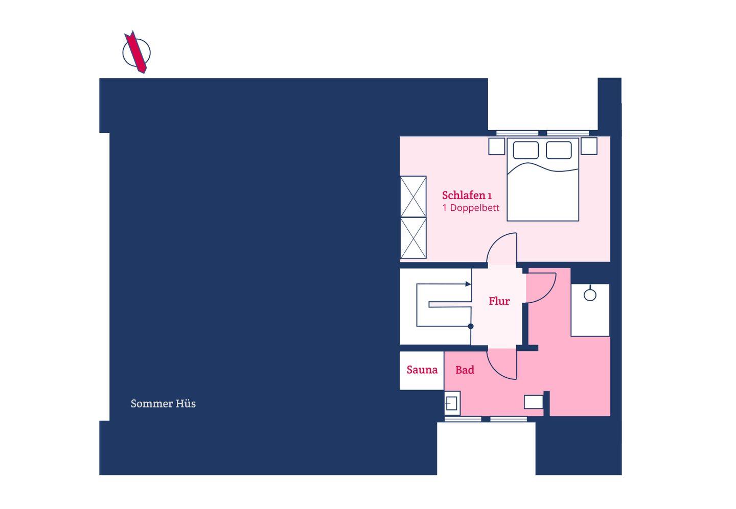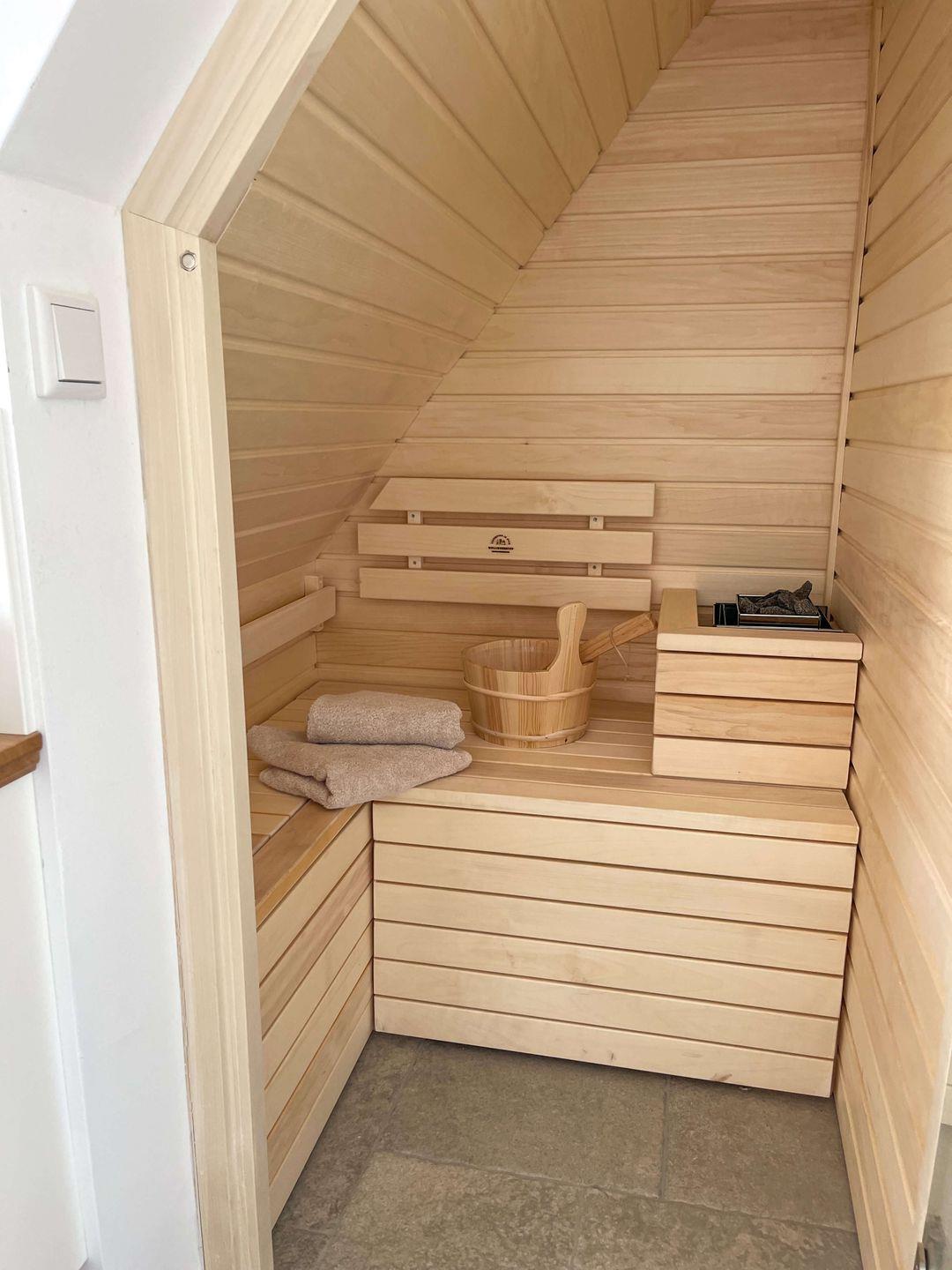 Im Obergeschoss ist ein Schlafzimmer mit einem Doppelbett sowie das Duschbad mit der hauseigenen Sauna gelegen.