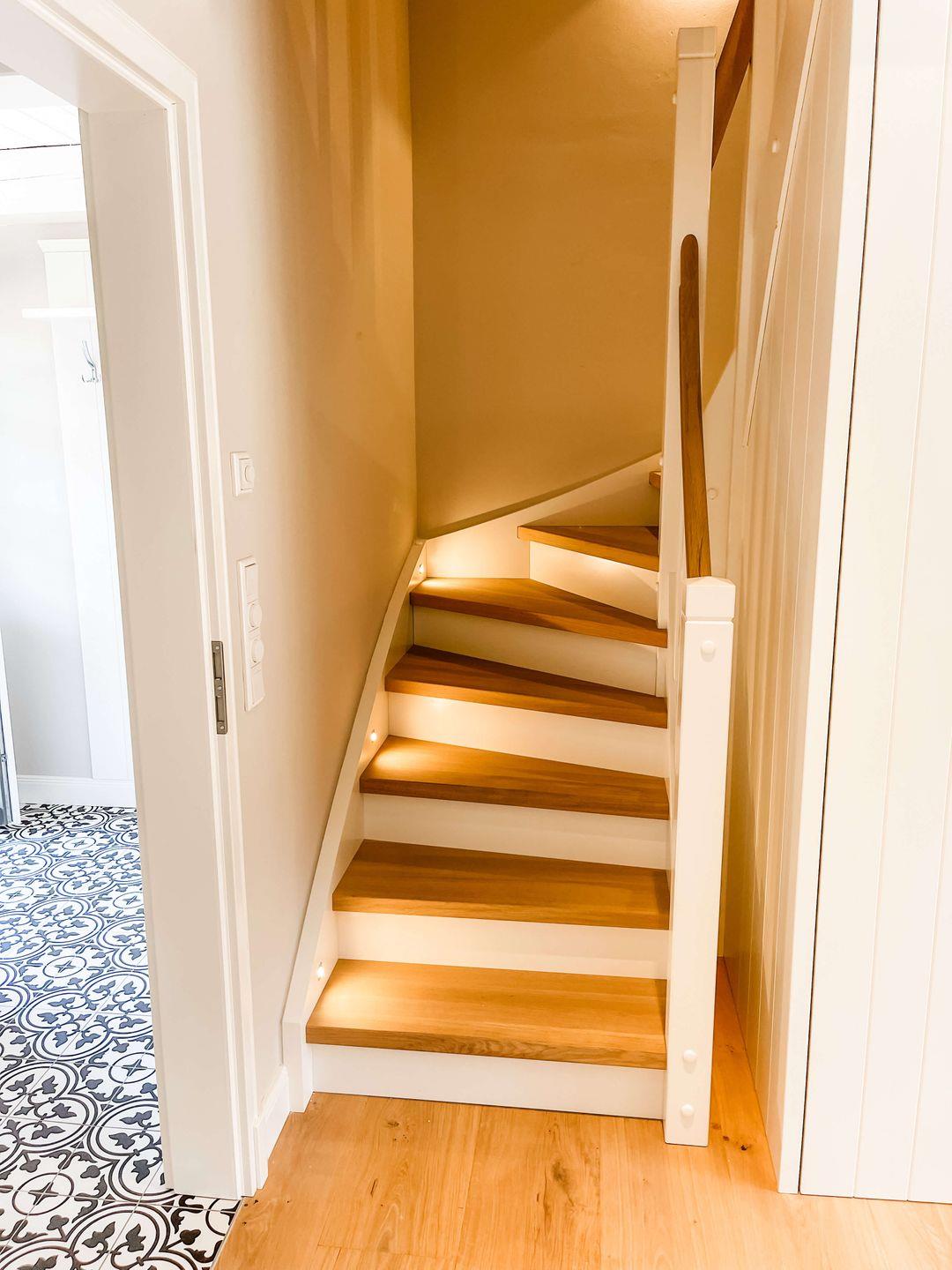 Im Erdgeschoss befinden sich der großzügige Wohn- und Essbereich mit offener Küche sowie das Gäste-WC. Über den Wohnbereich gelangen Sie direkt auf die eigene Terrasse und in den Garten. Der Original Mylin-Kachelofen sorgt auch an kühleren Tagen für eine angenehme Atmosphäre.