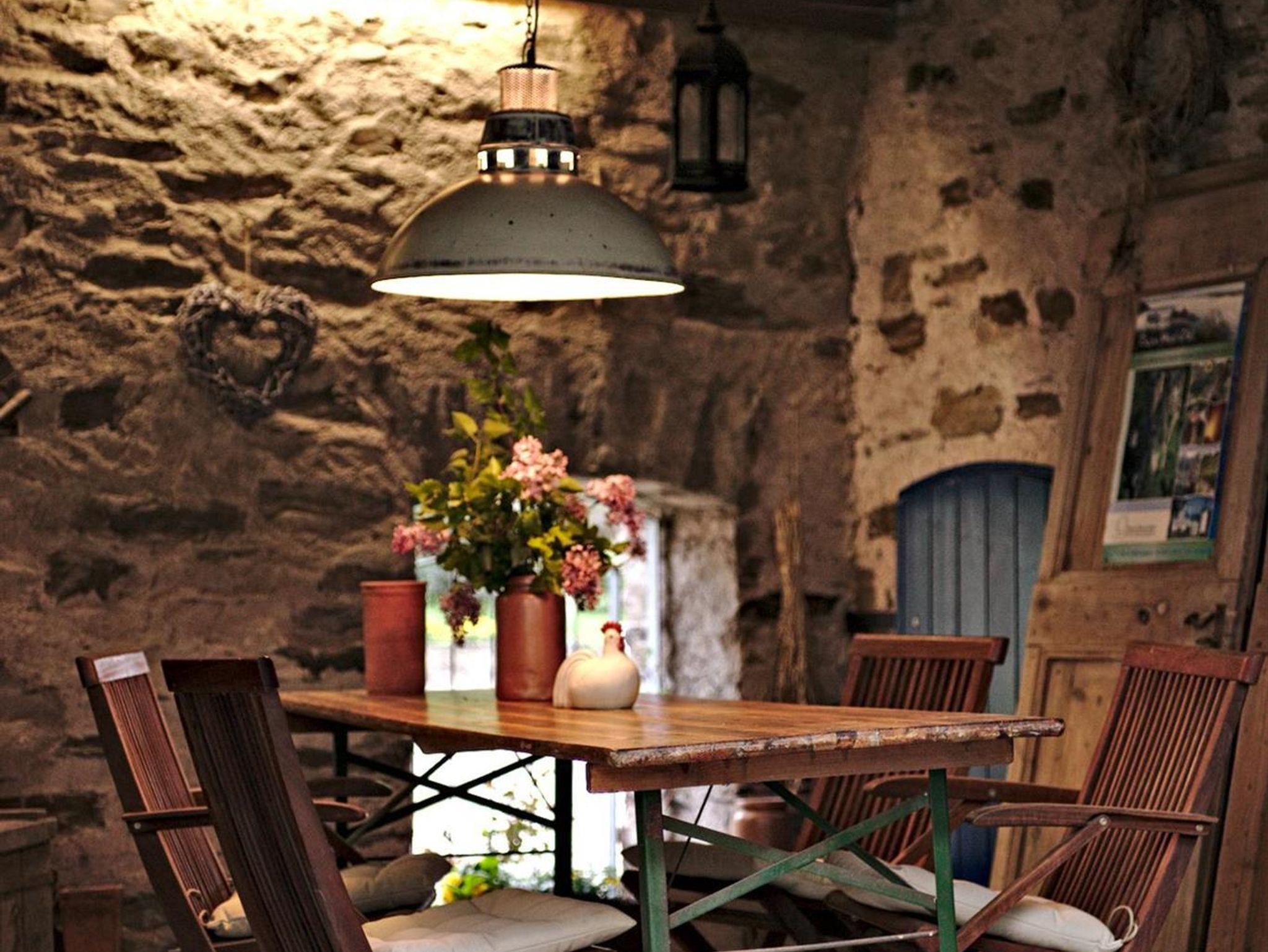 Der Essplatz mit Blick auf den Hof: Hier können Sie in der Morgensonne frühstücken oder Abends ein gutes Buch lesen und Musik hören, denn Literatur und ein CD-Player gehören selbstverständlich dazu, damit Sie sich rundum, wie zu Hause fühlen können.