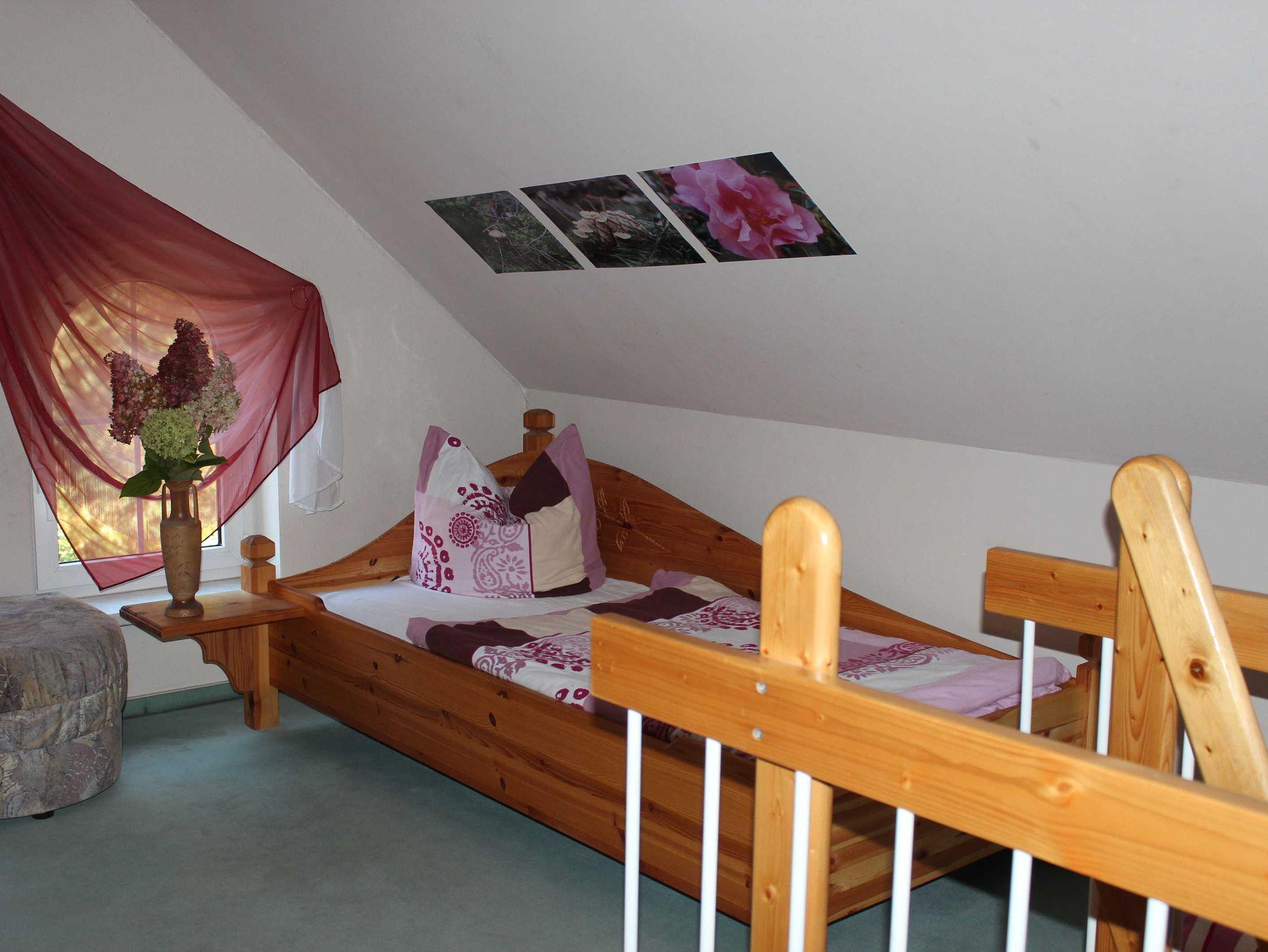 Im Dachgeschoss ein Schlafraum mit Himmel-Doppelbett und ein Dreibettzimmer über eine Raumspartreppe zu erreichen und dazu eine süße Kuschelecke für die Kleinen. Ein Bad mit Dusche und WC.