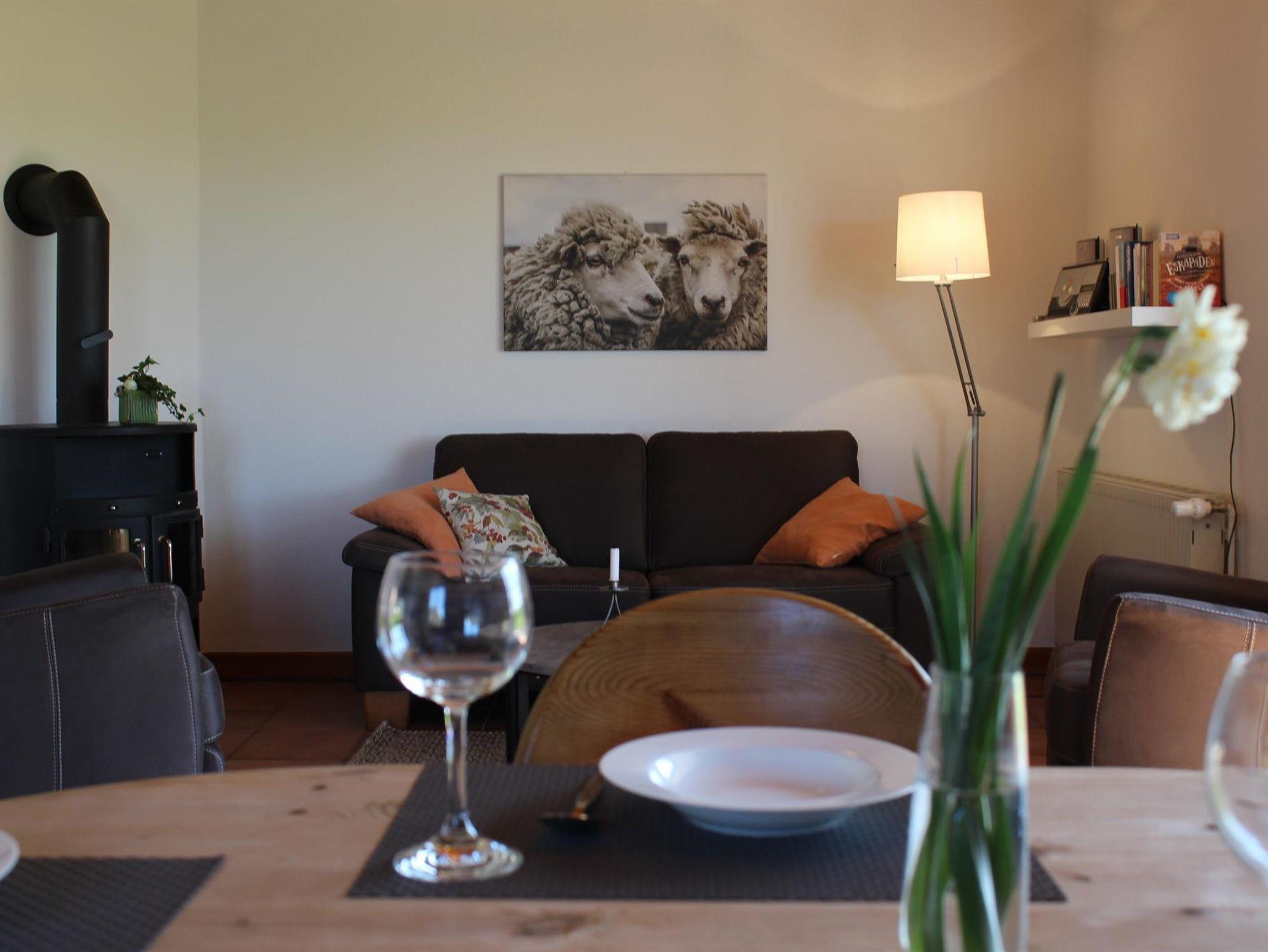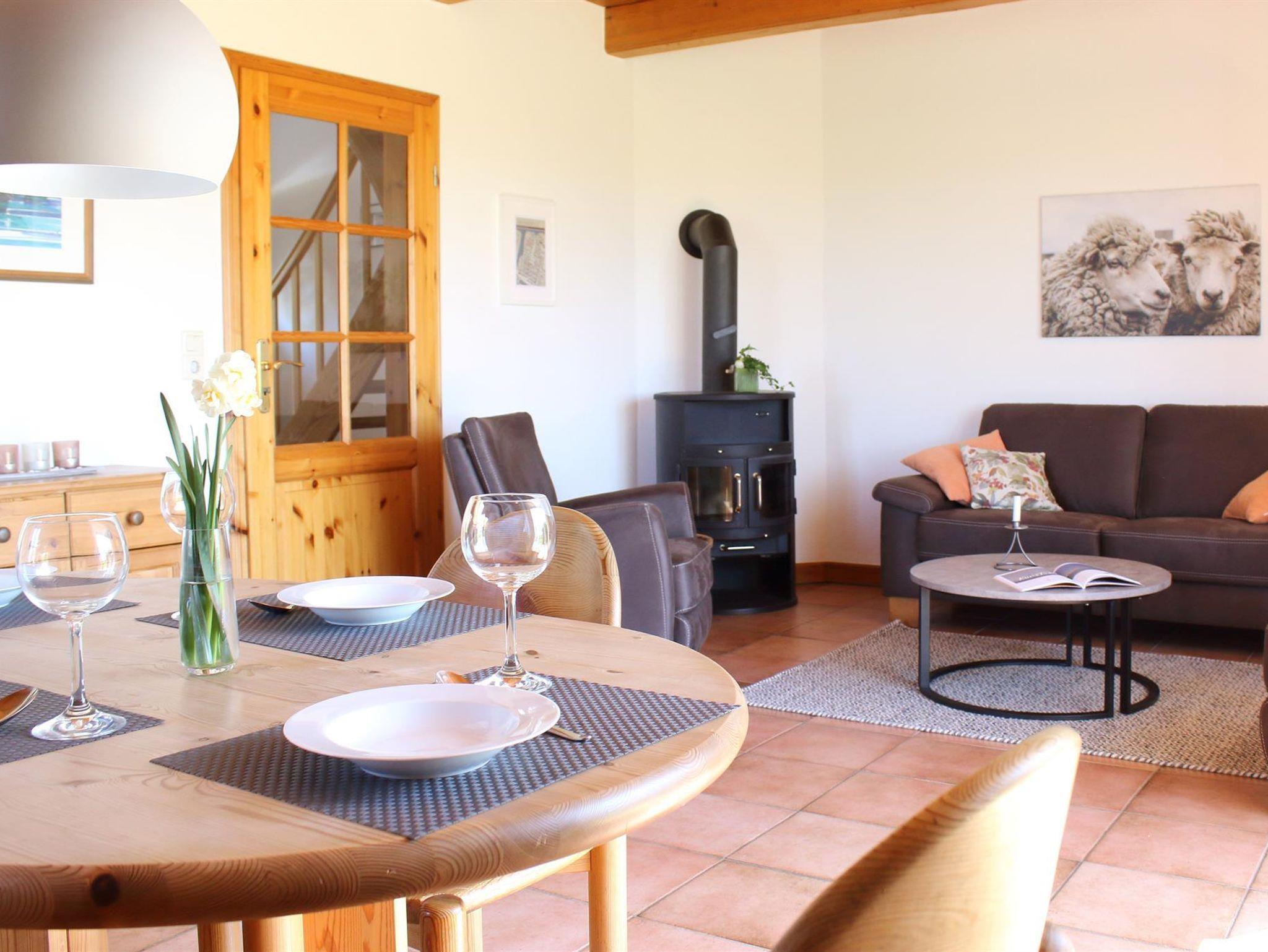 Die Ferienwohnung ist 72 qm groß. Der großzügige Wohn/Essbereich mit Kaminofen ist gemütlich eingerichtet und verfügt über eine Holzbalkendecke. Sie haben aus der Ferienwohnung einen schönen Blick nach Süden und Westen. Die separate Küche mit Geschirrspüler ist komplett ausgestattet. Es befindet sich neben dem Flur ein WC/Waschbecken. Im 1. Stock liegen ein Schlafzimmer mit nebeneinander stehenden Betten und 1 Schlafzimmer mit hintereinander stehenden Betten, jeweils unter einer Dachschräge. Ebenso liegt das Badezimmer mit Dusche/WC und einer Waschmaschine im Obergeschoss.