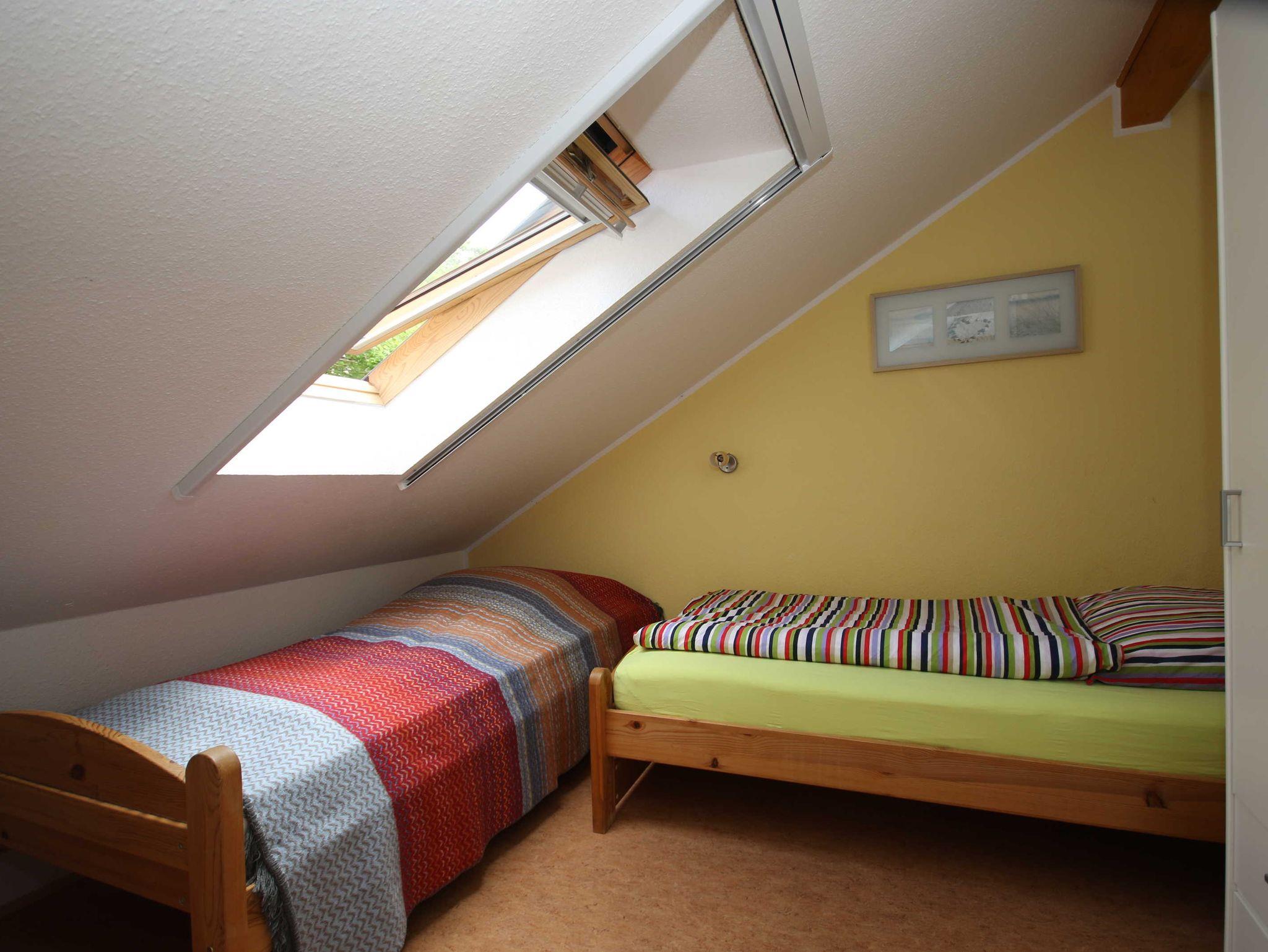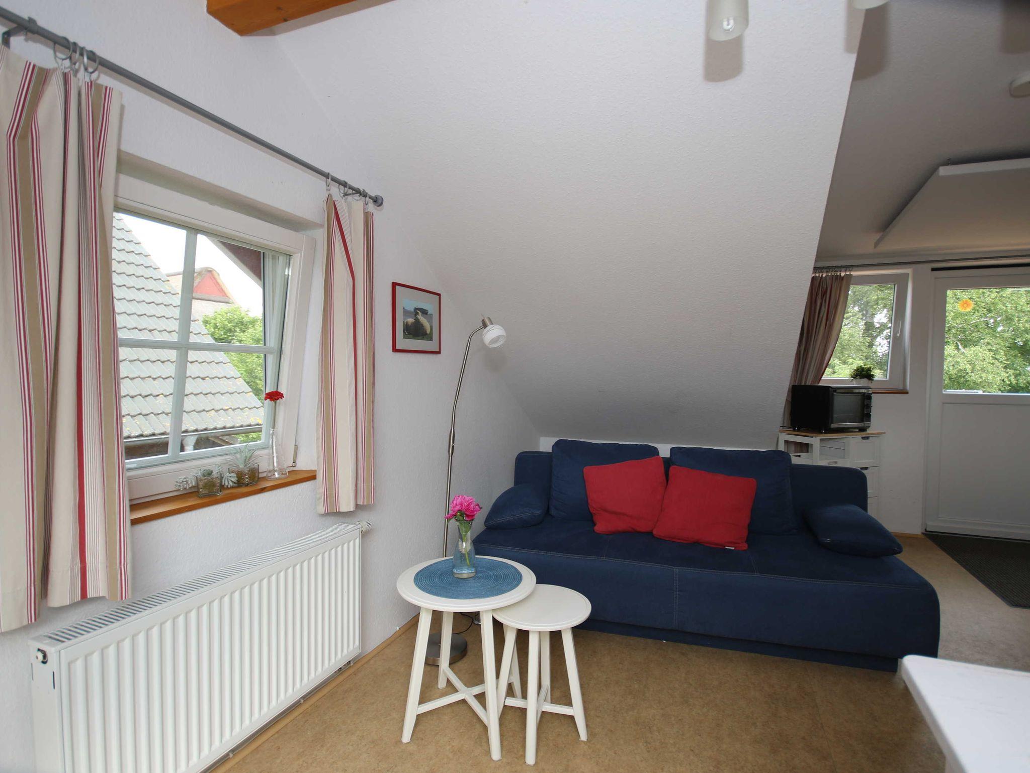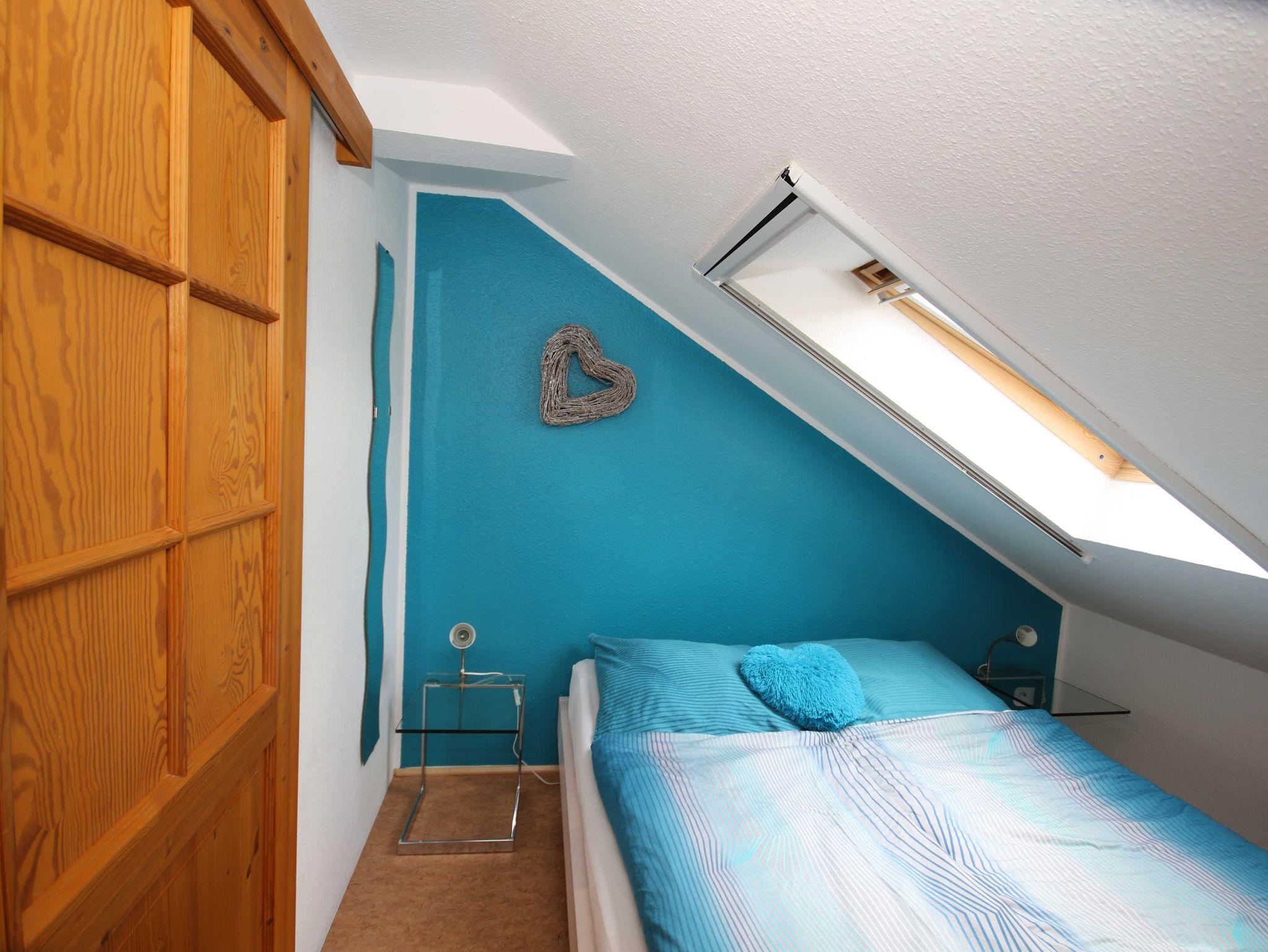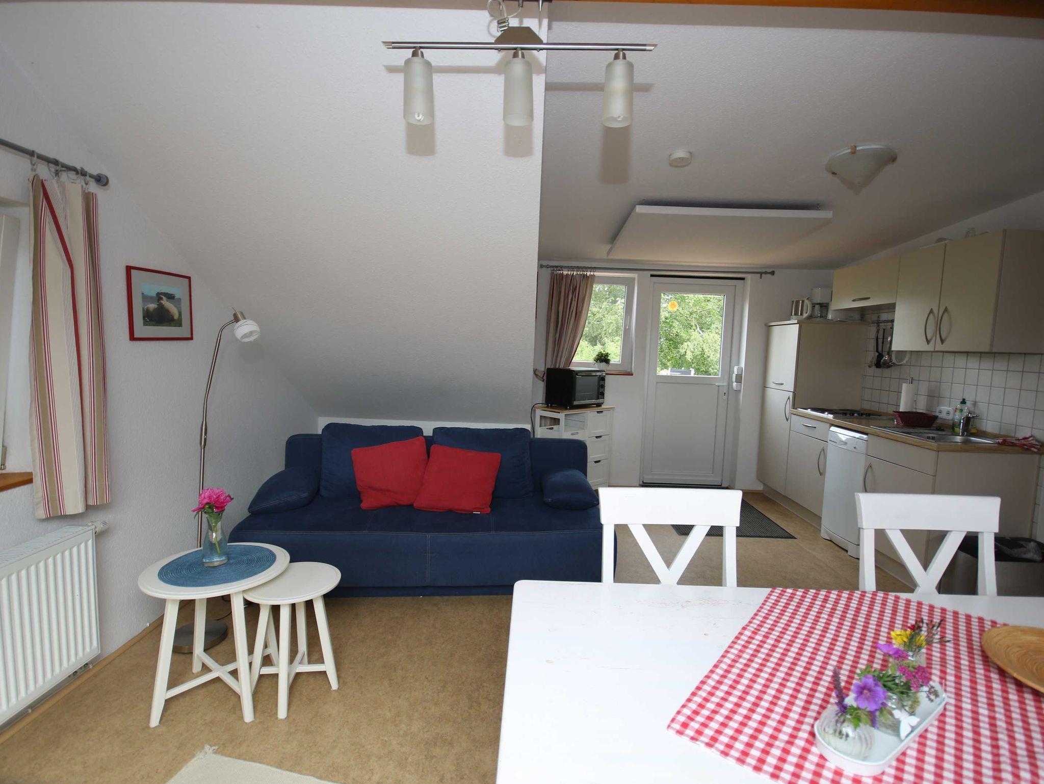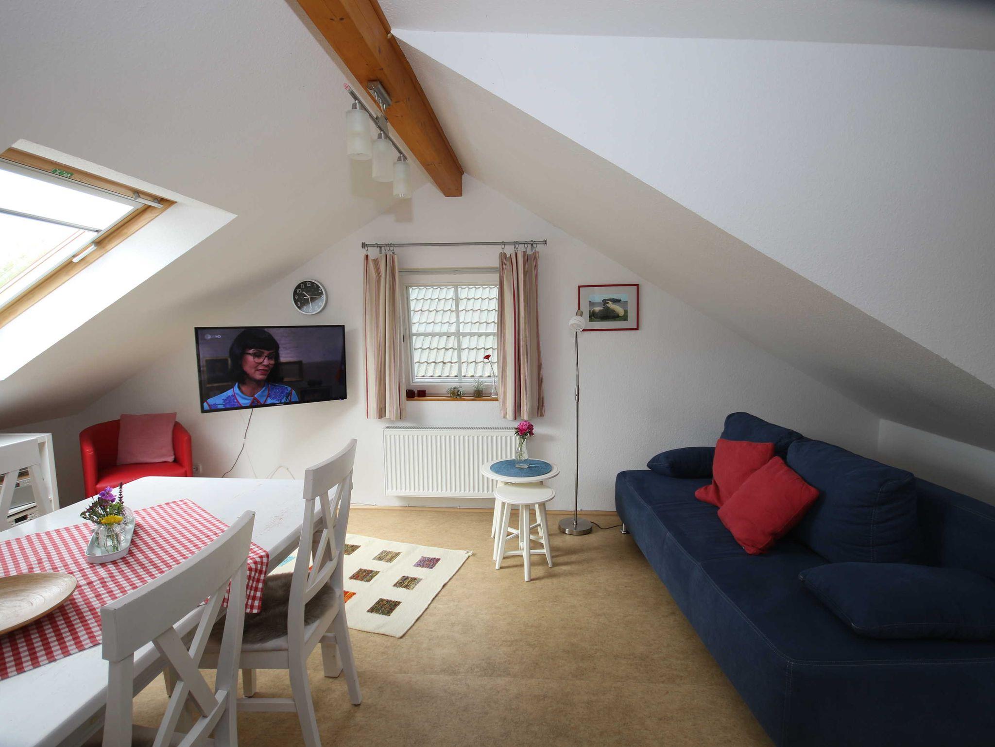 Die ca. 50 m² große Ferienwohnung hat einen separaten Eingang, eine großzügige neue Dachterrasse, ein Wohnzimmer, 2 Schlafzimmer, eine Küchezeile und ein Duschbad.