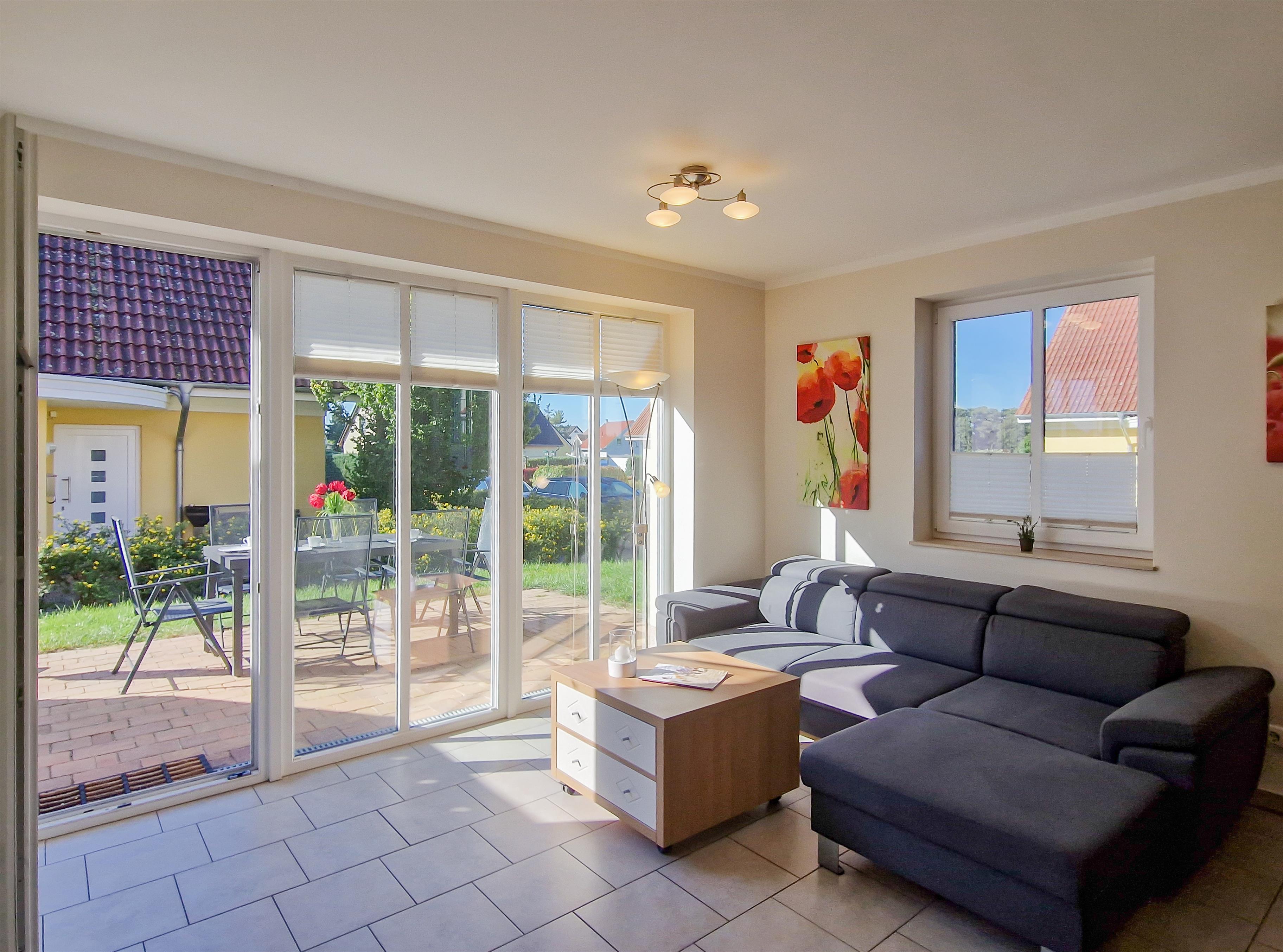Diese Ferienhaushälfte bietet mit 72 qm Platz für max. 6 Personen. Der helle Wohnraum ist mit einer gemütlichen Couchecke mit Schlaffunktion (Liegefläche 125x190) und Flat TV eingerichtet. Für wohlige Wärme an kühleren Tagen sorgt ein Kaminofen. Der Essplatz ist zusammen mit der Vollküche inkl. Geschirrspüler, Backofen, Mikrowelle, Kühlschrank inkl. Gefrierfach etc. ebenfalls im Wohnraum integriert. Sie sonnige Terrasse zum Süden ist vom Wohnraum begehbar und lädt zum Verweilen ein. Das Badezimmer im Erdgeschoss ist mit Dusche und Waschbecken/WC ausgestattet. Außerdem steht Ihnen hier eine Waschmaschine zur kostenfreien Nutzung zur Verfügung. Die beiden Schlafzimmer im Obergeschoss sind mit einem Doppelbett mit getrennten Matratzen bzw. zwei Einzelbetten (jeweils 90 x 200) und ausreichend Schrankraum eingerichtet. Das Badezimmer im Obergeschoss verwöhnt die Gäste mit einer Infrarotwärmekabine, auch hier stehen Dusche und Waschbecken/WC zur Verfügung. Ein Pkw-Stellplatz befindet sich auf dem Grundstück.