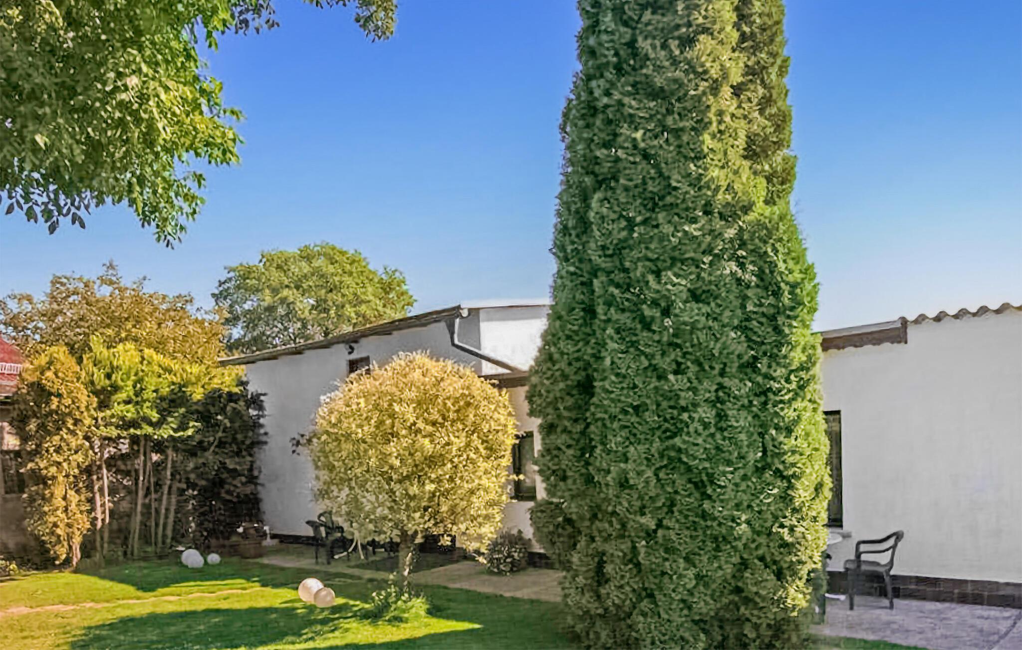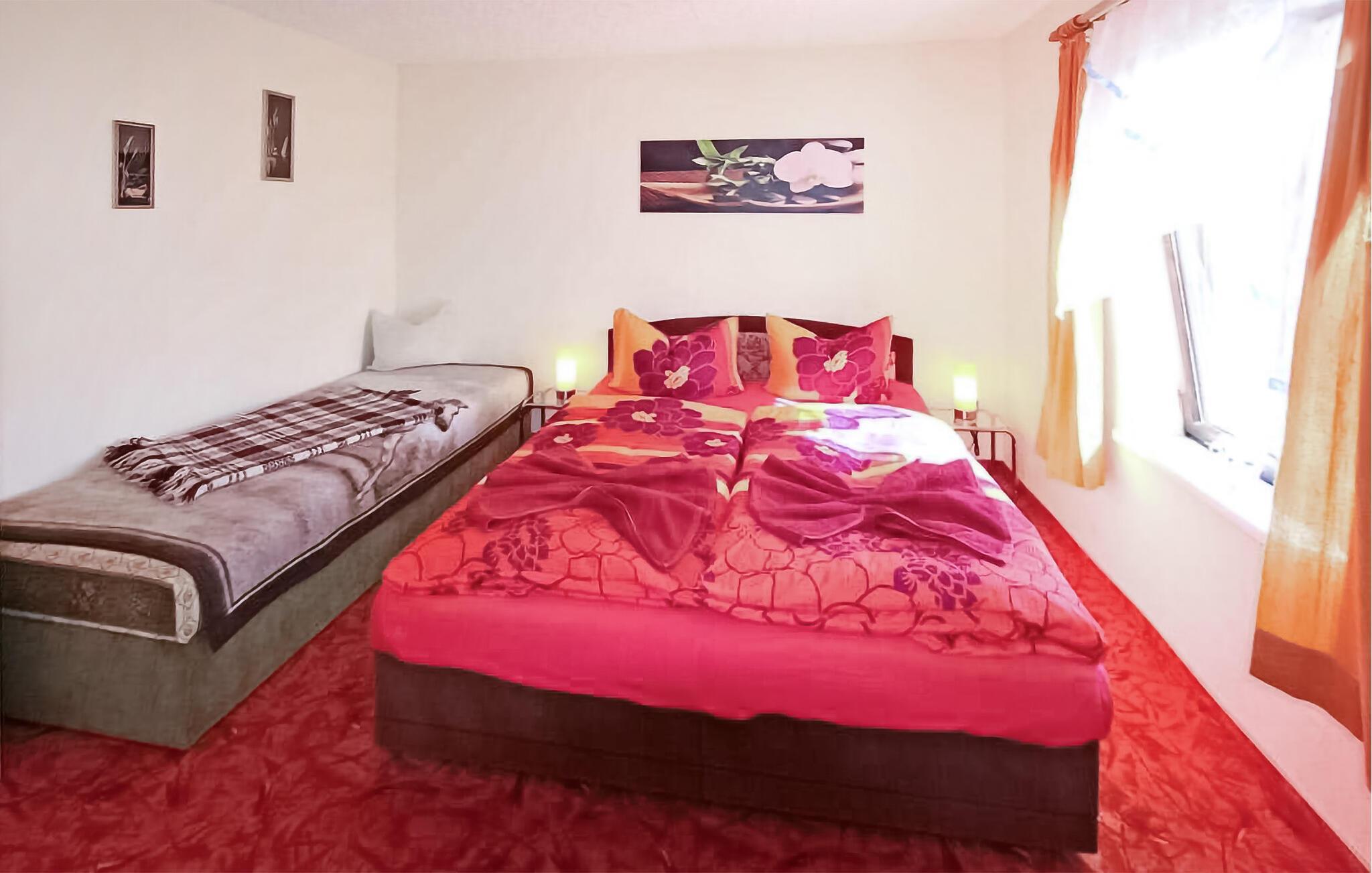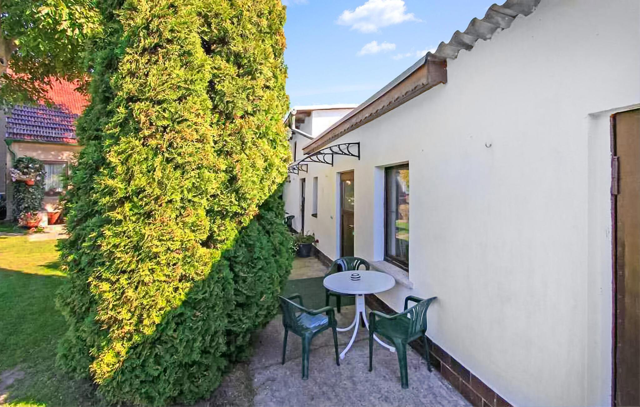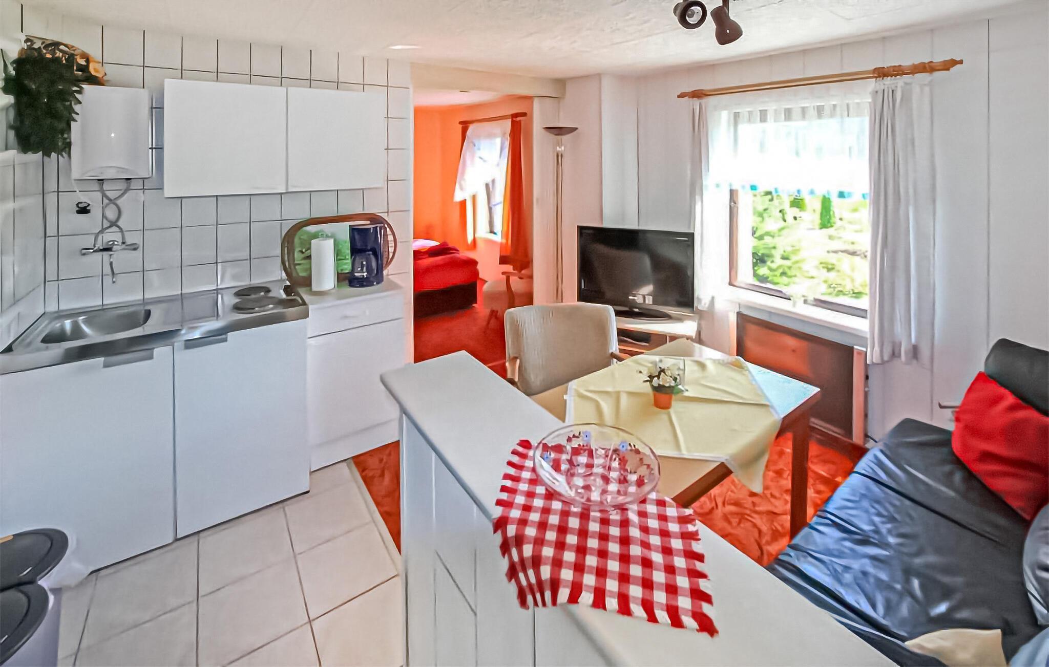 Ferielejligheden er beliggende i et separat udhus på ejerens grund i et roligt udkantsområde. Stranden ved Wolgastsee ligger cirka 400 m væk. Lejligheden har en lille stue (siddeeområde, fladskærms-tv og radio) med et tekøkken (med el-komfur, køleskab med fryser, diverse køkkenmaskiner), et soveværelse med en dobbeltseng og en enkeltseng (mulighed for en ekstra børneseng) og et badeværelse med bruser/toilet. Gennemgangen til stuen er lukket med en foldedør. En olieradiator er tilgængelig til kølige dage. Tilgængelig: Internet/WLAN, barneseng, høj stol, siddeplads i det fri, grill, cykelstativ og parkeringsplads. Den samlede pris inkluderer: sengelinned, håndklæder, vandforbrug og slutrengøring. Betales på stedet: strømforbrug. Korswandt er en landsby i et meget smukt, skovklædt landskab ved Wolgaster-søen i den sydøstlige del af øen Usedom. Der er omkring 4 km til Østersøstranden i badebyen Ahlbeck. Wolgastsee er en smuk bade- og fiskesø. Der er en badestrand med en legeplads og en bådudlejning med restaurant og café. Der er mulighed for ture med hestevogn 3 km væk.