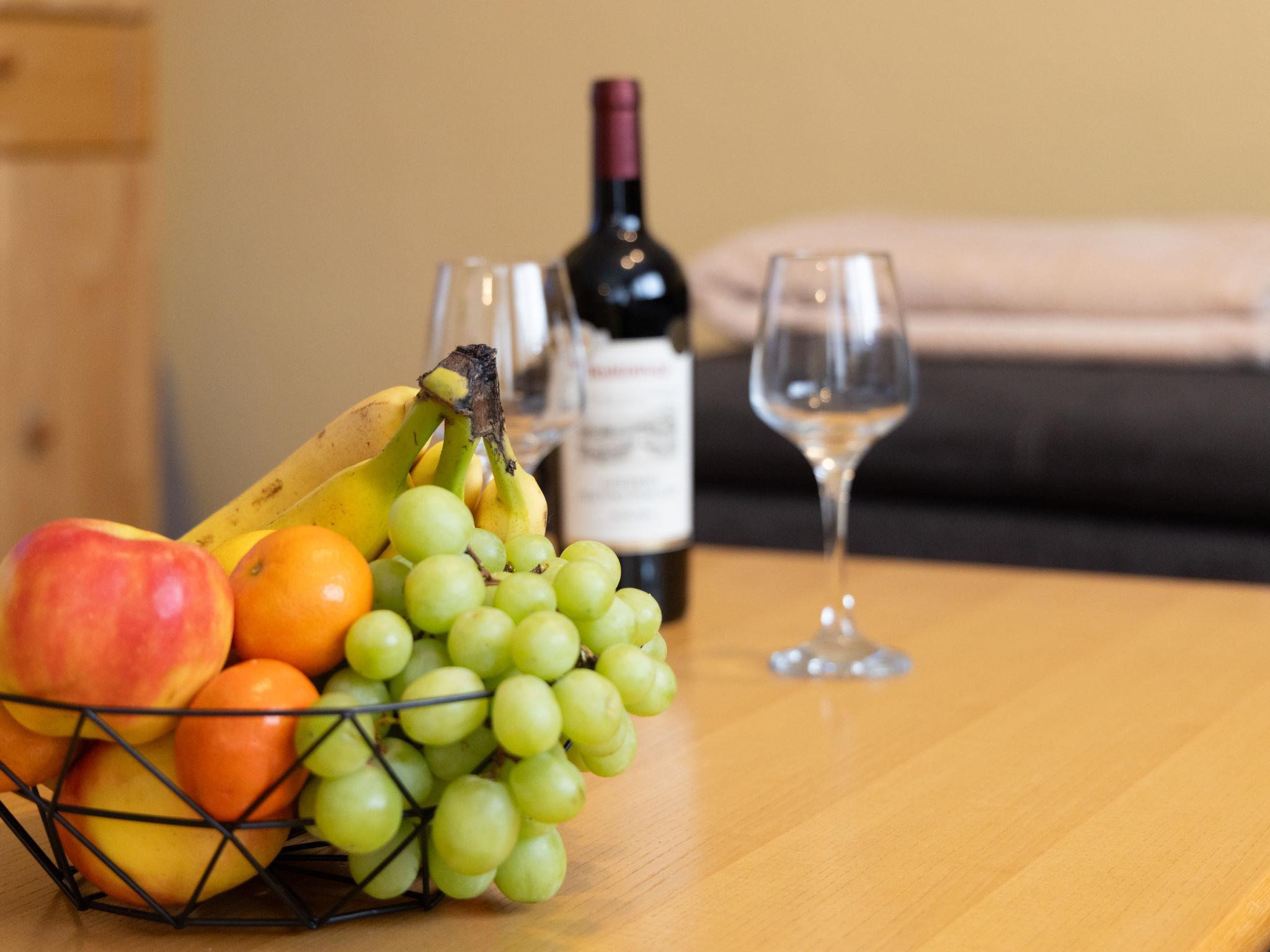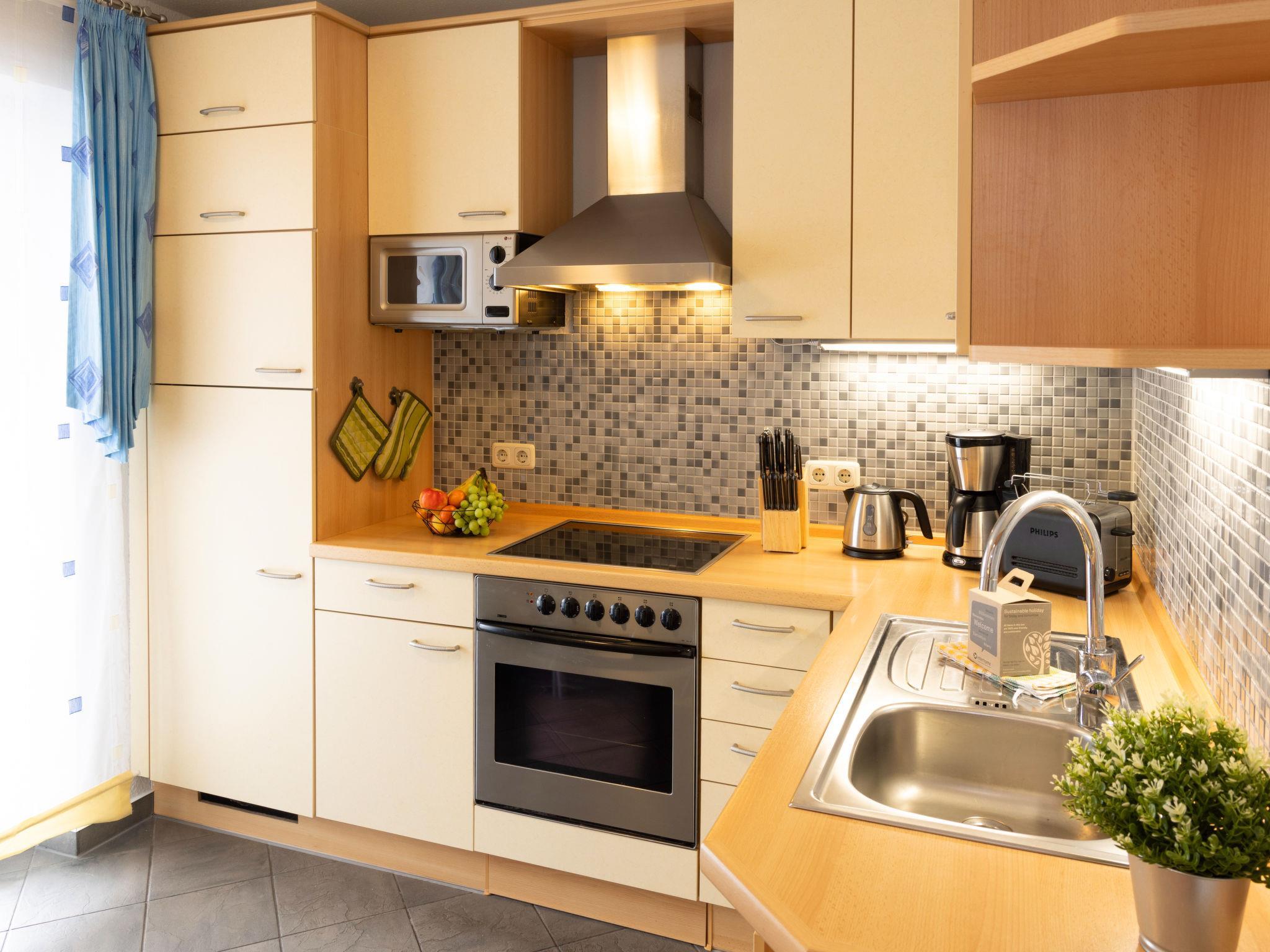 "Ritter", 2-room apartment 75 m2, on the ground floor. Cosy furnishings: living/dining room with 1 double sofabed and cable TV (flat screen), radio. Exit to the terrace. 1 room with 1 double bed (200 cm, length 200 cm). Kitchen (oven, dishwasher, 4 induction hot plates, toaster, kettle, microwave, electric coffee machine). Bath/shower/WC, double hand-basin, Sauna. Terrace. Terrace furniture. Facilities: children's high chair, baby cot. Internet (WiFi, free). Please note: non-smokers only. Smoke alarm.