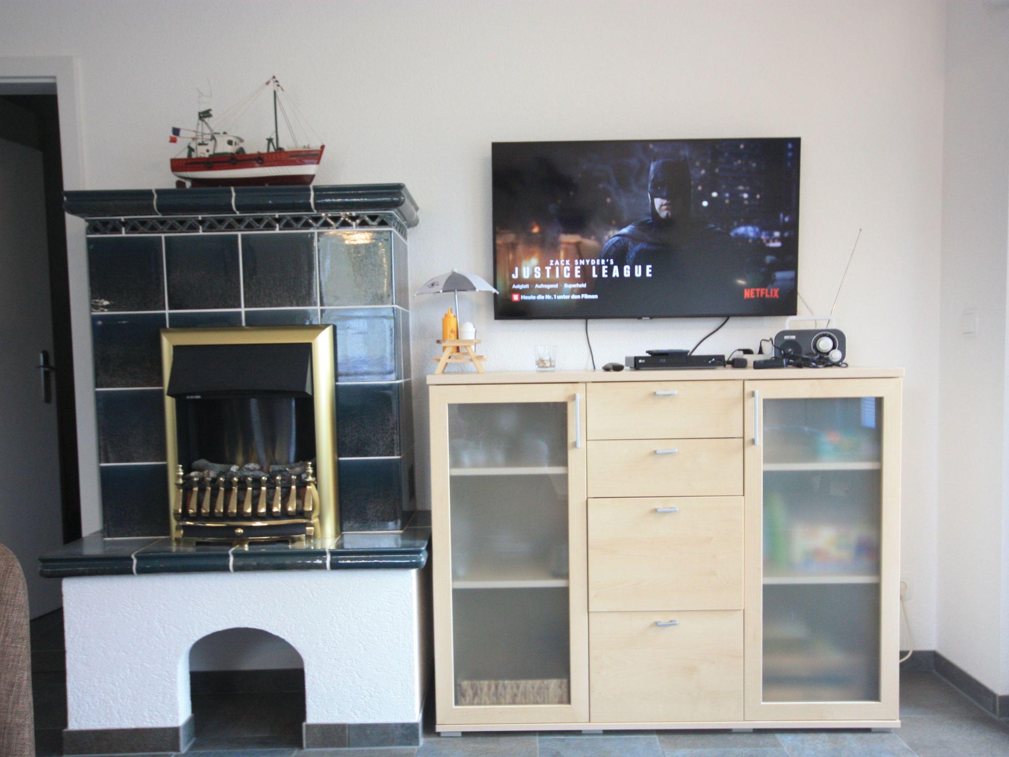 1 living room with SAT-TV, radio, 80cm Smart-TV, electric tiled stove fireplace, partly Blue-Ray-Player