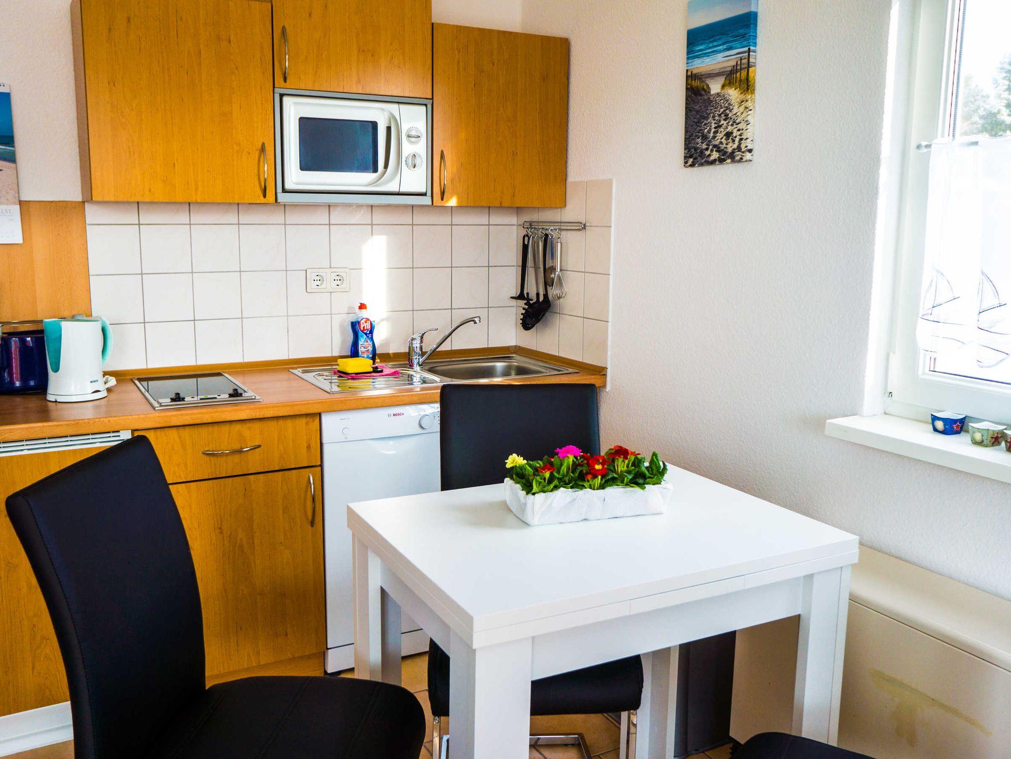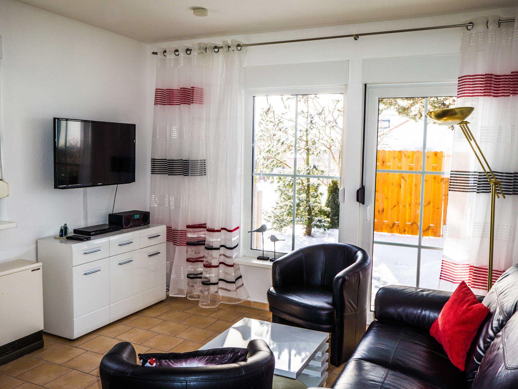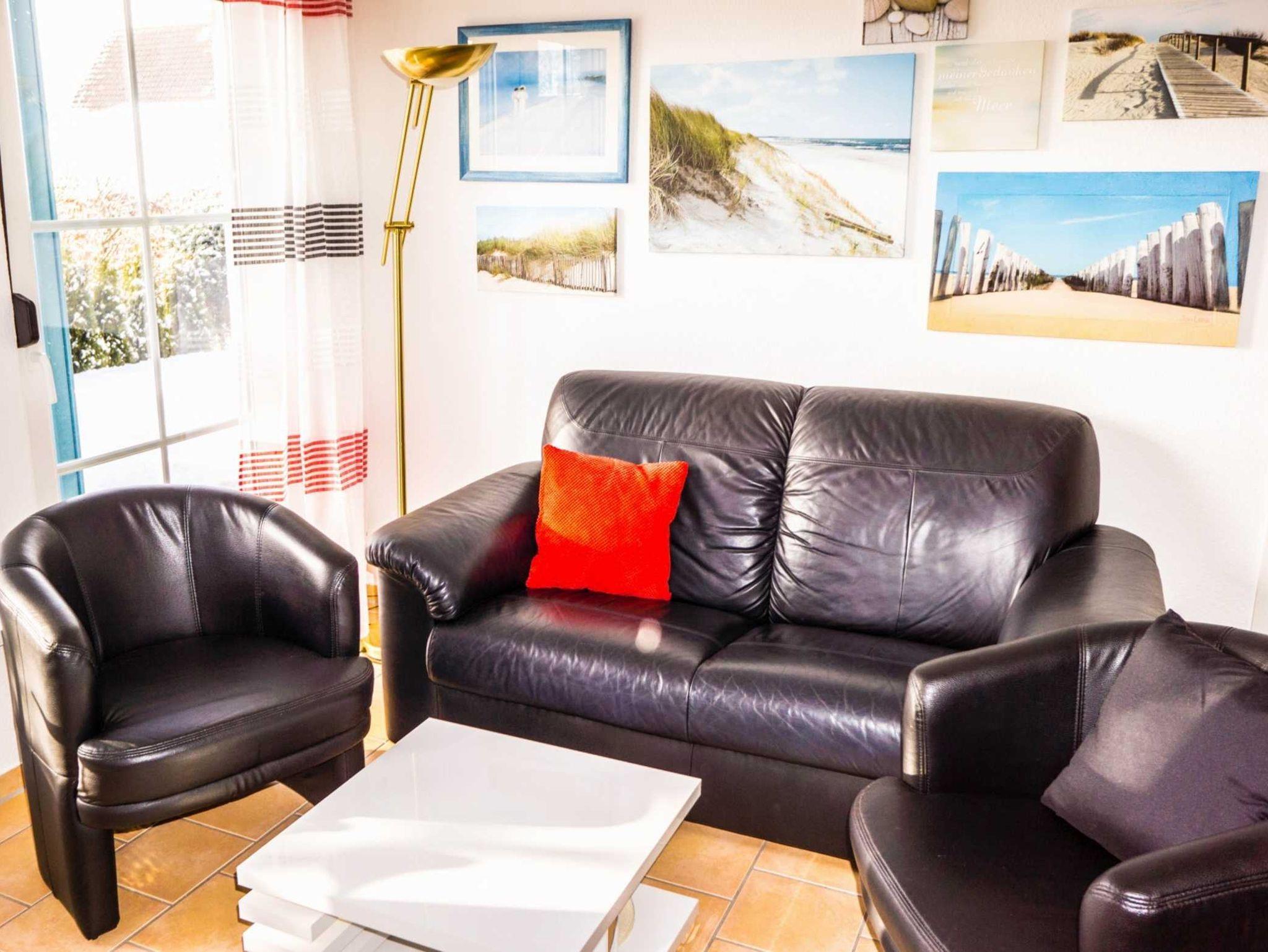 Schöne 3-Zimmer Ferienwohnung in einer freundlich angelegten Ferienanlage. Die Ferienwohnung ist im Wohnbereich ausgestattet mit einer gemütlichen Couch und einer offenen Küche mit Essbereich.