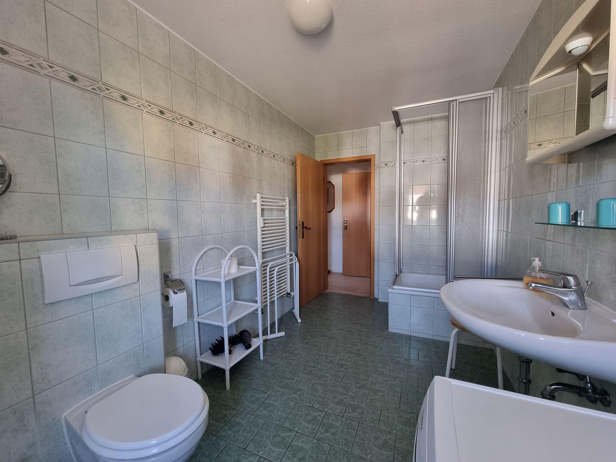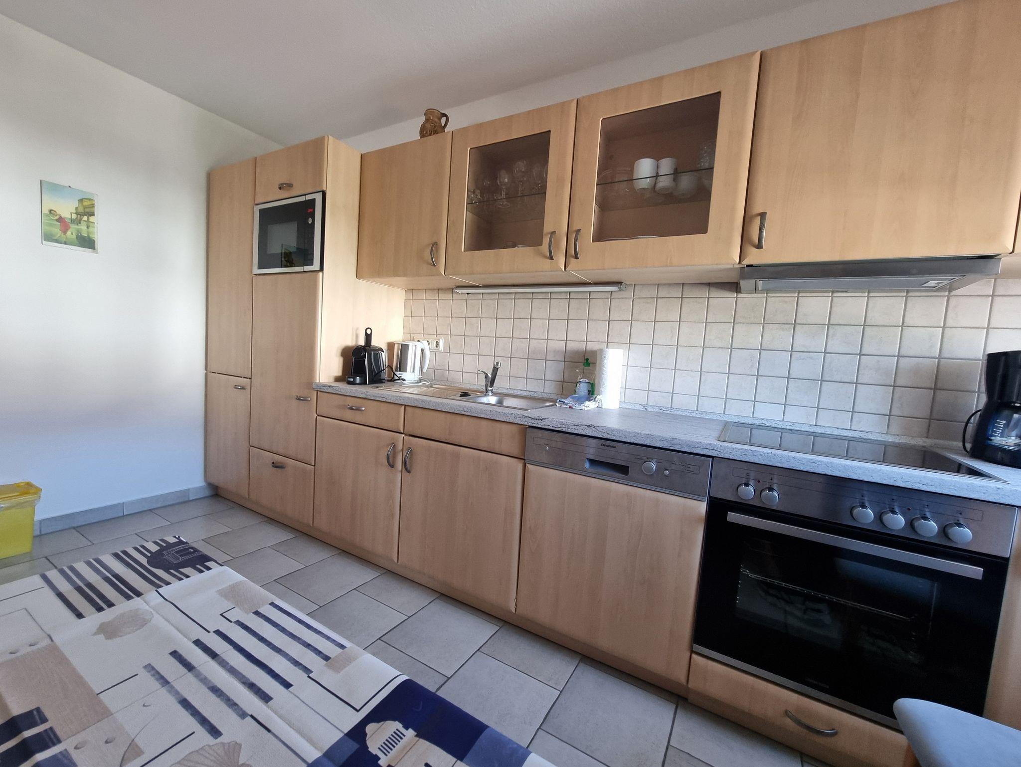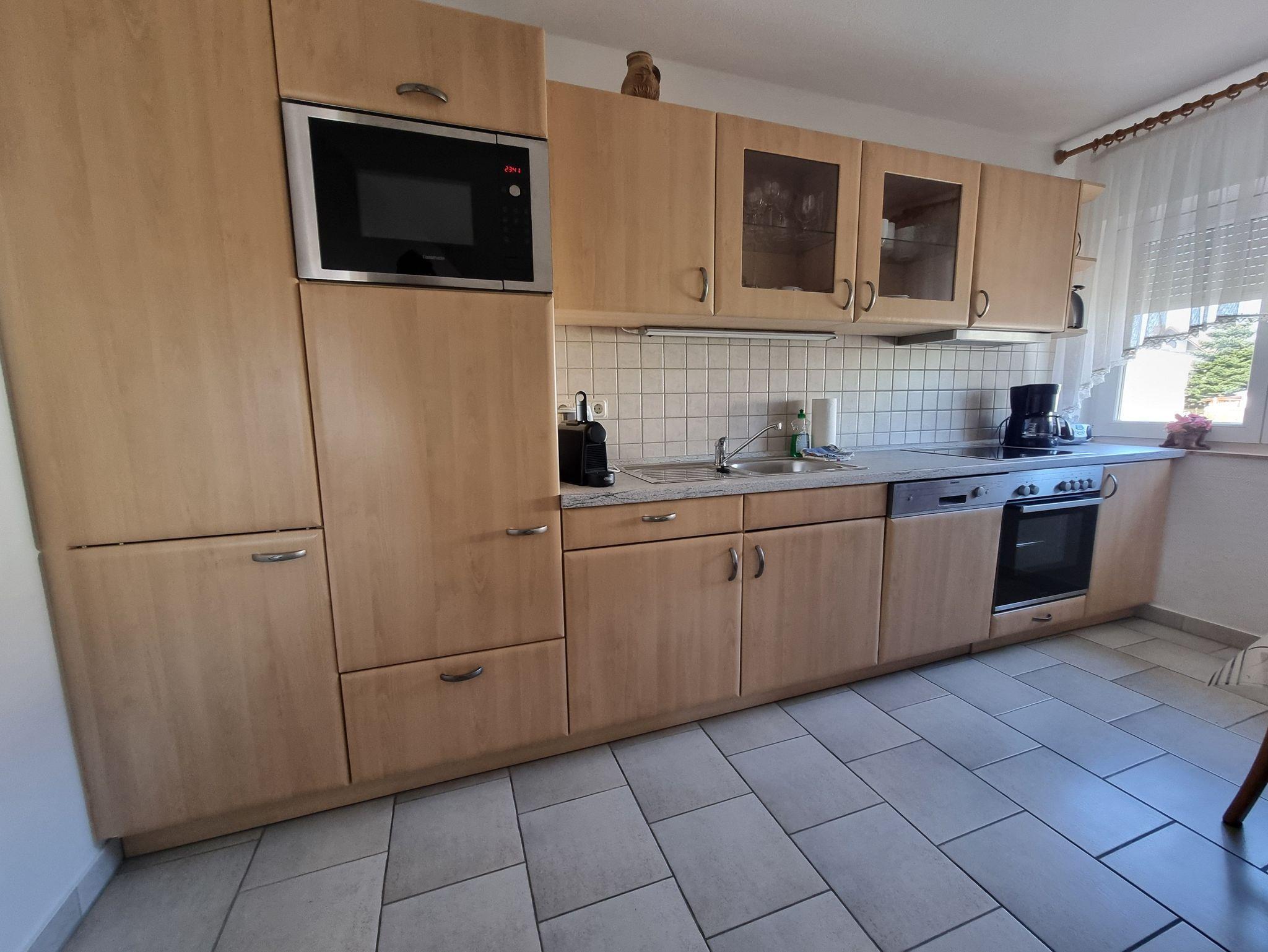 Die komplett ausgestattete Küchenzeile fügt sich harmonisch in den Wohnbereich ein und bietet alles für die tägliche Selbstversorgung. Ein modernes Tageslichtbad sowie eine Waschmaschine sorgen für zusätzlichen Komfort. Im Flur steht eine Garderobe zur Verfügung.