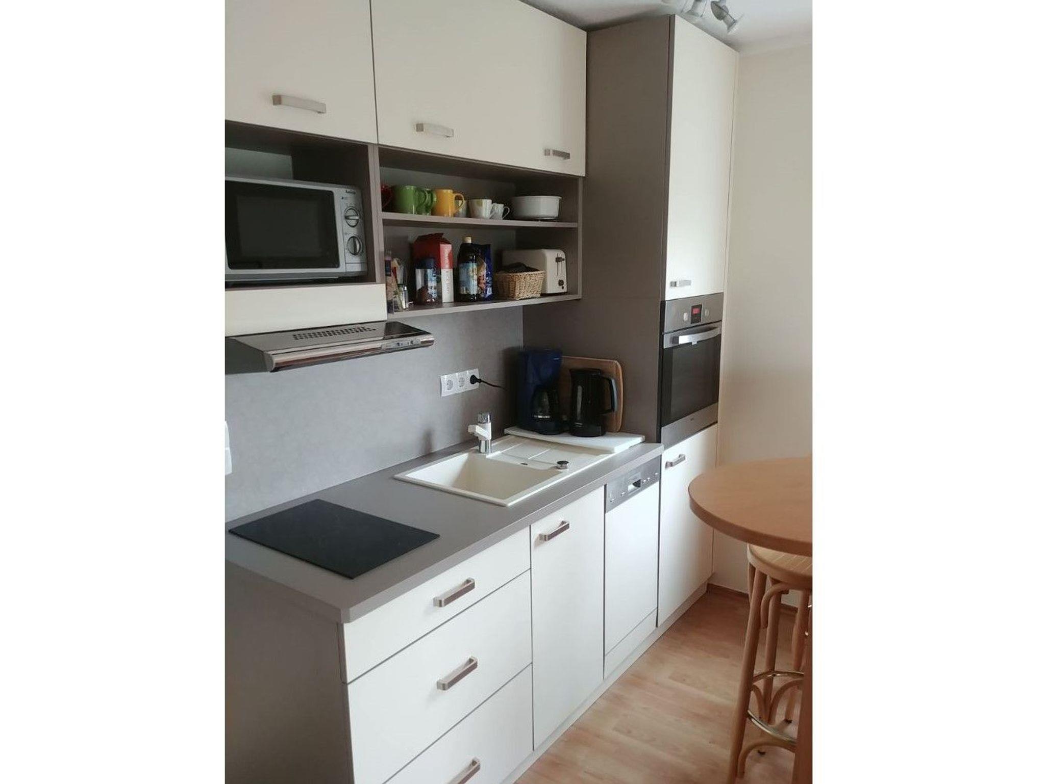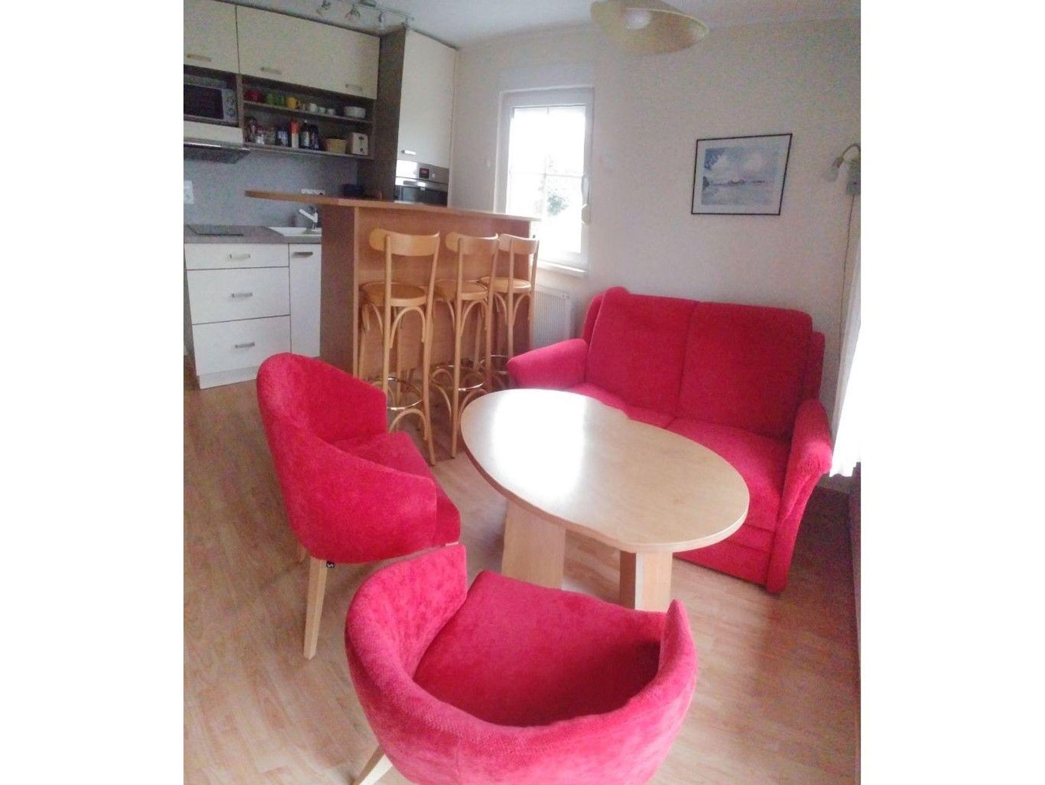 3-Zimmer Ferienwohnung im Erdgeschoss einer liebevoll angelegten Ferienanlage. Die Ferienwohnung ist im Wohnbereich ausgestattet mit einer gemütlichen Couch und einer offenen Küche mit Essbereich.