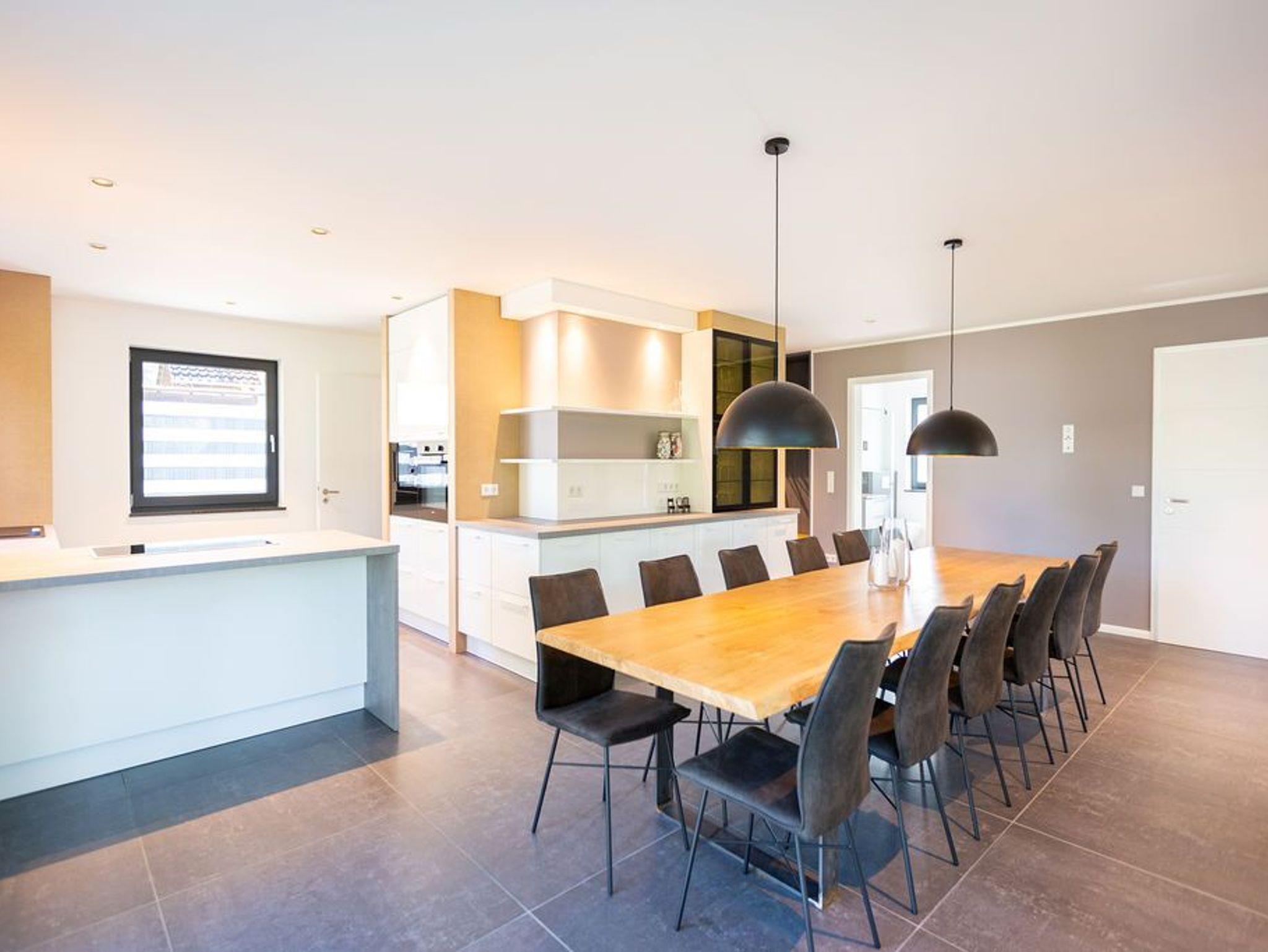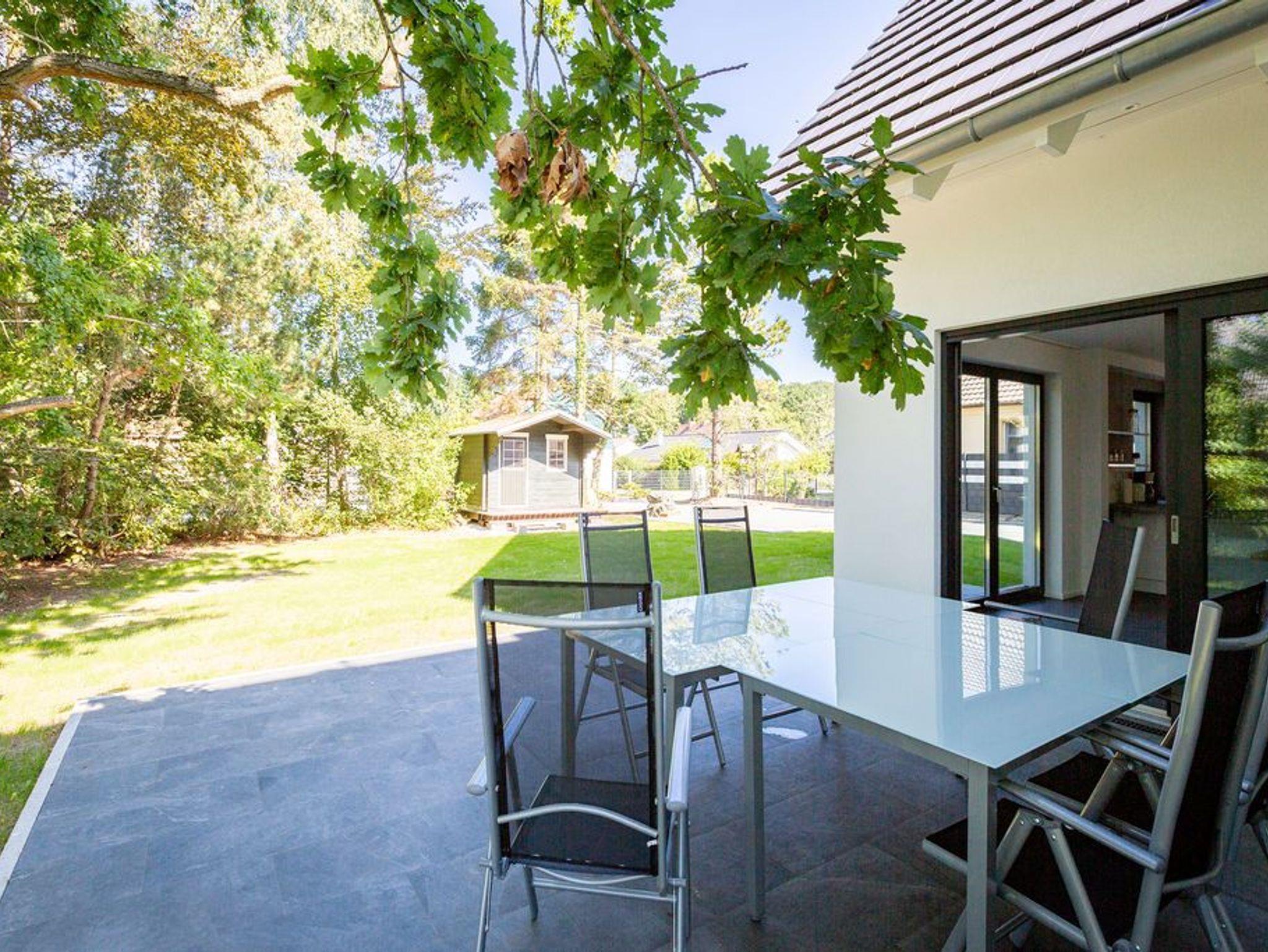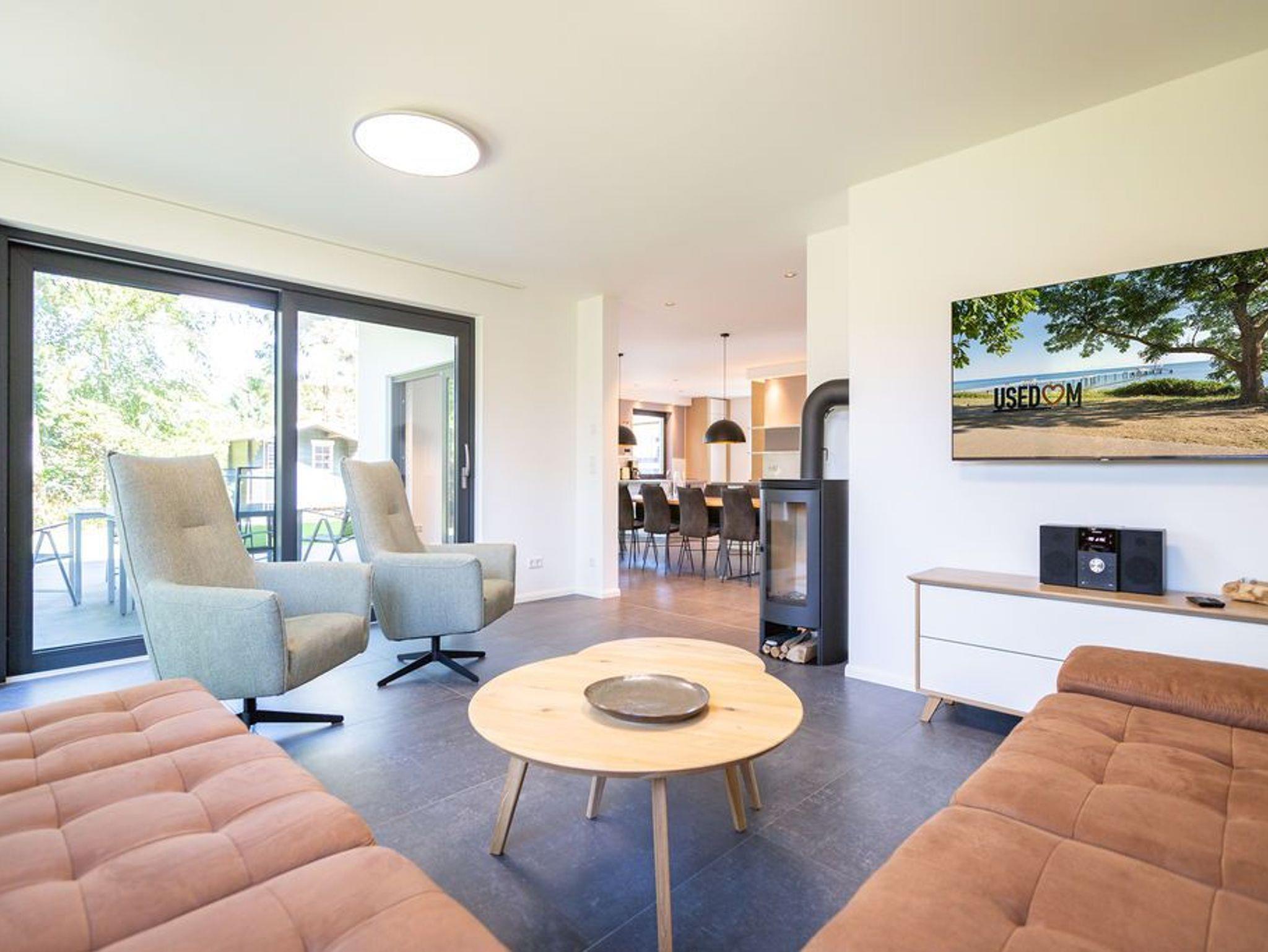 Gestalten Sie Ihren Urlaub ganz nach Ihren Wünschen in diesem großzügigen Feriendomizil. Auf insgesamt 224qm und drei Ebenen bietet das Ferienhaus ab Juni 2024 sogar Platz für bis zu 12 Personen und 2 Kleinkinder (bis 2 Jahre im Kinderreisebett). Ob Großfamilie oder Firmenevent - genießen Sie modernen Wohnkomfort und die Exklusivität Usedoms Steilküste in Ihrer direkten Umgebung zu haben (Entfernung 295m). Die ruhige Lage des Einfamilienhauses trägt darüber hinaus zu Entspannung und Erholung in Ihrem Urlaub bei. Im Erdgeschoss befindet sich der offene Wohnbereich mit großzügiger Wohnlandschaft und Design-Sesseln. Ein Kamin und ein 55 Zoll Flat-TV sorgen für entsprechende Gemütlichkeit an Ihren Urlaubsabenden. Der angrenzende Essbereich ist mit einem 3,60m langen Esstisch mit massiver Eichenplatte ausgestattet. Hier finden bis zu 12 Personen ausreichend Platz für gemeinsame Urlaubsstunden. Die modern und voll ausgestattete Küche mit Markengeräten (Backofen, Ceranfeld, Mikrowelle, Spülmaschine, Kühlschrank mit Gefrierfach, Mixer und Kleinküchengeräte) lässt keine Wünsche beim Zubereiten Ihrer Speisen offen. Von hier aus sowie über das Wohnzimmer gelangen Sie auf die 35qm große Terrasse mit ausreichend Sitzmöglichkeiten für Sie und Ihre Begleitpersonen. Ebenfalls zugehörig zum Erdgeschoss ist neben einem Hauswirtschaftsraum (ausgestattet mit einem Waschtrockner) ein Badezimmer mit WC und Finnischer Sauna (geeignet für 4-5 Personen) sowie ein separates Gäste-WC und ein Schlafzimmer mit Boxspringbett (1,80m x 2,00m). Im ersten Obergeschoss befinden sich 5 weitere Schlafzimmer, die alle mit komfortablen Boxspringbetten (1,80m x 2,00m), Schrank, elektrische Rolläden und Flat-TV ausgestattet sind. Auch zwei weitere Badezimmer mit Dusche, WC und Waschtisch gehören zum Komfort dieser Etage. Ein weiteres Wohnzimmer mit Sitzlandschaft und 55 Zoll Flat-TV bietet zudem die Möglichkeit sich in dieser Etage zurückzuziehen. Unter dem Dach (in der zweiten Etage) verbirgt sich ein weiteres Zimmer, dass sich als Spielzimmer eignet. Große Dachfenster und Dachschrägen sorgen hier für besondere Gemütlichkeit. Ein Highlight dieses Ferienhauses ist der 940qm große Garten. Neben einem Grill befindet sich auch ein abschließbares Gartenhaus auf dem Grundstück, dass Abstellmöglichkeiten für Fahrräder, Bollerwagen oder Kinderwagen bietet. Kostenfreies W-Lan, drei Safes und insgesamt drei PKW-Stellplätze direkt am Grundstück runden Ihren perfekten Urlaub in diesem Ferienhaus ab.