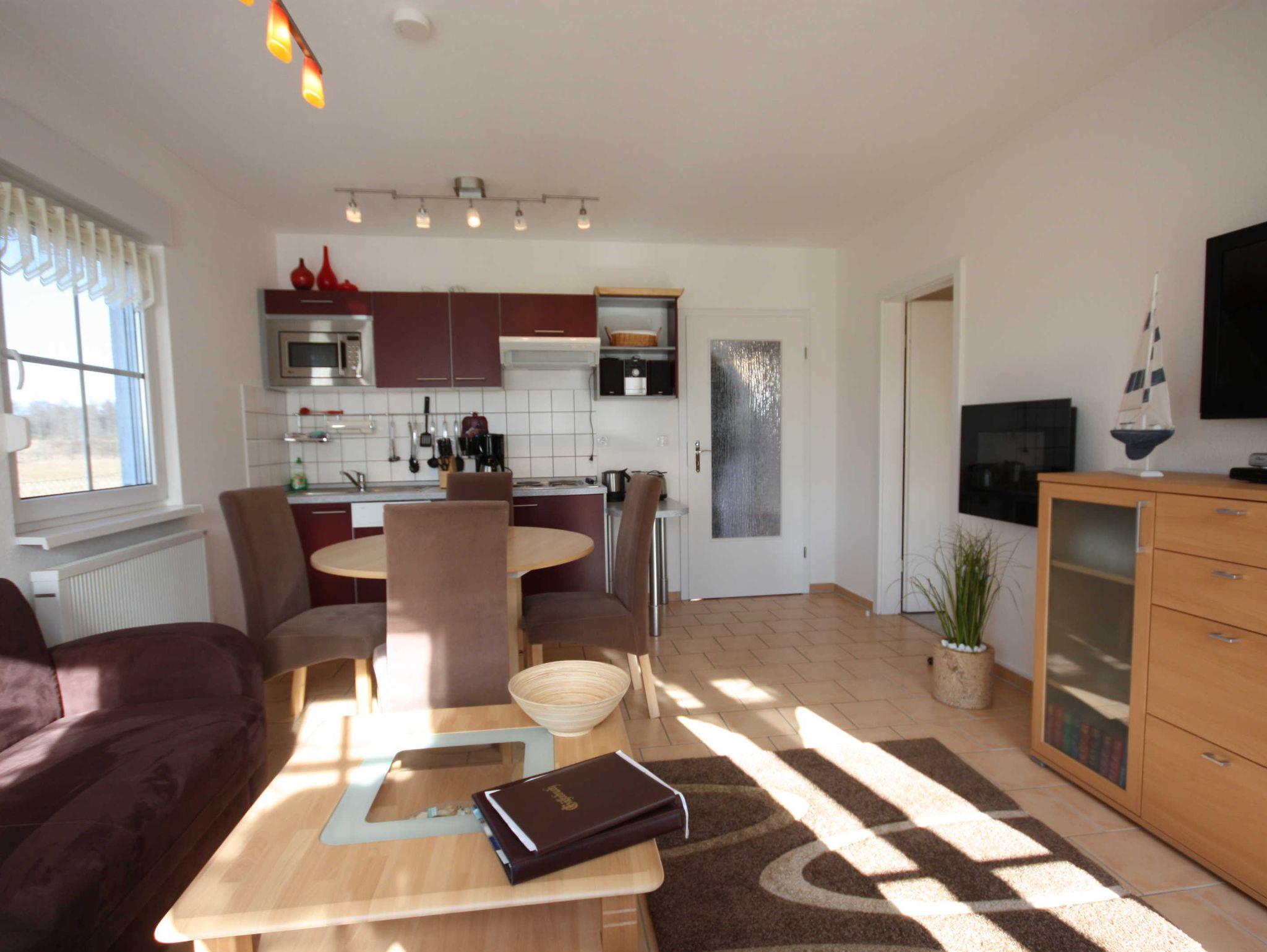 Die Ferienwohnung liegt im Erdgeschoß des Ferienhauses. Sie besteht aus Wohnzimmer, kompl. ausgestatteter Küche, Schlafzimmer und Tageslichtbad mit Waschmaschine. Die Ausstattung der bordeauxfarbenen Einbauküche ist funktional und qualitativ hochwertig unter anderem mit Toaster, Kaffeemaschine, Mikrowelle mit Grill, 4-fach Kochfeld, Geschirrspüler, Gefrierfach. Von der großen Süd-Terrasse und aus dem Küchenfenster hat man einen fantastischen Blick auf die Wiesen Richtung Achterwasser. Sie verfügt über einen kleinen Elektroedelstahleffektkamin.
