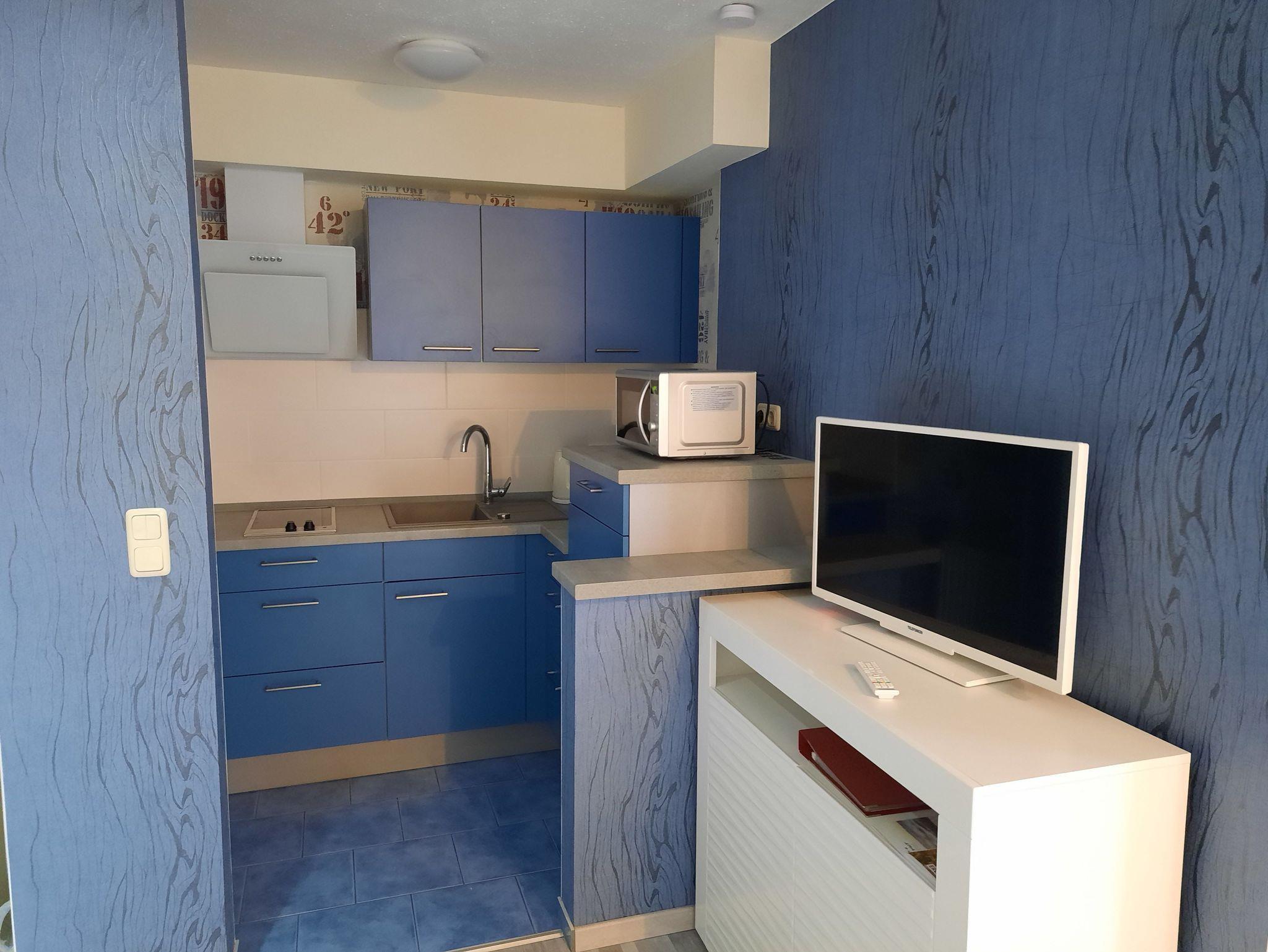 Im „Mignon petit“ erwartet Sie im Erdgeschoss ein komfortables Apartment für 2 Personen mit Couch, TV, Miniküche und Essecke, sowie Bad mit Dusche und WC (ca. 32 qm). Außerdem befindet sich vor dem Apartment eine Sitzecke, wo es sich zum Beispiel herrlich in der Sonne Frühstücken lässt.
