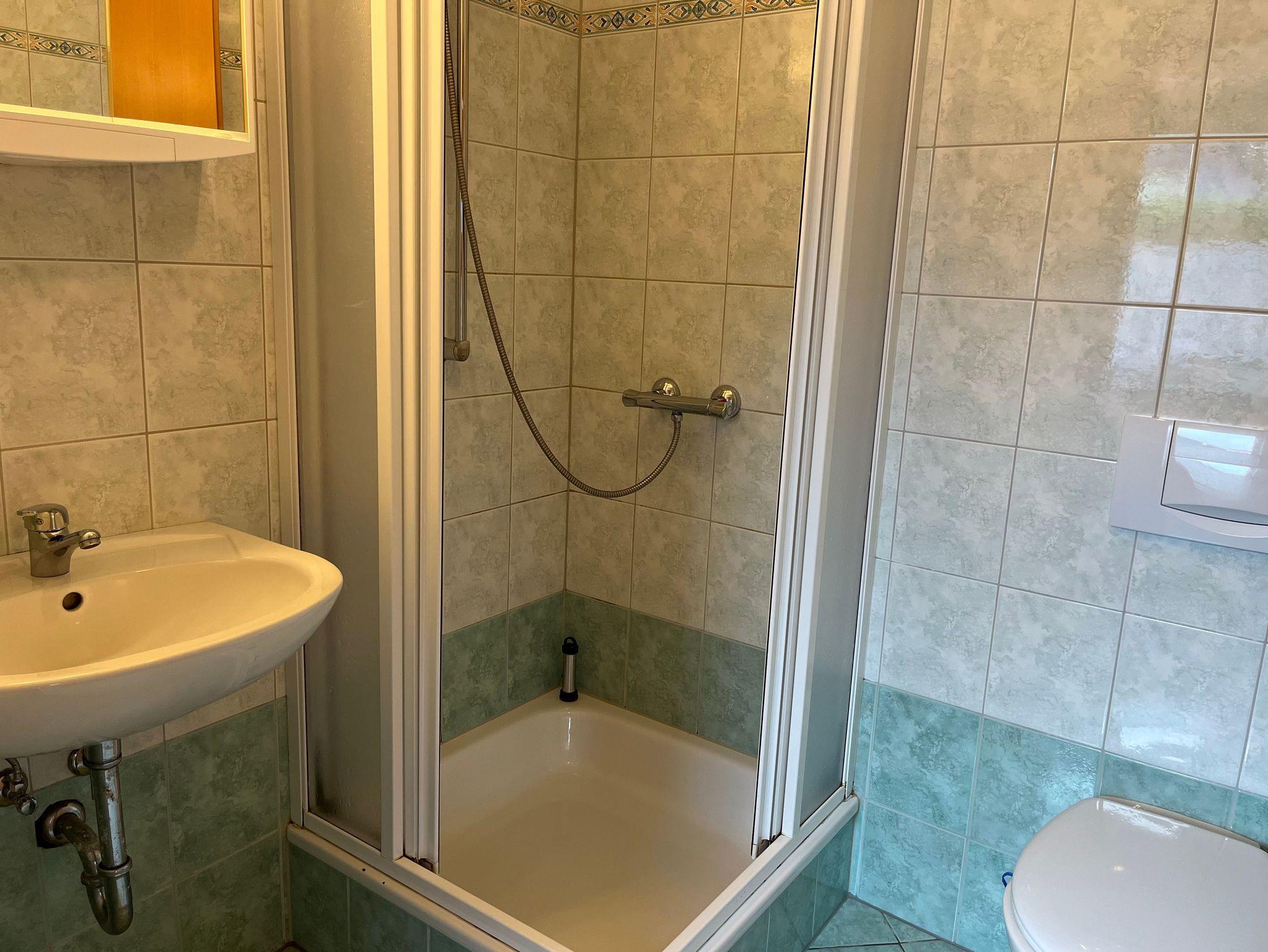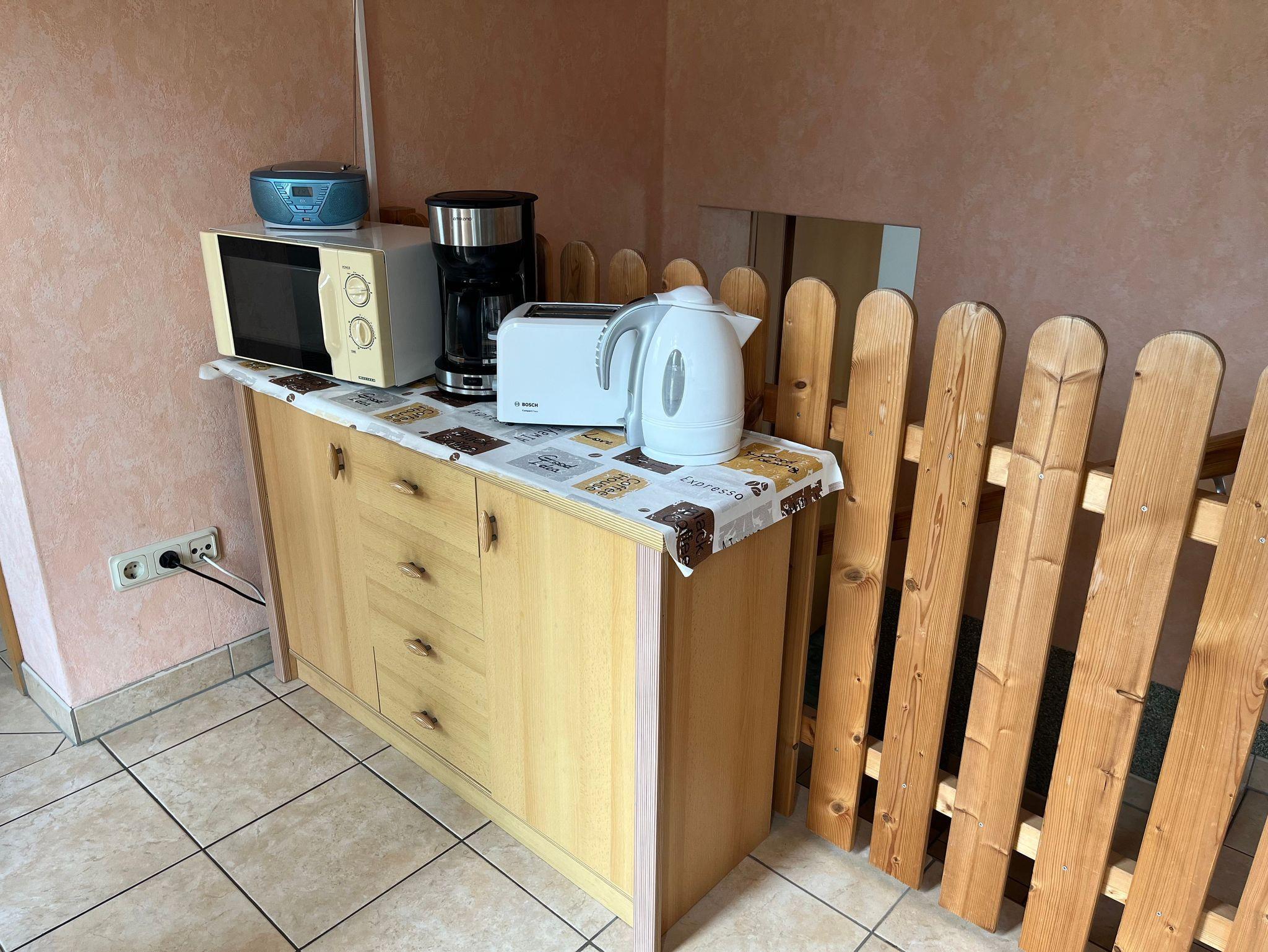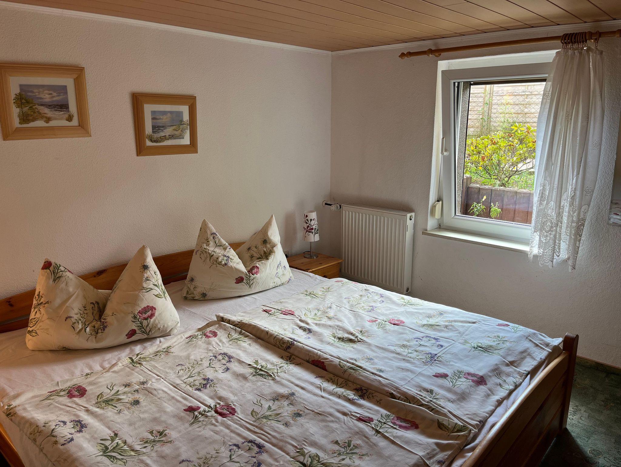 2-Raum-Ferienwohnung im Erdgeschoß, einfach und zweckmäig eingerichtet. Wohnzimmer mit kleine Kochnische mit 2-Plattenherd, Kühlschrank, Mikrowelle, Toaster, Wasserkocher und Kaffeemaschine. 1 Schlafzimmer im Souterrain mit Doppelbett. Bad mit Dusche und WC. Terrasse direkt an der Wohnung mit Gartenmöbel.