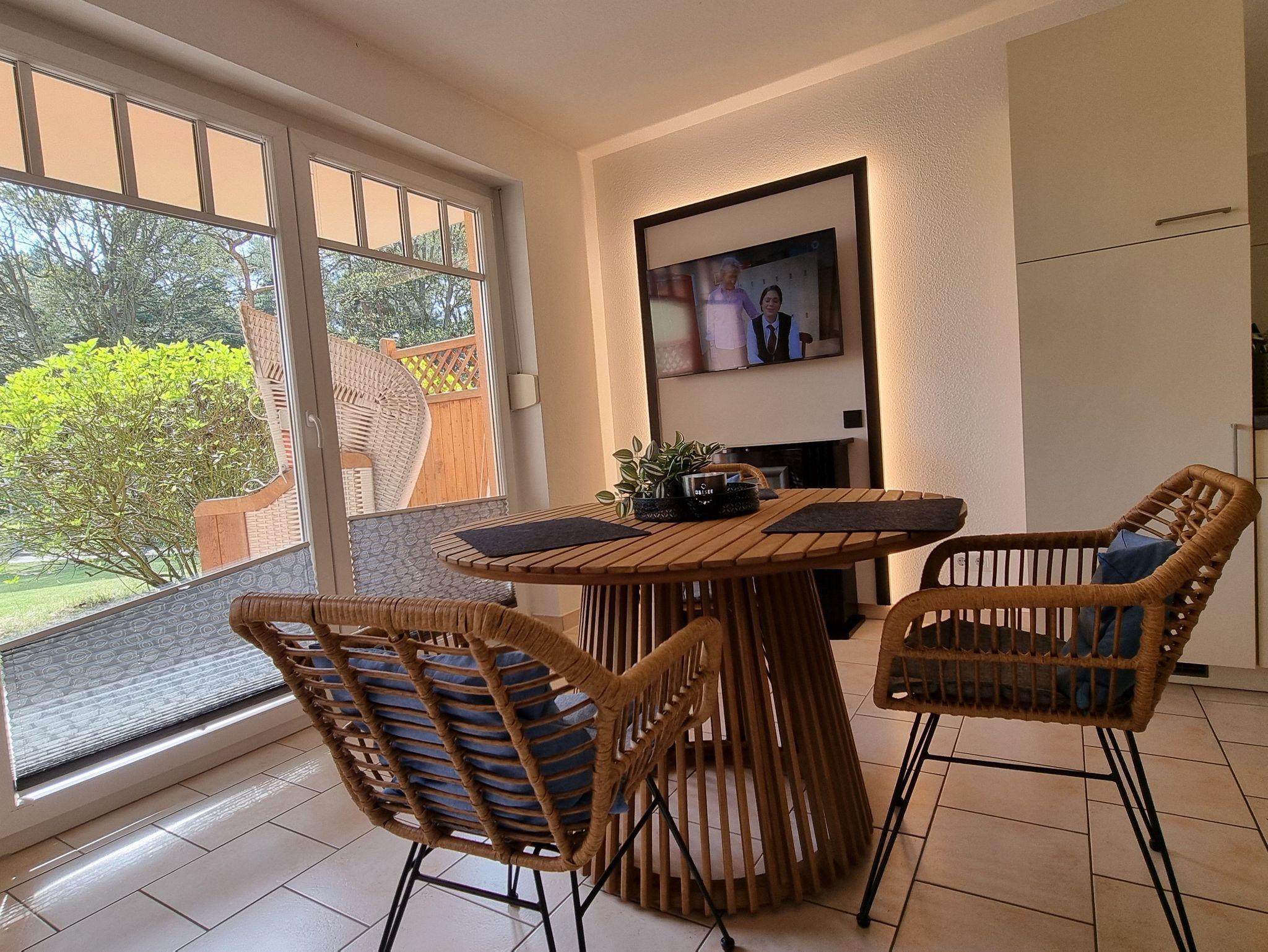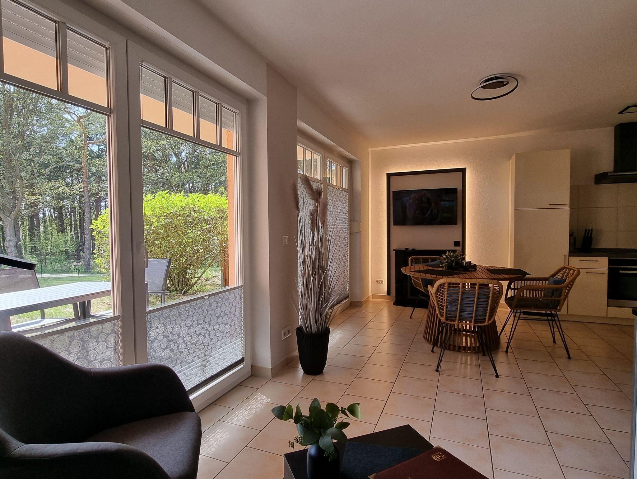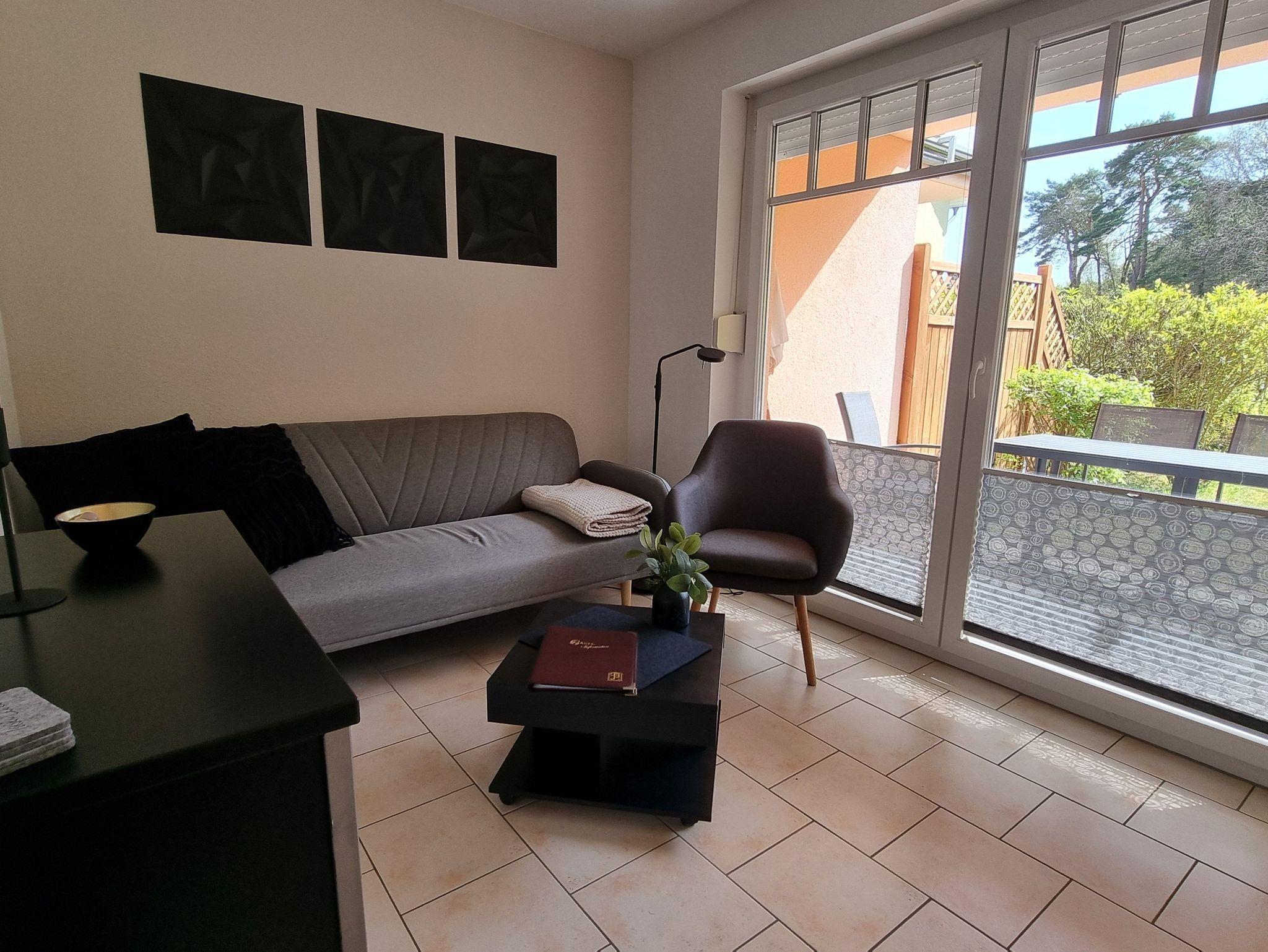 Die Ferienwohnung liegt im Erdgeschoß des Ferienhauses. Sie besteht aus Wohnzimmer, kompl. ausgestatteter Küche, Schlafzimmer und Tageslichtbad. Die Ausstattung der Einbauküche ist neuwertig funktional und qualitativ hochwertig unter anderem mit Toaster, Kaffeemaschine, Backofen, Kochfeld, Geschirrspüler, Gefrierfach. Große Süd-Terrasse mit Blick auf den Küstenwald, große Spielwiese.