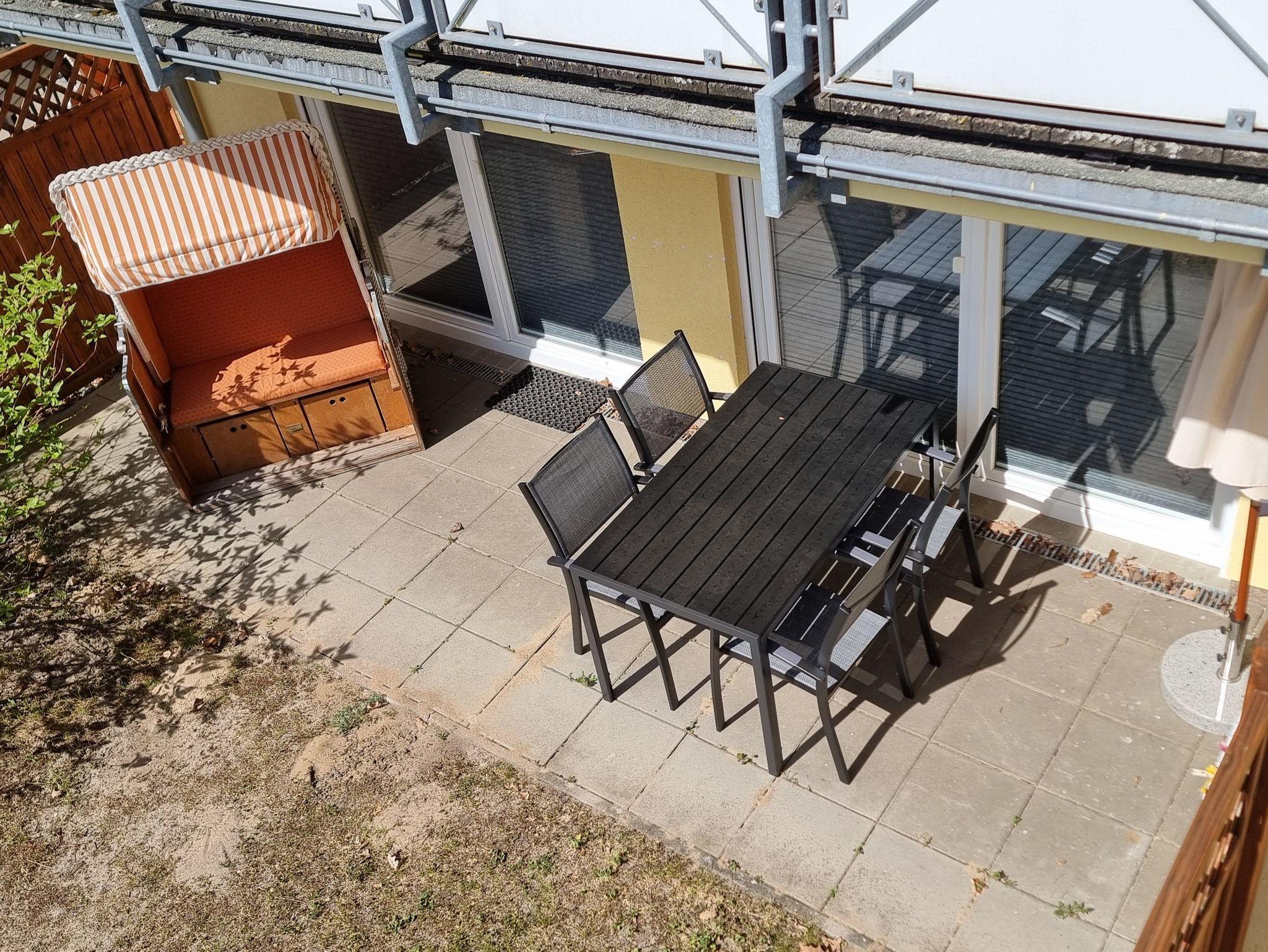 • Südterrasse mit Tisch, Stuhl, Sonnenschirm, Strandkorb
