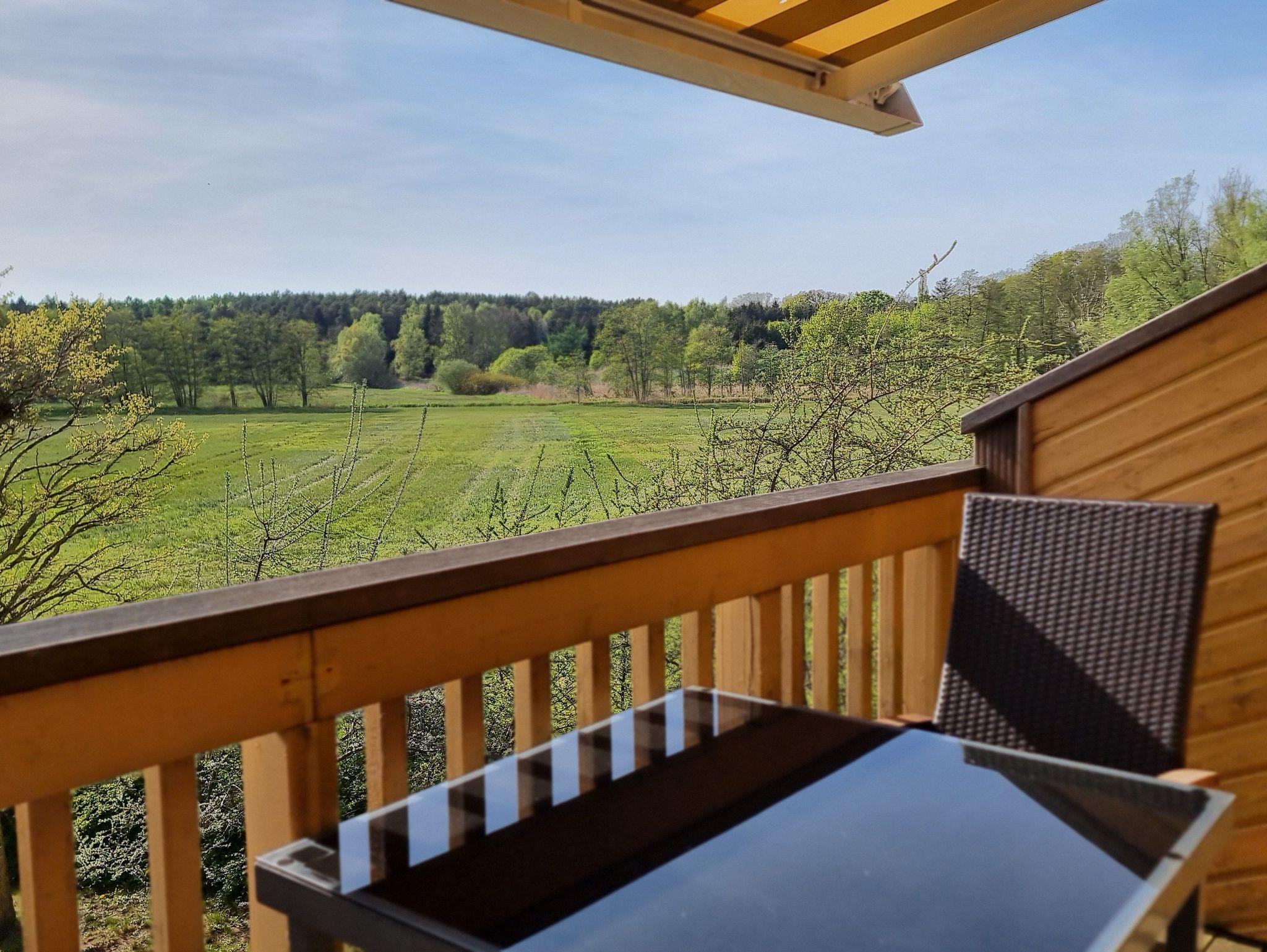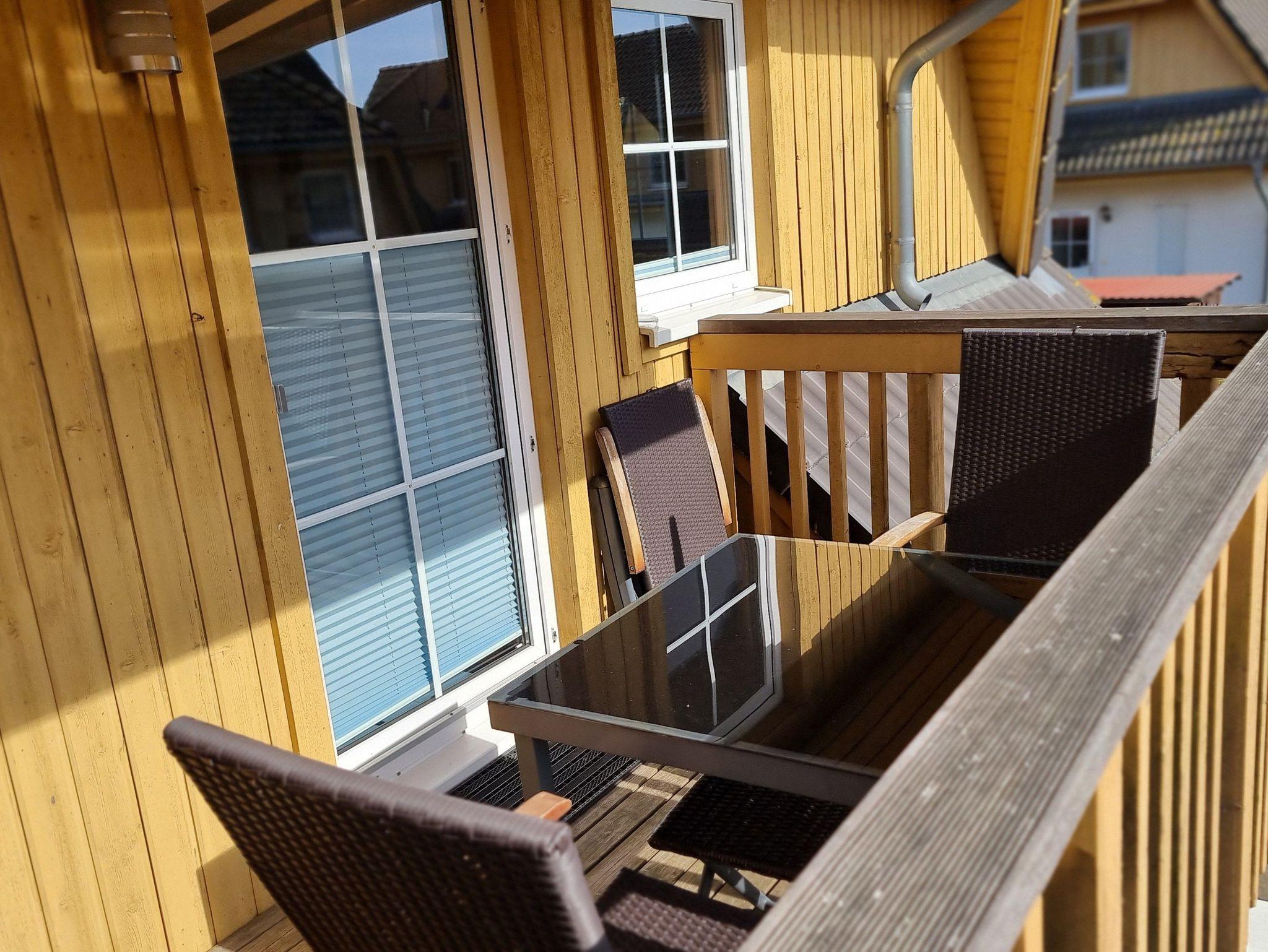 • Süd/Süd-west Balkon mit Holzmöbeln und unverbautem Blick ins Grüne