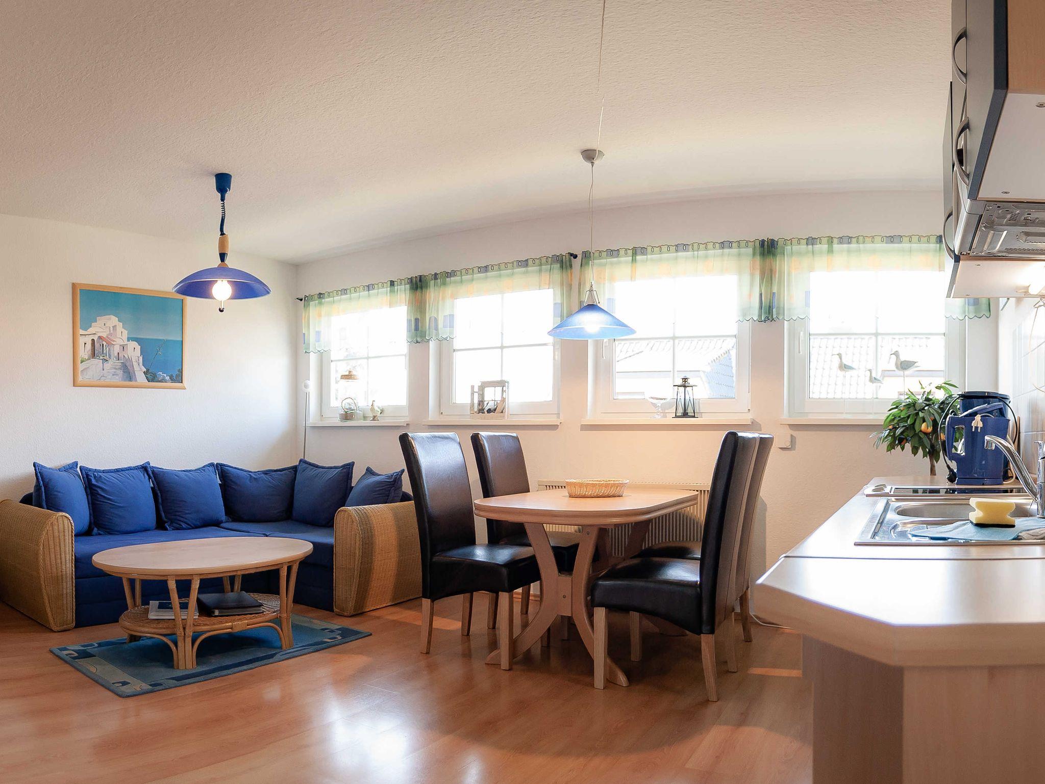 Die Ferienwohnung verfügt über ein Wohnzimmer mit offenem Küchen- und Essbereich, zwei separate Schlafzimmer und ein Duschbad.