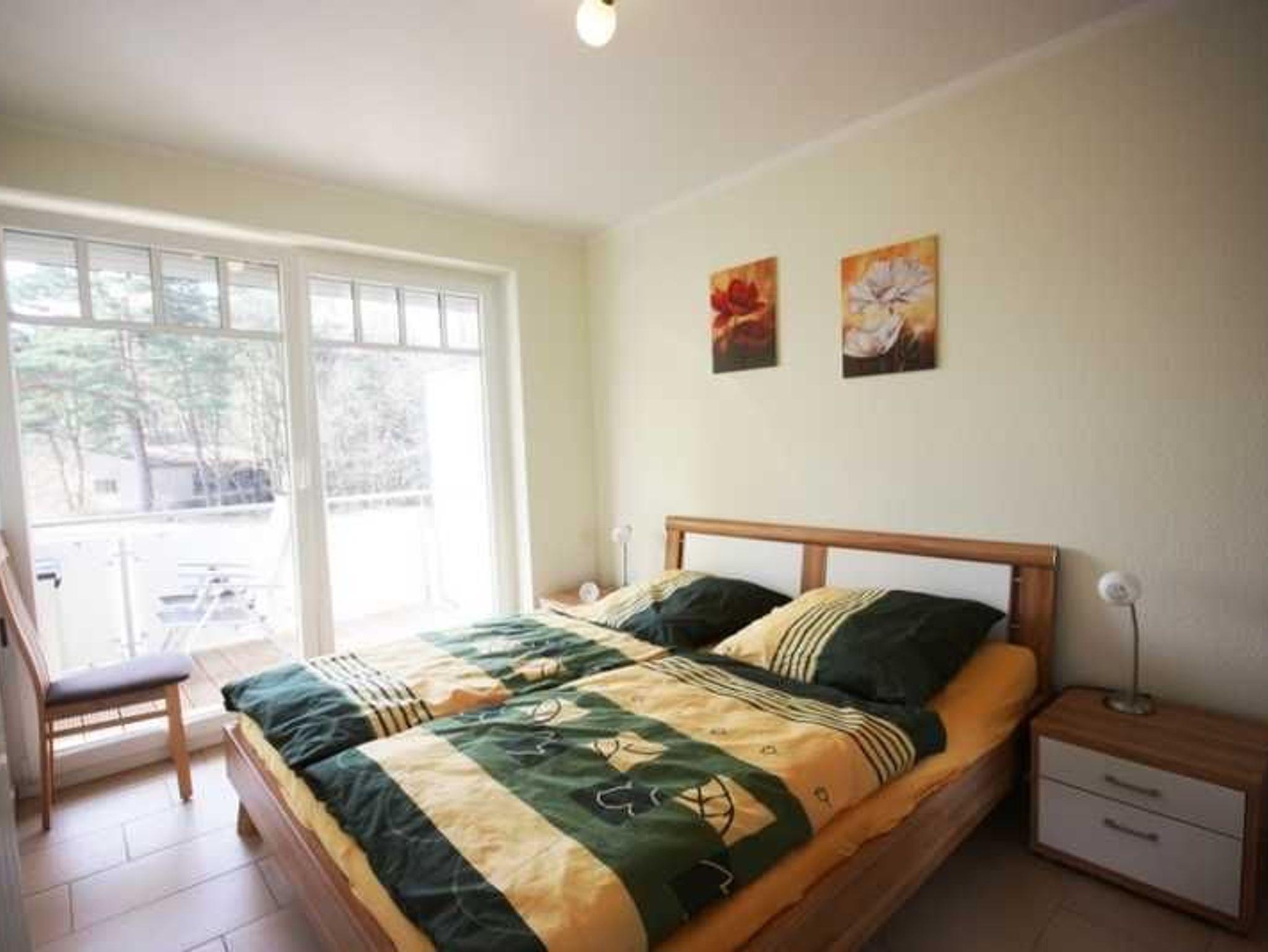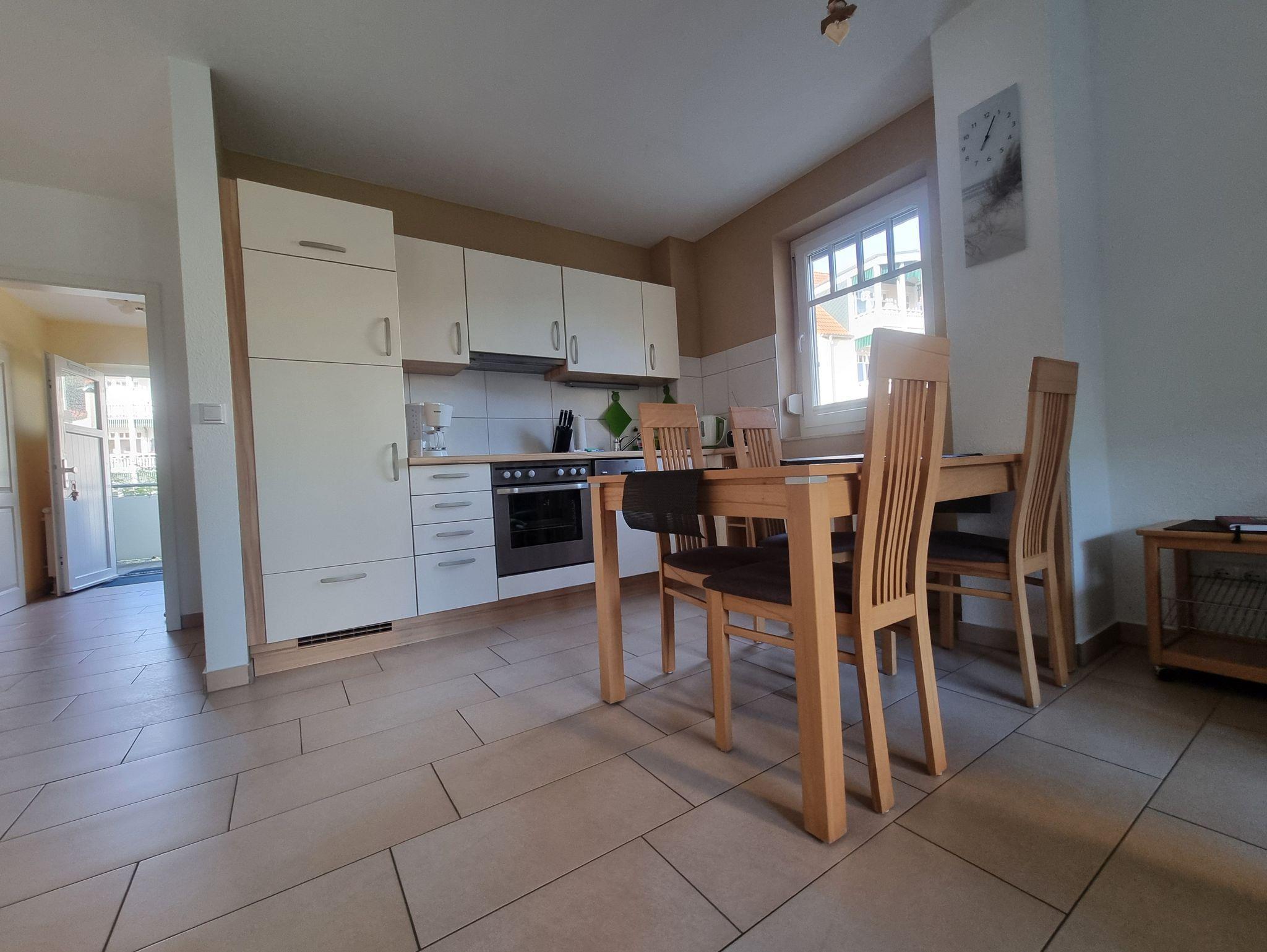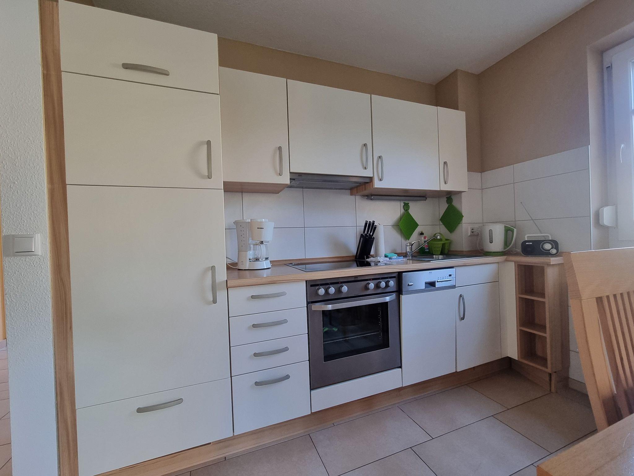 Die Wohnung verfügt über ein Schlafzimmer mit Doppelbett und ein Schlafzimmer mit 2 Einzelbetten. Die Ferienwohnung liegt im 1. Geschoß des Ferienhauses. Sie besteht aus Wohnzimmer, kompl. ausgestatteter Küche, Schlafzimmer und Tageslichtbad. Die Ausstattung der Einbauküche ist neuwertig funktional und qualitativ hochwertig unter anderem mit Toaster, Kaffeemaschine, Backofen mit Heißluft, Kochfeld, Geschirrspüler, Gefrierfach. Großer Südbalkon mit Blick auf den Küstenwald, große Spielwiese.
