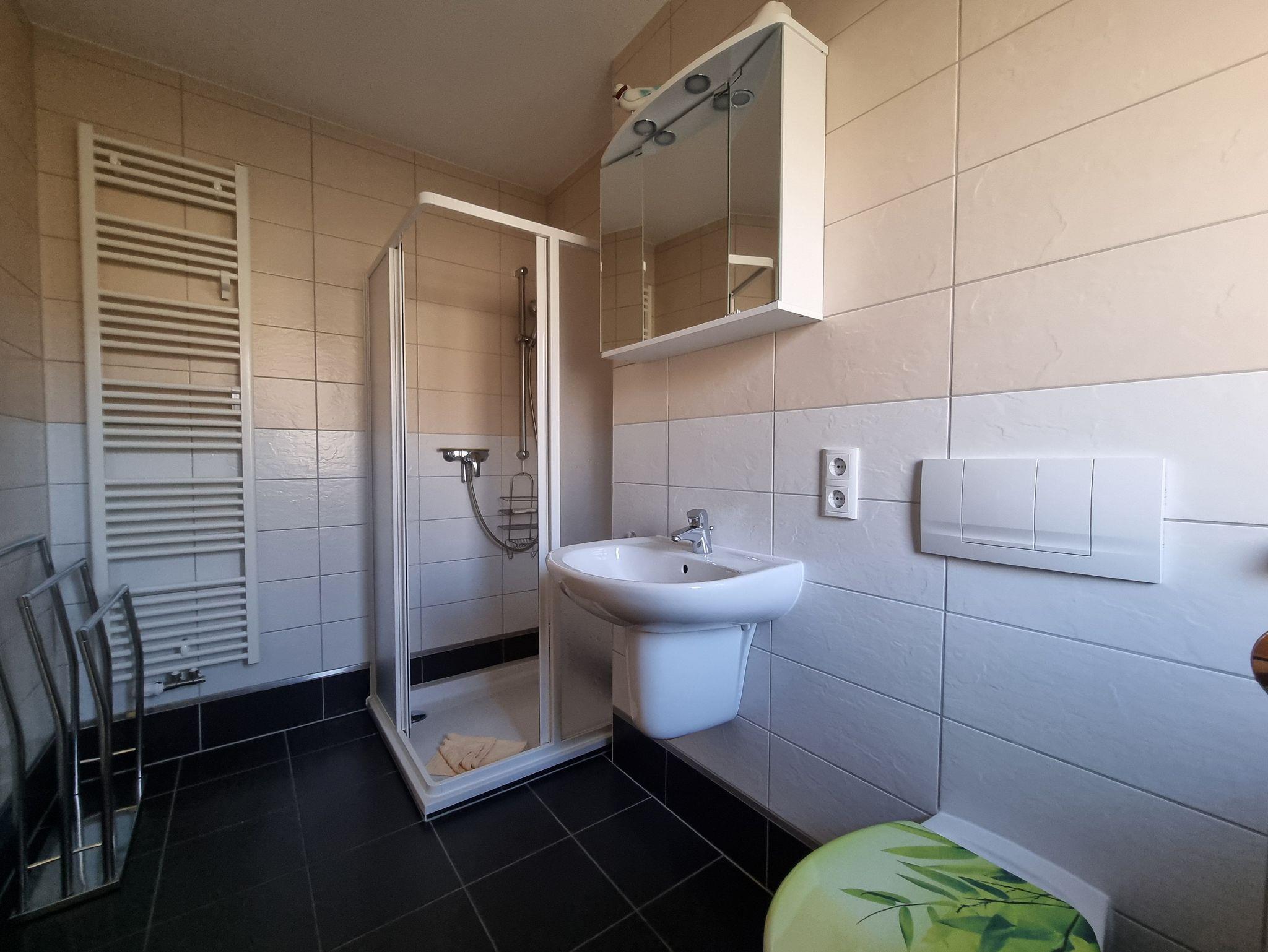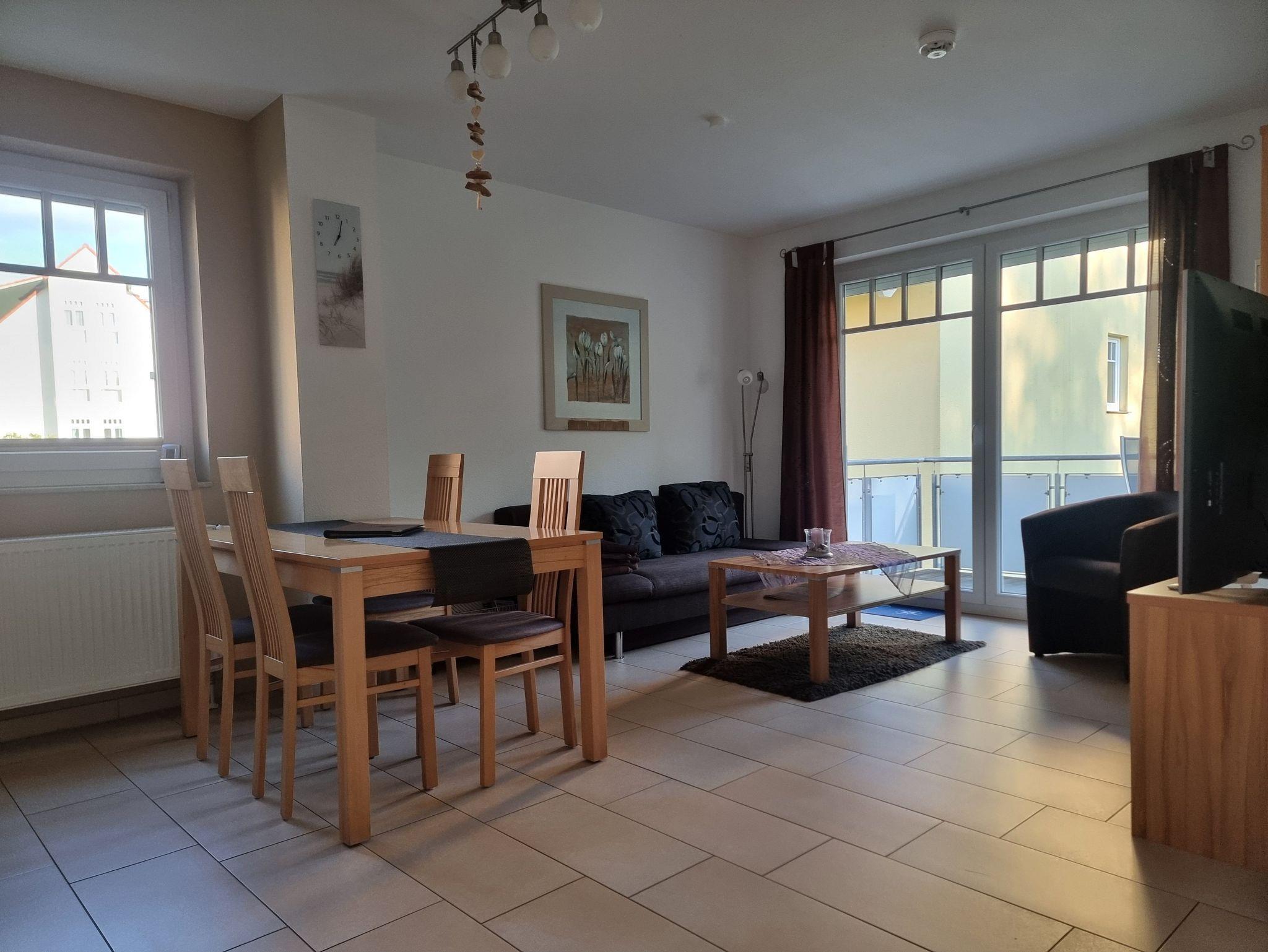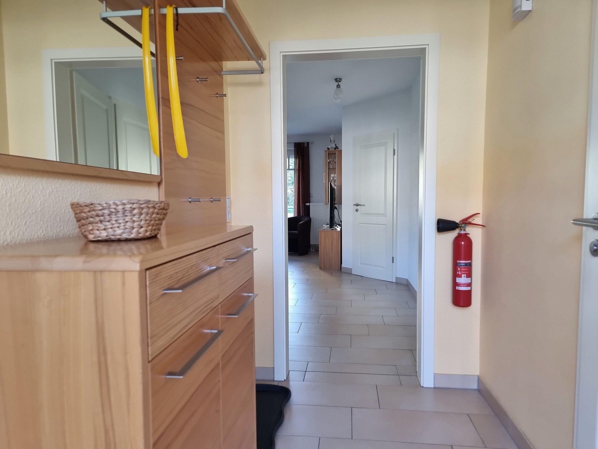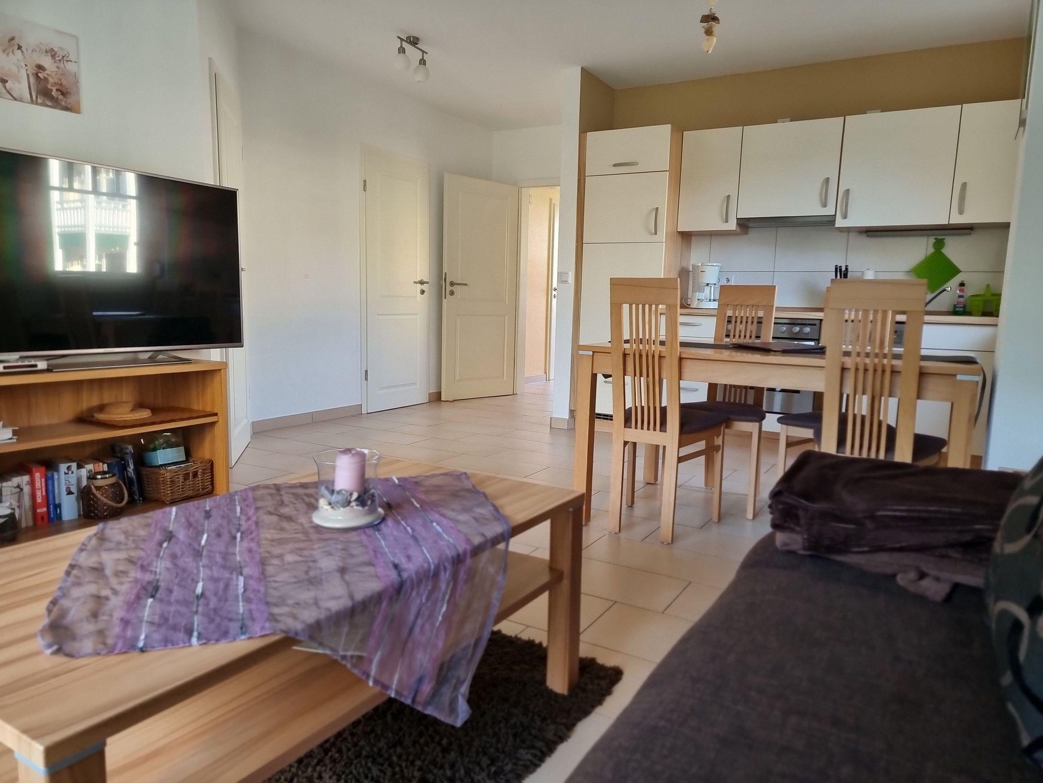 Die Wohnung verfügt über ein Schlafzimmer mit Doppelbett und ein Schlafzimmer mit 2 Einzelbetten. Die Ferienwohnung liegt im 1. Geschoß des Ferienhauses. Sie besteht aus Wohnzimmer, kompl. ausgestatteter Küche, Schlafzimmer und Tageslichtbad. Die Ausstattung der Einbauküche ist neuwertig funktional und qualitativ hochwertig unter anderem mit Toaster, Kaffeemaschine, Backofen mit Heißluft, Kochfeld, Geschirrspüler, Gefrierfach. Großer Südbalkon mit Blick auf den Küstenwald, große Spielwiese.