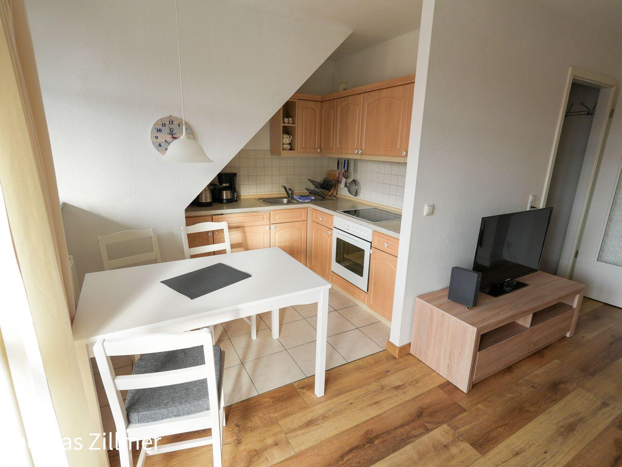 Vom Wohnzimmer gelangt man auf den Balkon in Südlage. Dieser ist je nach Jahreszeit mit Tisch und Stühlen so wie Auflagen ausgestattet. Die großzügige Einbauküche ist voll ausgestattet und beinhaltet u.a., Kühlschrank, Umluftherd mit Ceran- Kochfeld, Kaffeemaschine, Toaster, Wasserkoche.