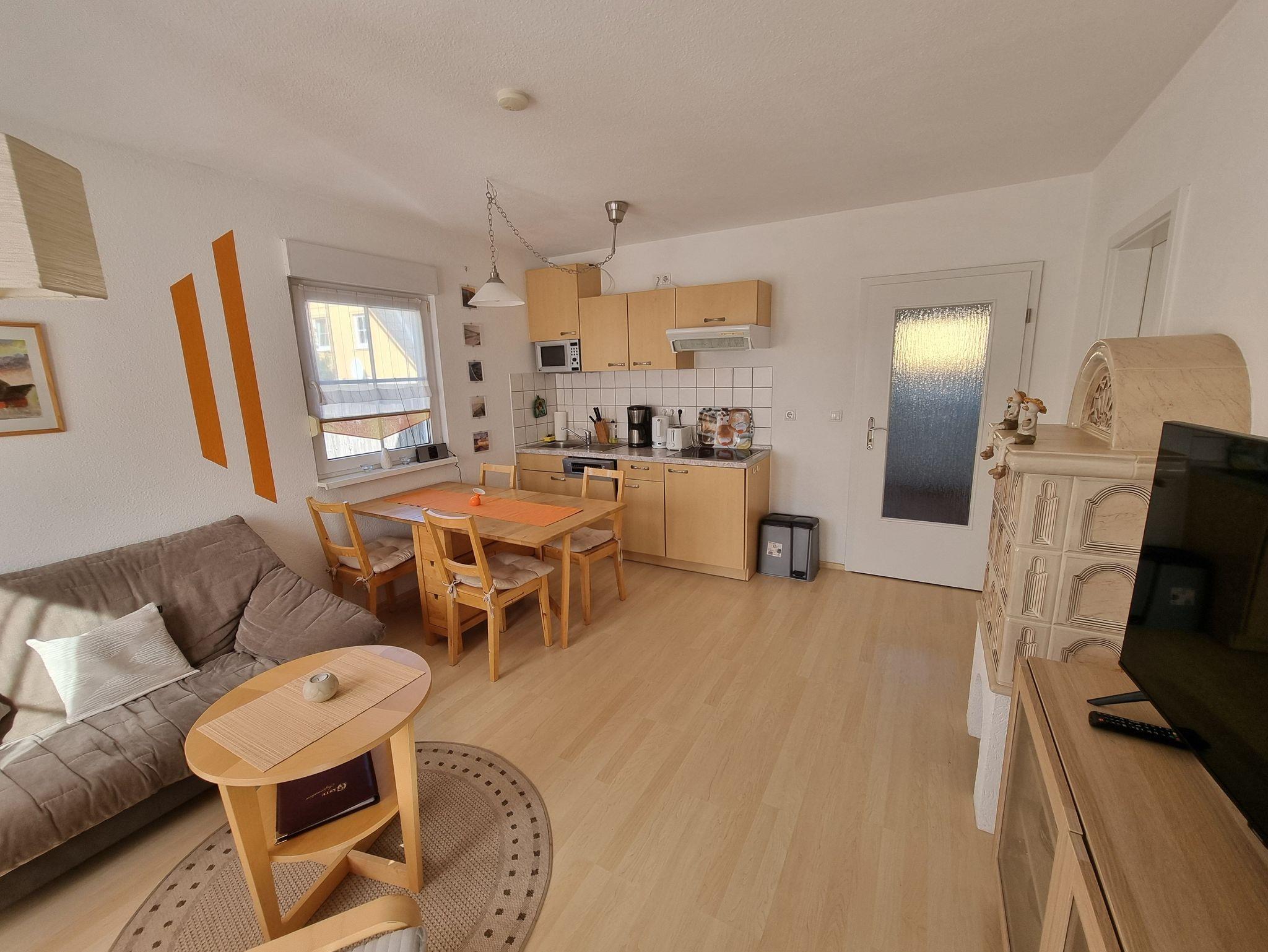 Die Ferienwohnung ist im Wohnbereich ausgestattet mit einer gemütlichen Couch und einer offenen Küche mit Essbereich. Die Südterrasse lädt zum Entspannen ein.