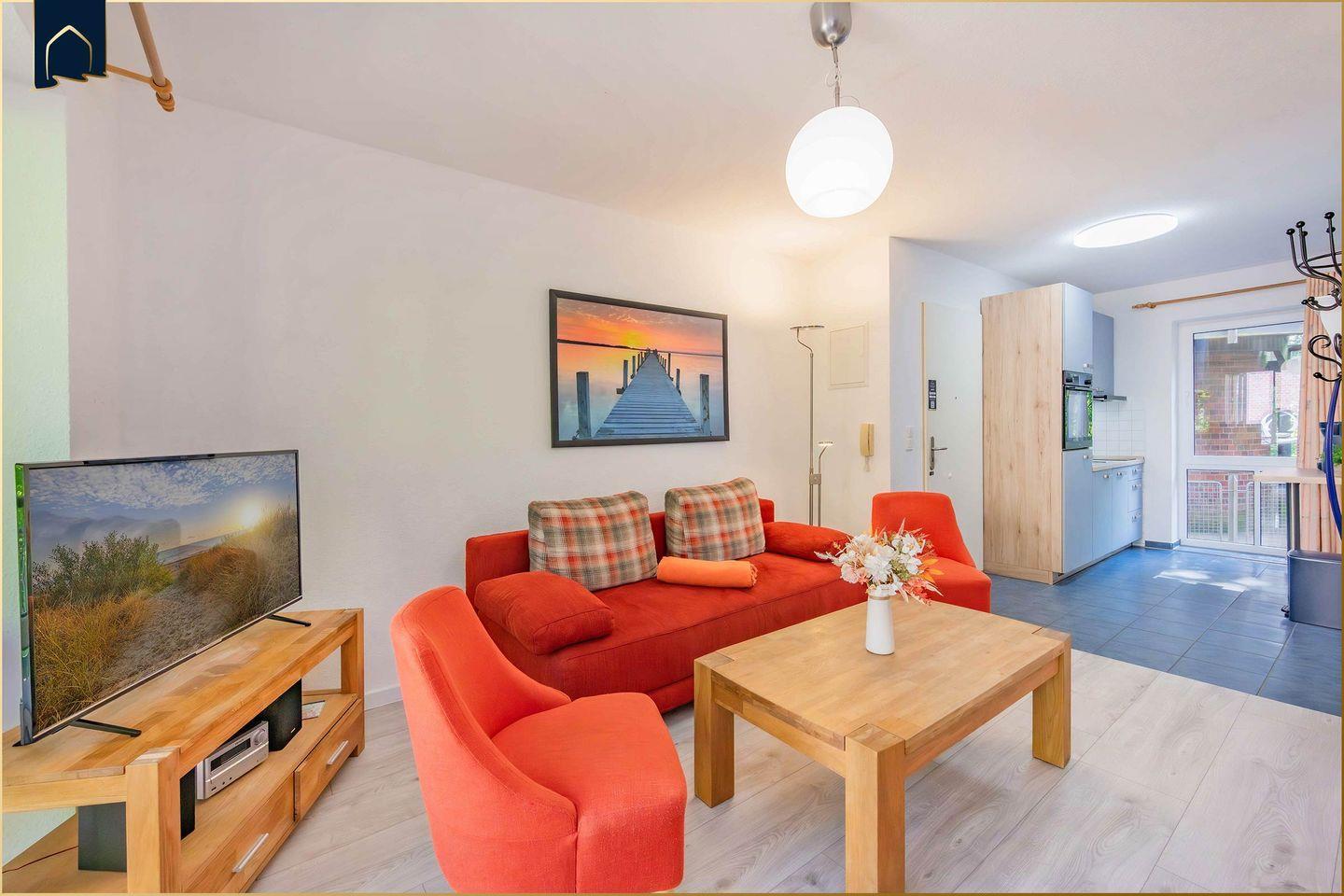 Der offene Wohnbereich ist hell und freundlich eingerichtet und bietet mit einer komfortablen Sofaecke, einem Flachbild-TV und einem Essbereich mit Tisch die perfekte Umgebung für entspannte Abende. Die Küche ist voll ausgestattet mit Kaffeemaschine, Toaster, Wasserkocher, Mikrowelle und allem nötigen Kochgeschirr. Im Schlafzimmer sorgt ein gemütliches Doppelbett für erholsamen Schlaf, zusätzlich steht ein Kinderbett zur Verfügung. Das Badezimmer verfügt über eine moderne Dusche, Kosmetik- und Ganzkörperspiegel sowie einen Haartrockner.