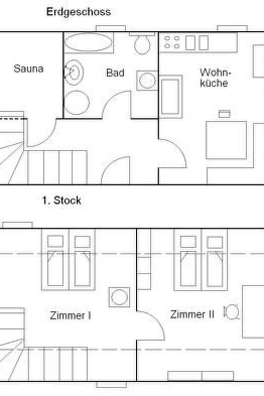 Inside, you will find a lovingly furnished eat-in kitchen on the ground floor that leaves nothing to be desired, as well as a modern bathroom and a soothing sauna where you can relax after an eventful day. The first floor has two cosy bedrooms that can accommodate a total of four people, one of which is a connecting room. On request, we will be happy to arrange additional sleeping arrangements for you, for example for children.