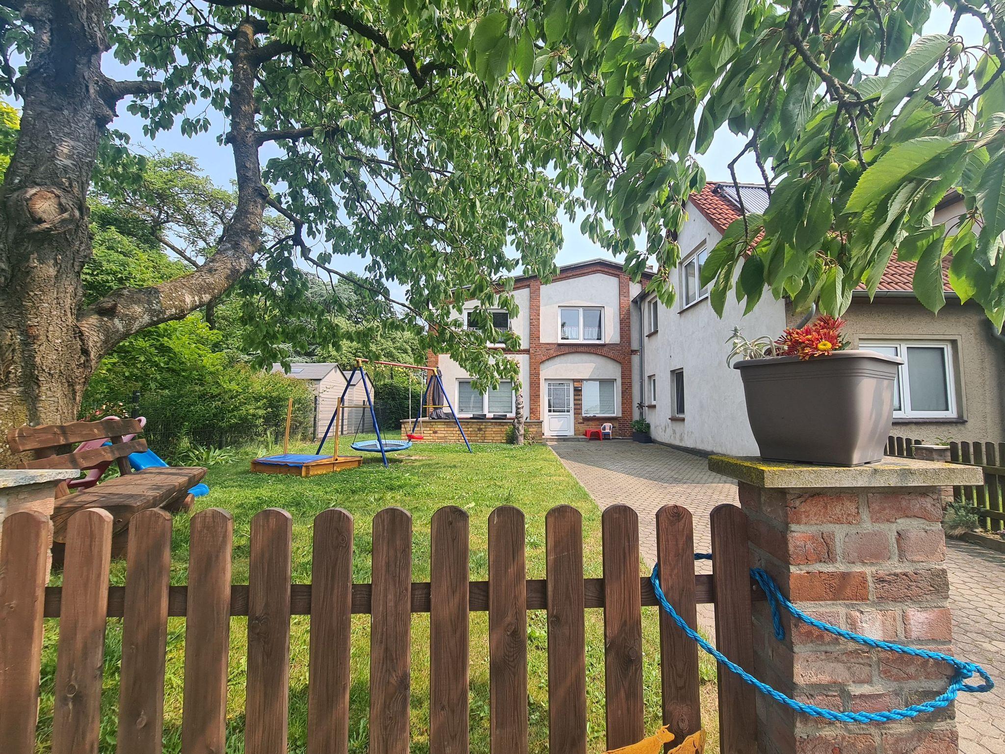 Schattenspendender Obstgarten. Große Grillterrasse mit Sonnenschirm, Feuerschale für gemütliche Abendstunden. Kinderschaukeln, Nestschaukel, Sandkiste und Rutsche.