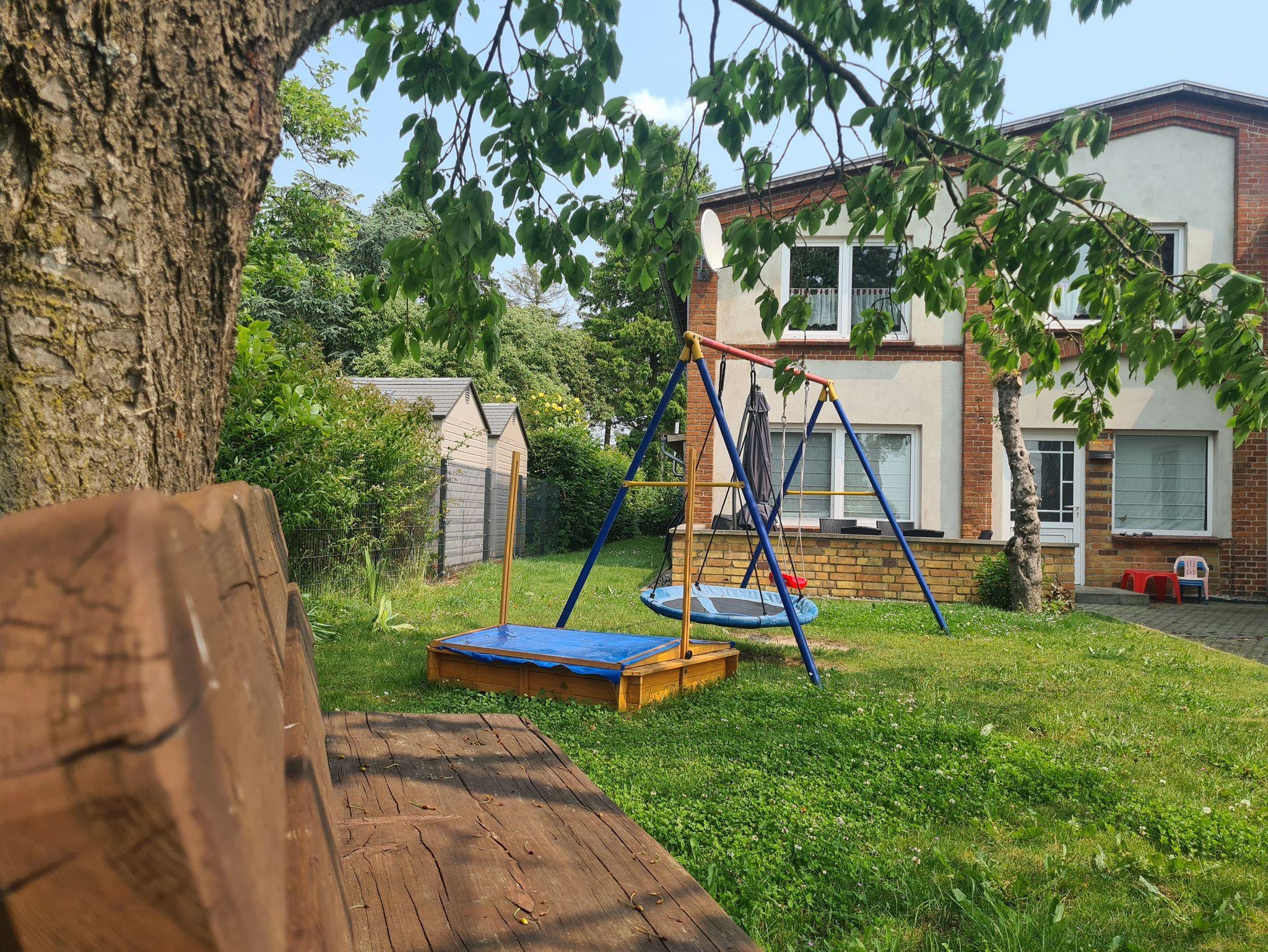 Kinder-Extras inklusive: Spielgeräte im Garten an der Terrasse. Treppenschutzgitter.