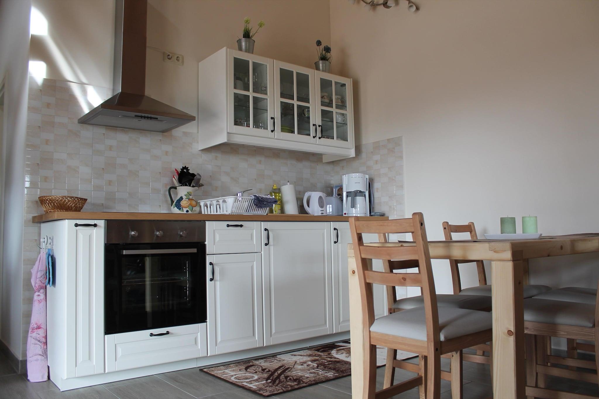 Flugt ud på landet med familie eller venner i dette hyggelige feriehus, beliggende på en rummelig gårdgrund i Brusow, nær byen Kröpelin. Omgivet af natur er det det perfekte sted at slappe af og nyde den fredelige rytme i livet på landet. Huset er ideelt til 4 gæster og byder på et varmt og rustikt tilflugtssted. Stueetagen har opholdsstue med åbent køkken og badeværelse med bruser og toilet. Sovehallen er placeret ovenpå under taget, tilgængelig via en stejl trappe, bemærk at det muligvis ikke er egnet til små børn. En overdækket terrasse tilbyder et dejligt sted at læne sig tilbage, og alle gæster er velkomne til at bruge den udendørs grill og pejseområdet til afslappede måltider. Gården er hjemsted for venlige dyr, herunder heste, ænder, høns, kaniner, duer og hunde, hvilket tilbyder en ægte naturoplevelse. Til dagsture er feriebyerne Kühlungsborn og Rerik ved Østersøen kun 15 minutter væk i bil, med brede sandstrande, moler og livlige promenader at udforske.