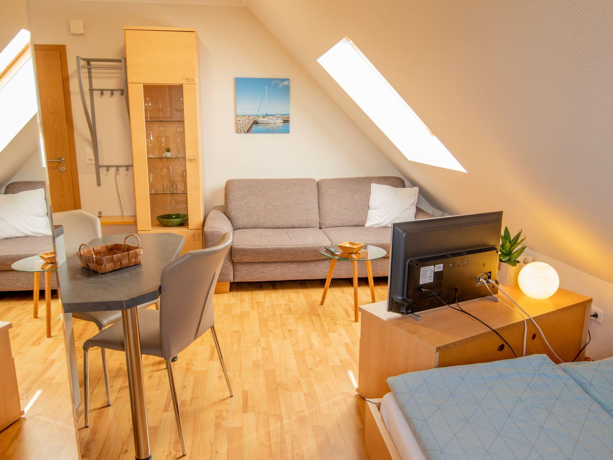 Die Ferienwohnung 3 im Blu Hus in Freest liegt im Dachgeschoss und bietet auf 18 m² einen gemütlichen Rückzugsort für 2 Personen. Sie ist ideal für alle, die es kompakt und praktisch mögen, ohne auf Komfort verzichten zu müssen. Der Wohn- und Schlafbereich ist offen gestaltet und kombiniert ein bequemes Sofa, einen Fernseher sowie ein Doppelbett (140x200). Ein Kleiderschrank bietet ausreichend Stauraum für deine persönlichen Dinge. Die offene Küche ist mit einem Kombiofen, einem 2-Platten-Kochfeld, einem Geschirrspüler, Kochutensilien und allem Nötigen für die Selbstverpflegung ausgestattet. Besonders schön ist der direkte Zugang zum Balkon mit Blick auf das Wasser, bei klarer Sicht kannst du sogar bis nach Rügen und Usedom schauen. Das Badezimmer verfügt über eine Dusche und ein WC. Im Haus stehen dir außerdem eine Waschmaschine und ein Trockner zur Verfügung, die du gegen Gebühr nutzen kannst. Die Nähe zum Hafen, zum Strand und zur Natur macht diese kleine Wohnung zum idealen Ort für eine entspannte Auszeit an der Ostseeküste.