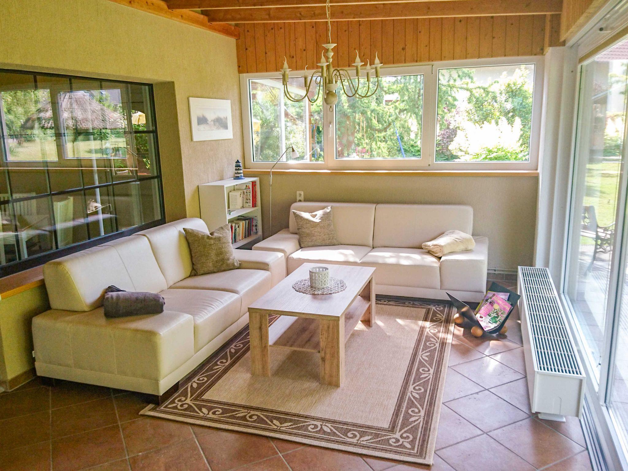 Von der Küche aus zugänglich ist die offene, überdachte Terrasse mit Sitzgelegenheiten. Im Garten stehen den Gästen Sonnenliegen, ein Sonnenschirm und ein Grill zur Verfügung, außerdem weitere Sitzgelegenheiten z.B. Hollywoodschaukel. Für Kinder gibt es eine Schaukel und vor allem ausreichend Platz zum Spielen.