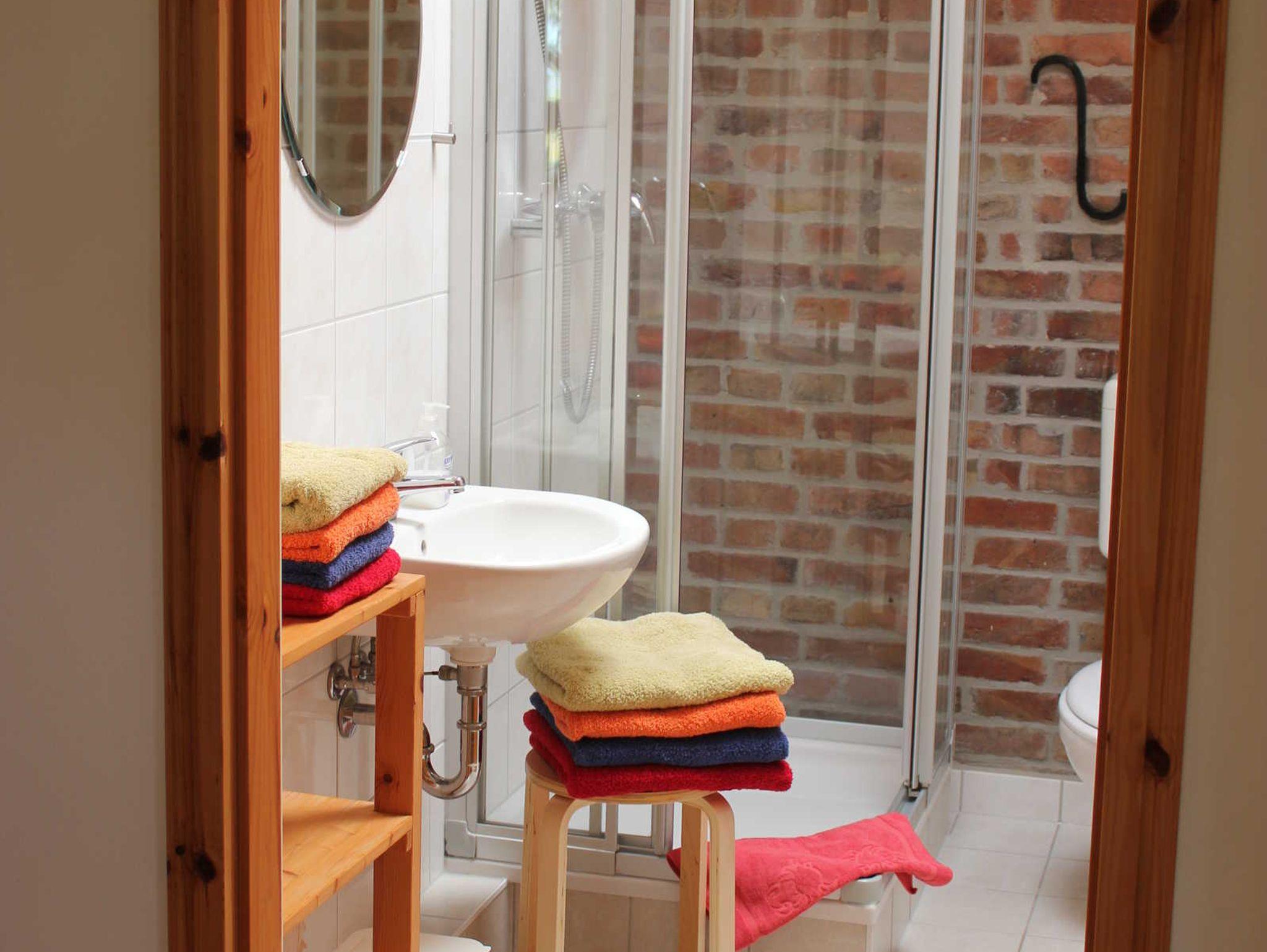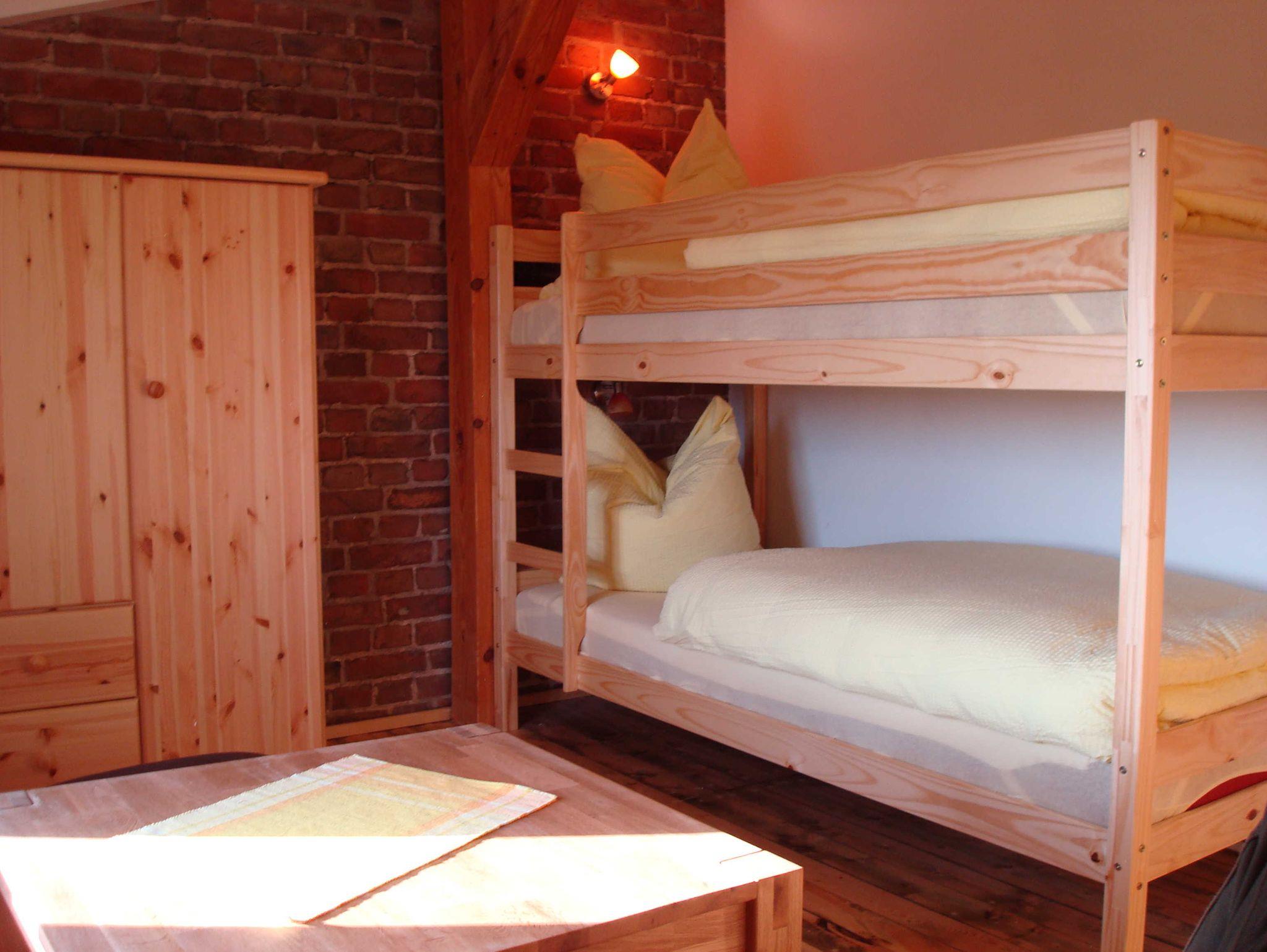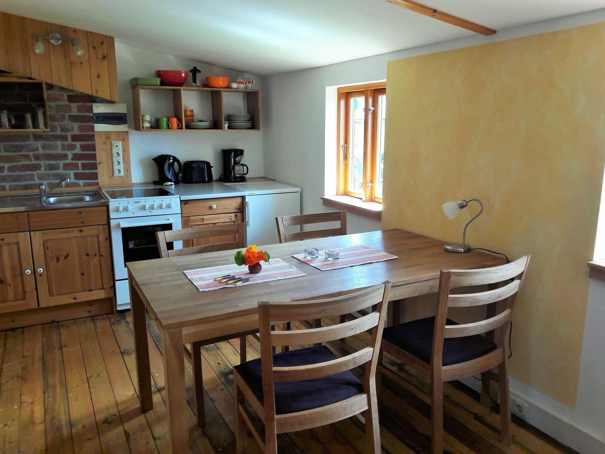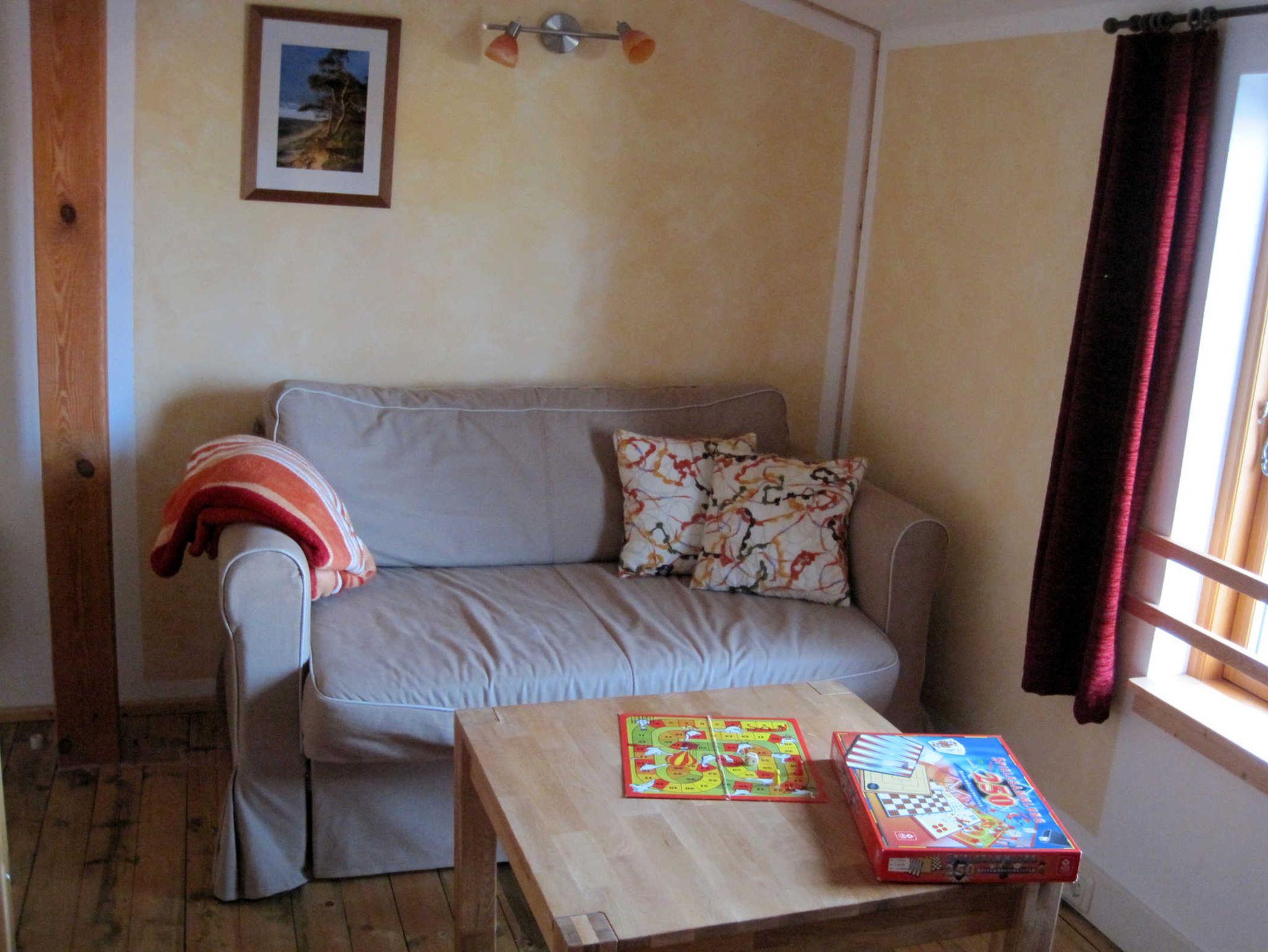 Die großzügige Ferienwohnung für 2 bis 5 Personen befindet sich in der oberen Etage der liebevoll ausgebauten alten Bootsscheune auf dem Hof des Vermieters. Sie verfügt über ein helles Wohnzimmer mit gut ausgestatteter Küchenzeile. Dazu gehört ein E-Herd mit Backofen, Kühlschrank mit Tiefkühlfach, Toaster, Wasserkocher und Kaffeemaschine. Eine gemütliche Sitzecke lädt zum Fernsehen oder Lesen ein und ein großer Esstisch gehört ebenfalls dazu. Die Wohnung verfügt über zwei separate Schlafzimmer. Das erste Schlafzimmer hat ein Doppelbett, im zweiten befindet sich ein Etagenbett sowie eine ausziehbare Couch. Auch im Wohnzimmer kann man ein Sofa als Schlafmöglichkeit nutzen. Alle Zimmer sind mit Holzmöbeln im skandinavischen Stil eingerichtet. Die Zimmer haben Holzfußböden. Selbstverständlich besitzt die Wohnung ein Bad - mit Dusche / WC. Fön ist vorhanden. Bettwäsche, Handtücher und Geschirrtücher sind im Gesamtpreis enthalten. Handtücher werden wöchentlich gewechselt. Die Wohnung besitzt Fenster, die mit Fliegengittern versehen sind.