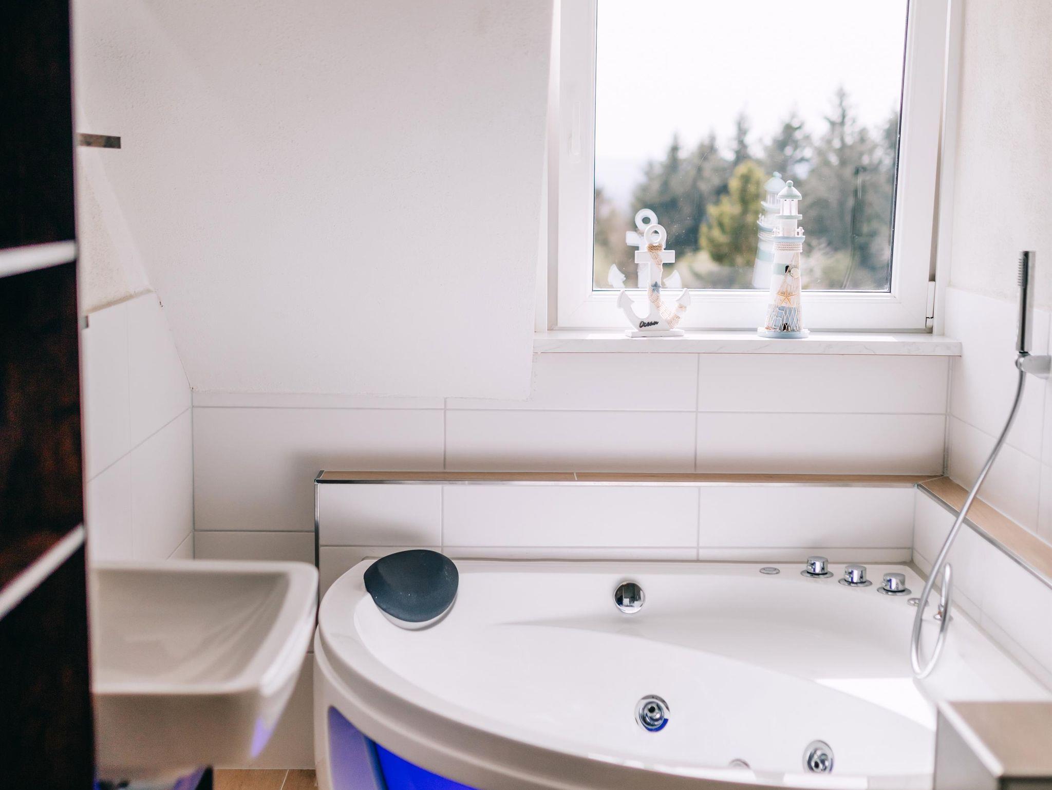 Das Hauptbad mit Whirlpoolbadewanne und Dusche, WC und Fön runden den Wohlfühlfaktor sicher ab.