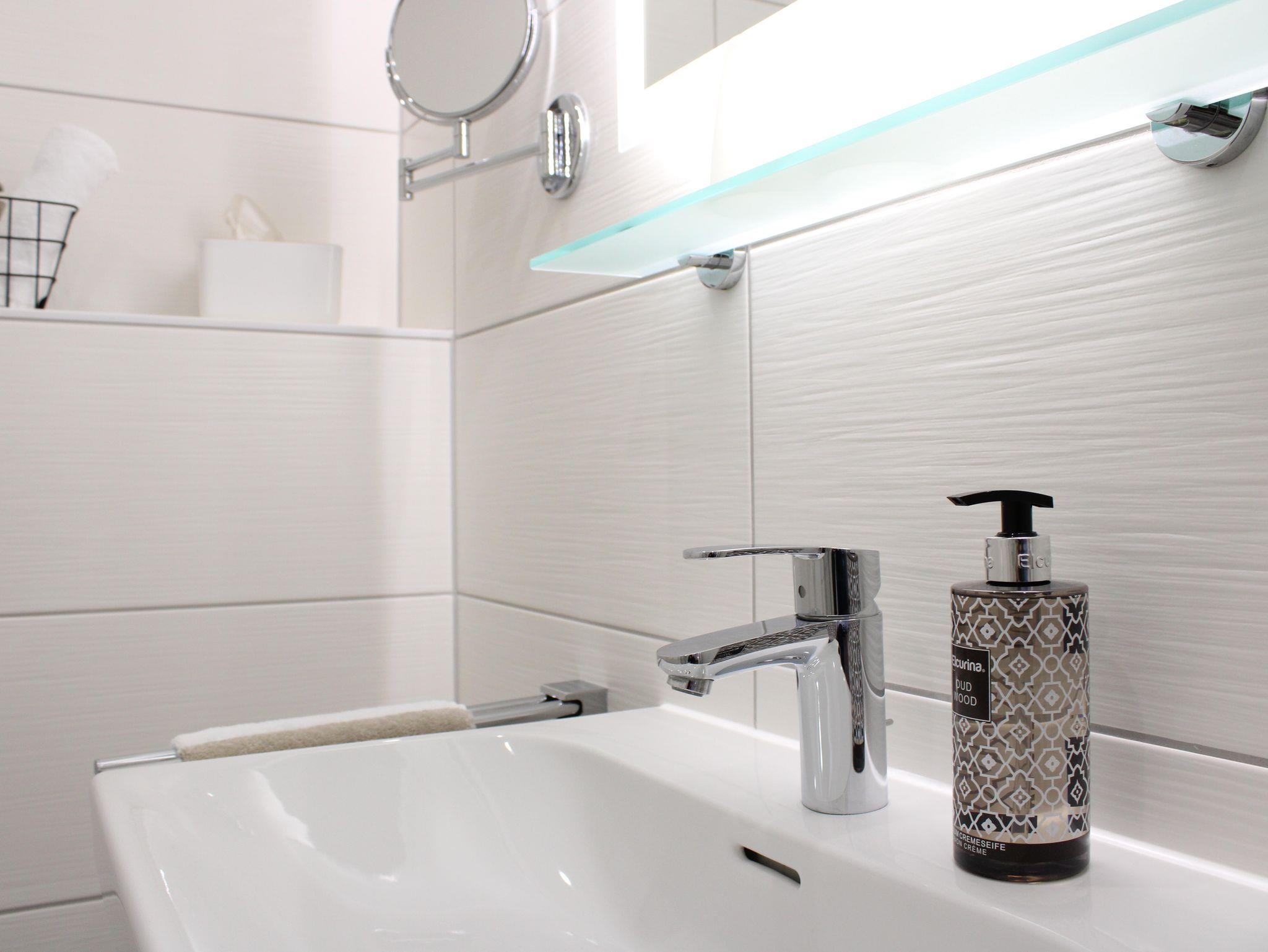 Das Badezimmer ist komfortabel eingerichtet und verfügt mit Dusche, Toilette, Föhn, Kosmetikspiegel, Handtücher und verschiedenen Kosmetikartikeln über eine hochwertige Ausstattung.