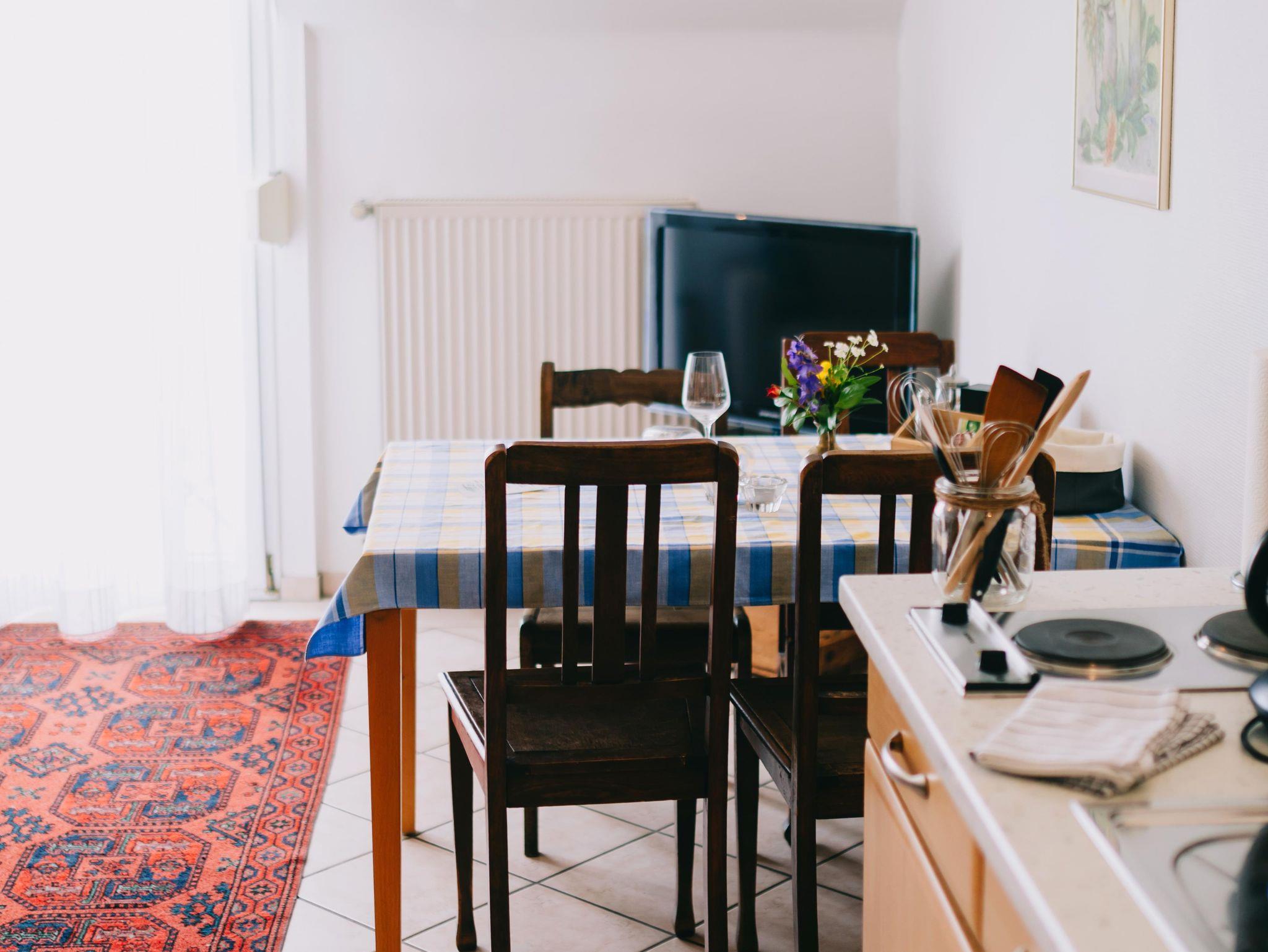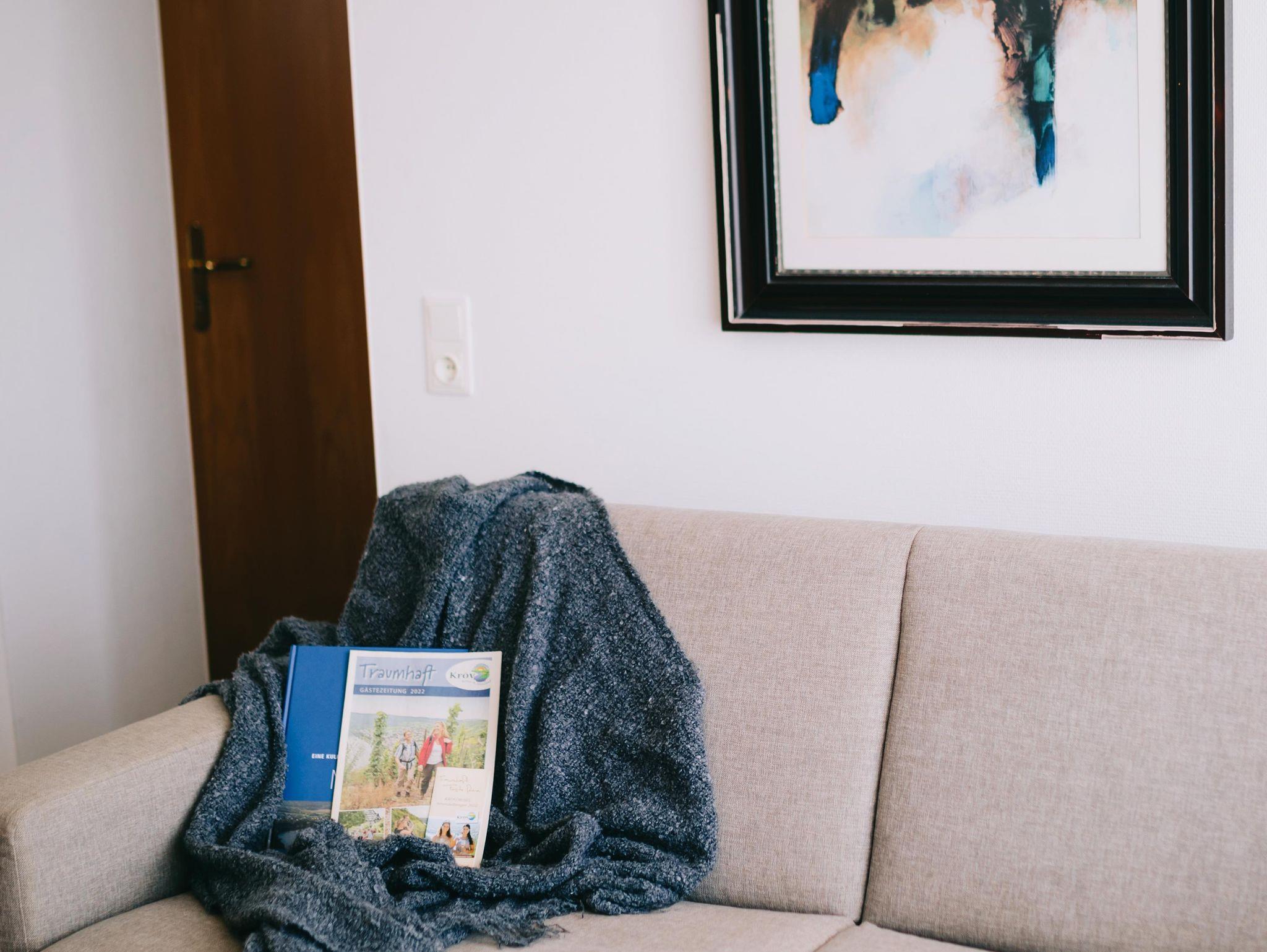 Diese Wohnung bietet Ihnen auf ca. 50m² ein großes Schlafzimmer mit Doppelbett und zusätzlicher Doppel-Schlafcouch und einer weiteren Doppel-Schlafcouch im Wohn-Küchenbereich. Genießen Sie vom Balkon aus den Blick über die Weinberge im Kröver Paradies.
