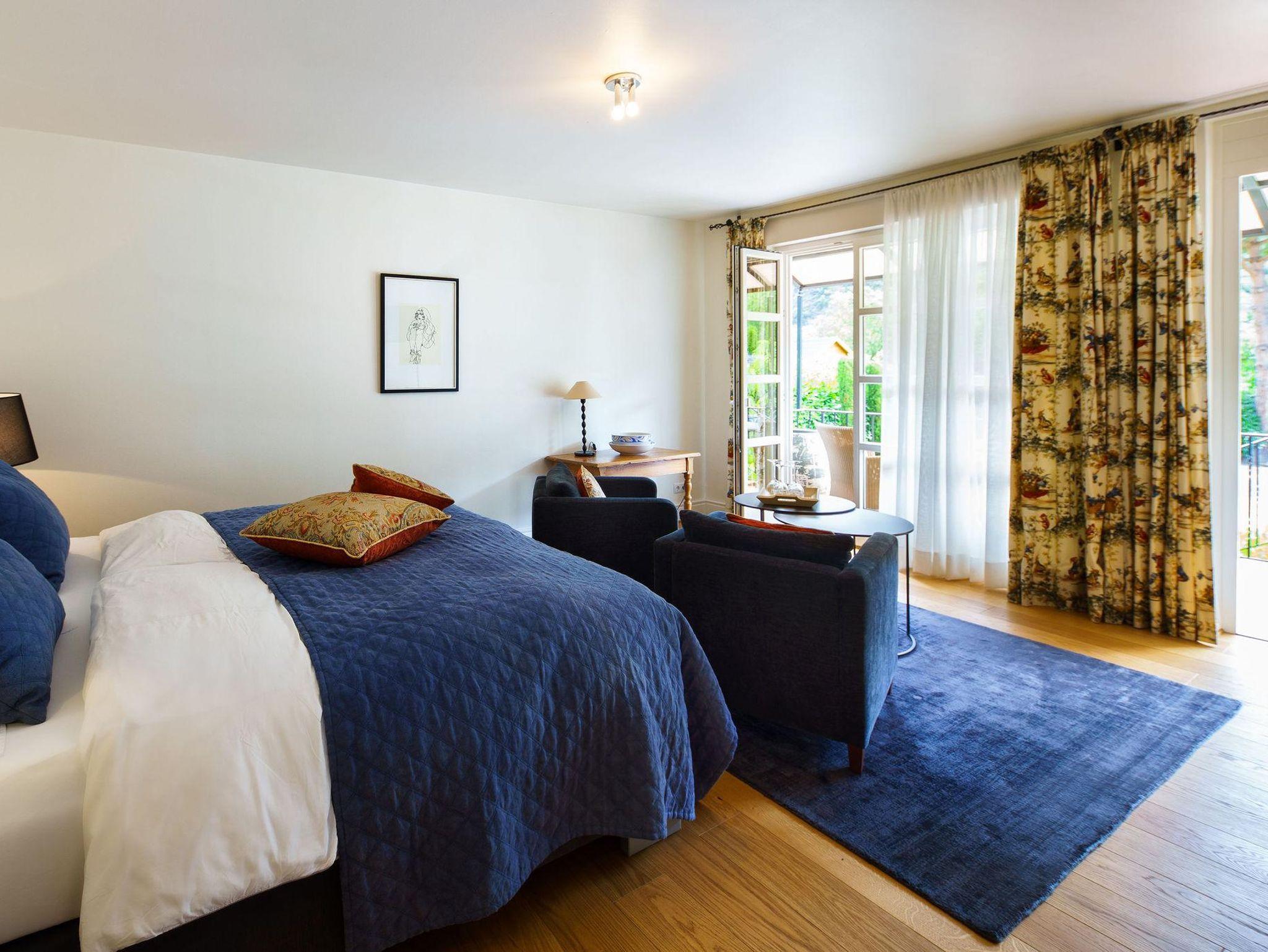 italienische Stoffe, begehbarer Kleiderschrank, Boxspringbett, Flachbild TV, Minibar, DU/WC, Haartrockner, Kosmetikspiegel, Balkon, Lage Parterre, kostenfreies W-LAN, Verwöhn Frühstück vom Buffet
