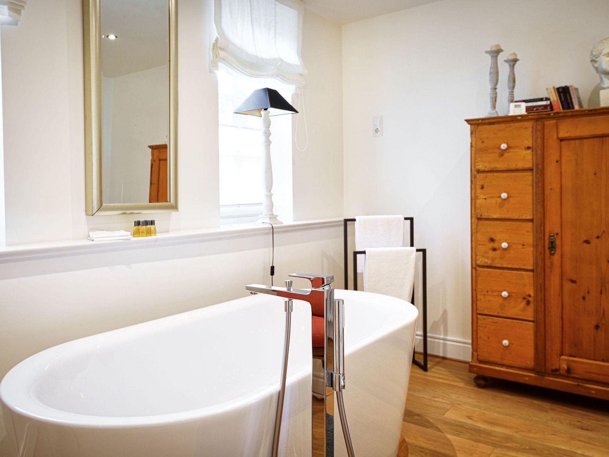 Landhausstil, französische Stoffe, Sitzecke, Boxspringbett, großzügiges Bad mit Badewanne, Doppelwaschbecken, DU/WC, Haartrockner, Pflegeprodukte, Flachbild TV, Minibar, Balkon mit Mosel und Gartenblick, kostenfreies W-LAN, Verwöhn Frühstück vom Buffet