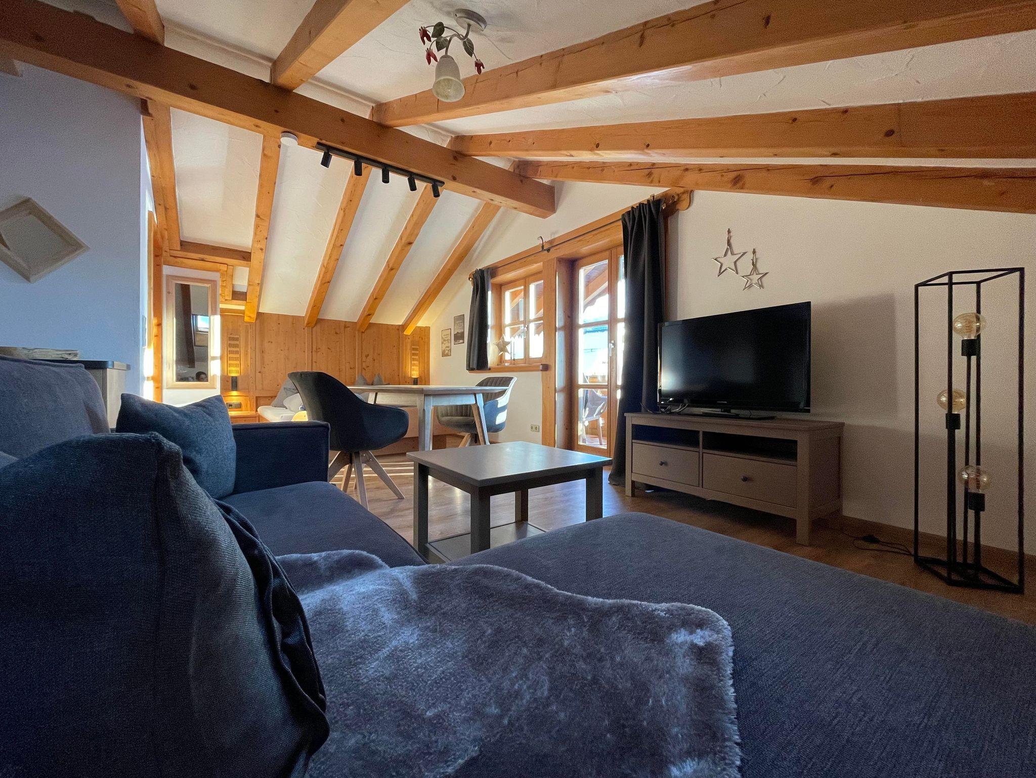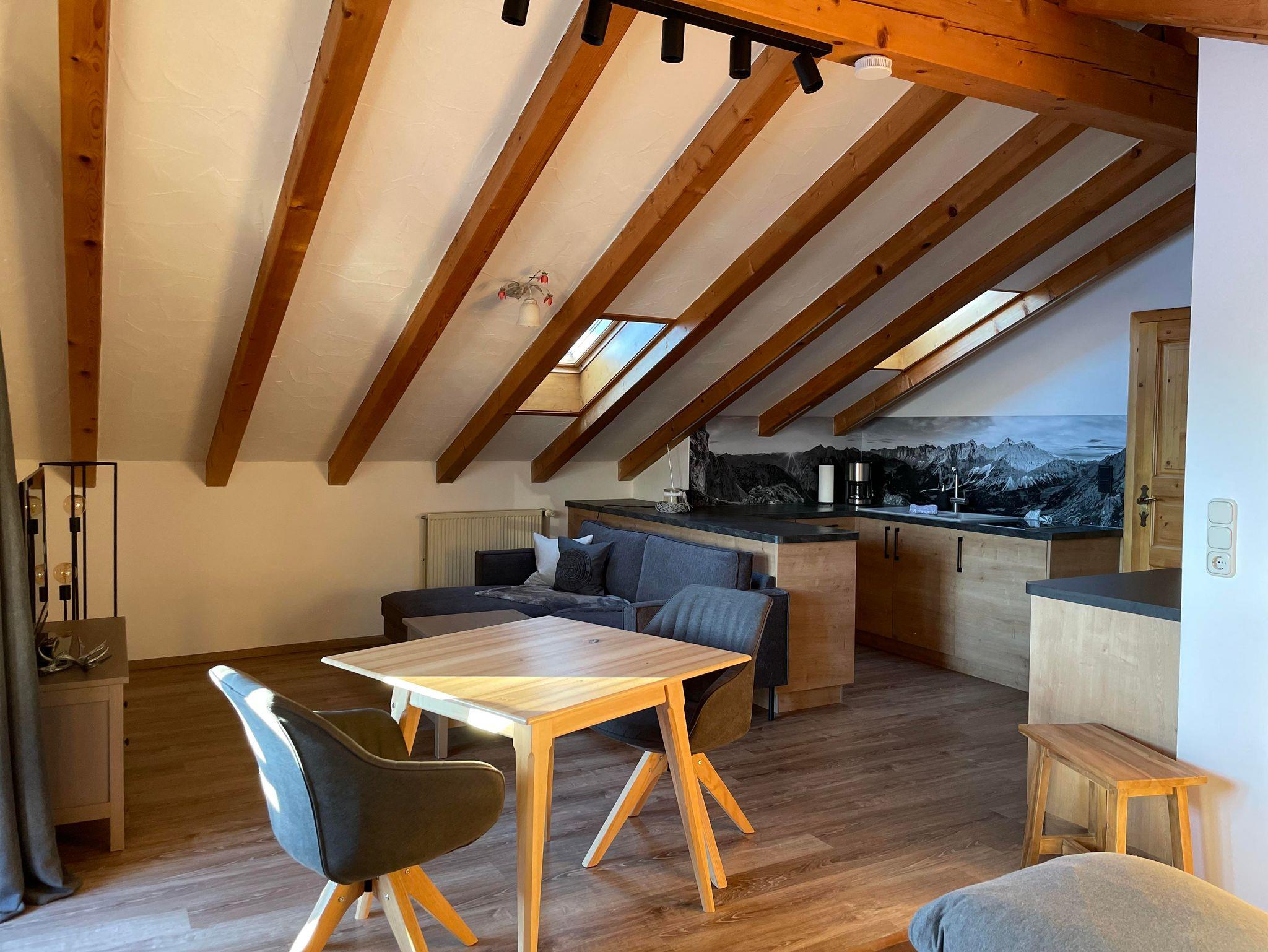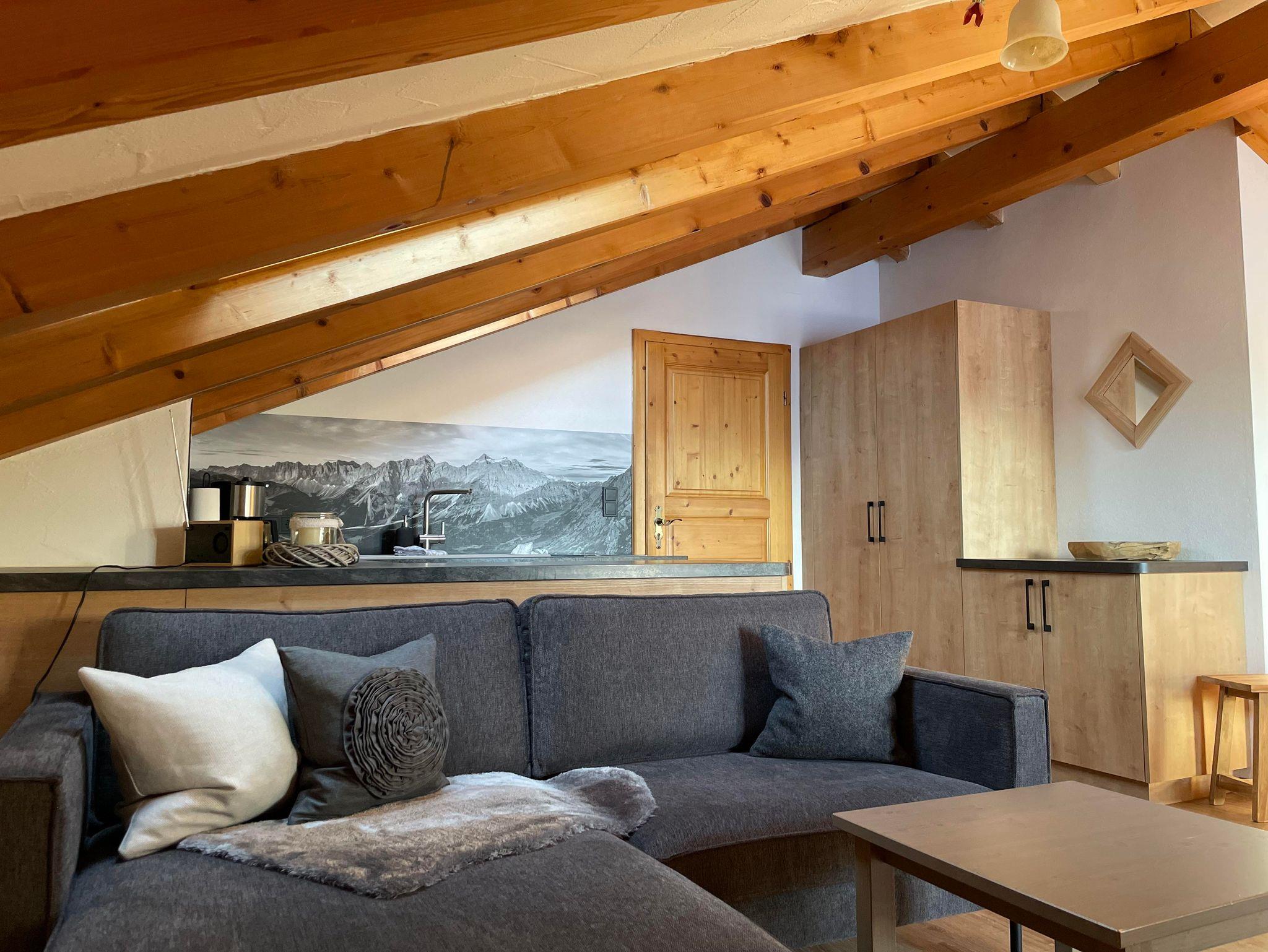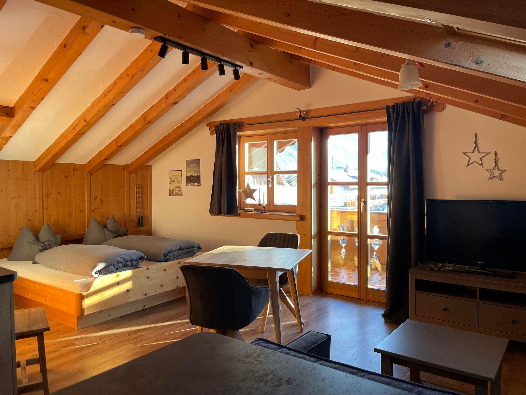 Ferienwohnung Platzhirsch: Gemütlich eingerichtete Ferienwohnung im 2. Stock für 2 Personen mit kombiniertem Wohn- Schlafraum, Südbalkon und herrlichem Gebirgsblick, Balkonmöbeln, Dusche/WC, Digitalem TV, neue Küche mit Bergblick und Spülmaschine.