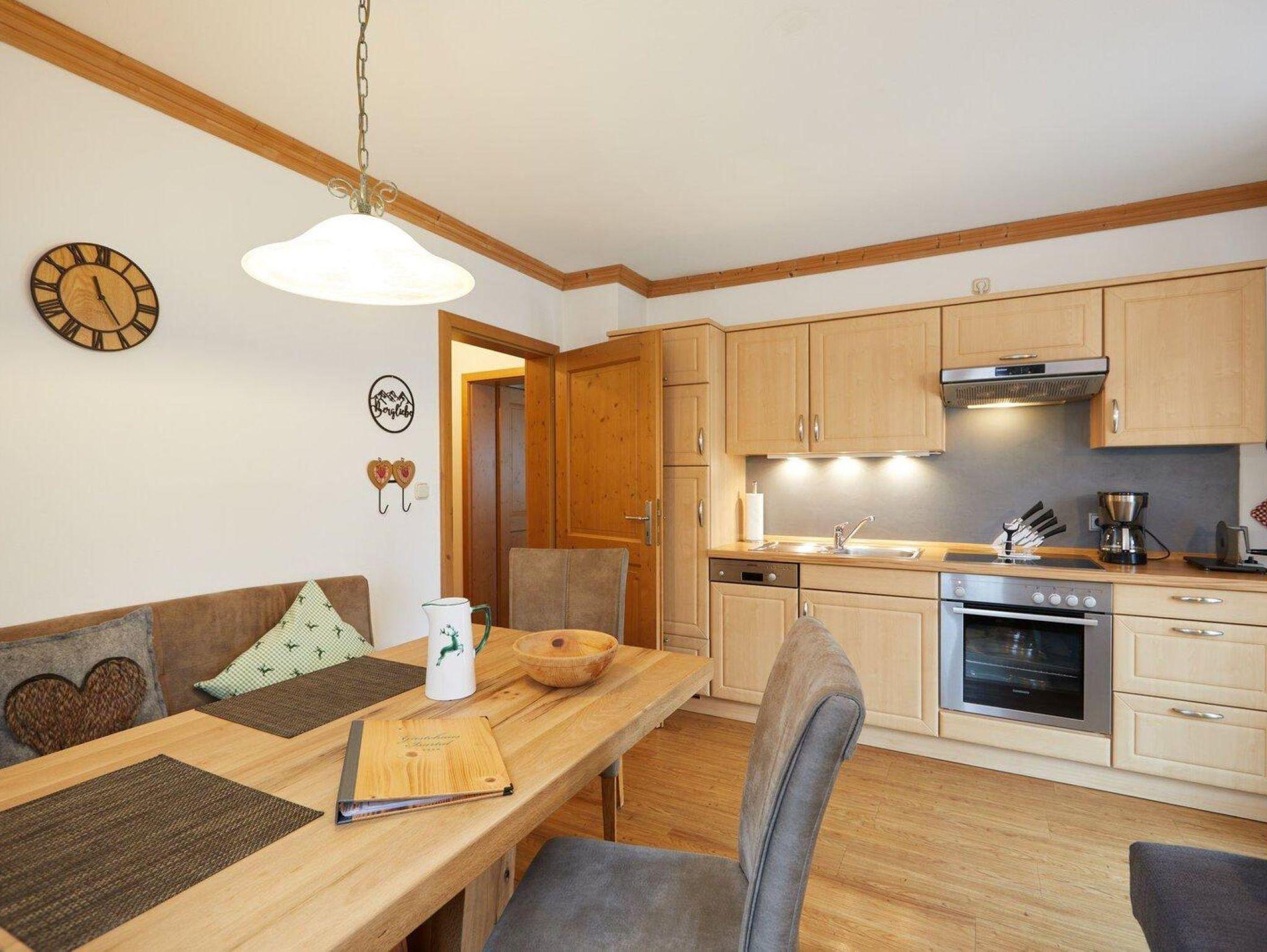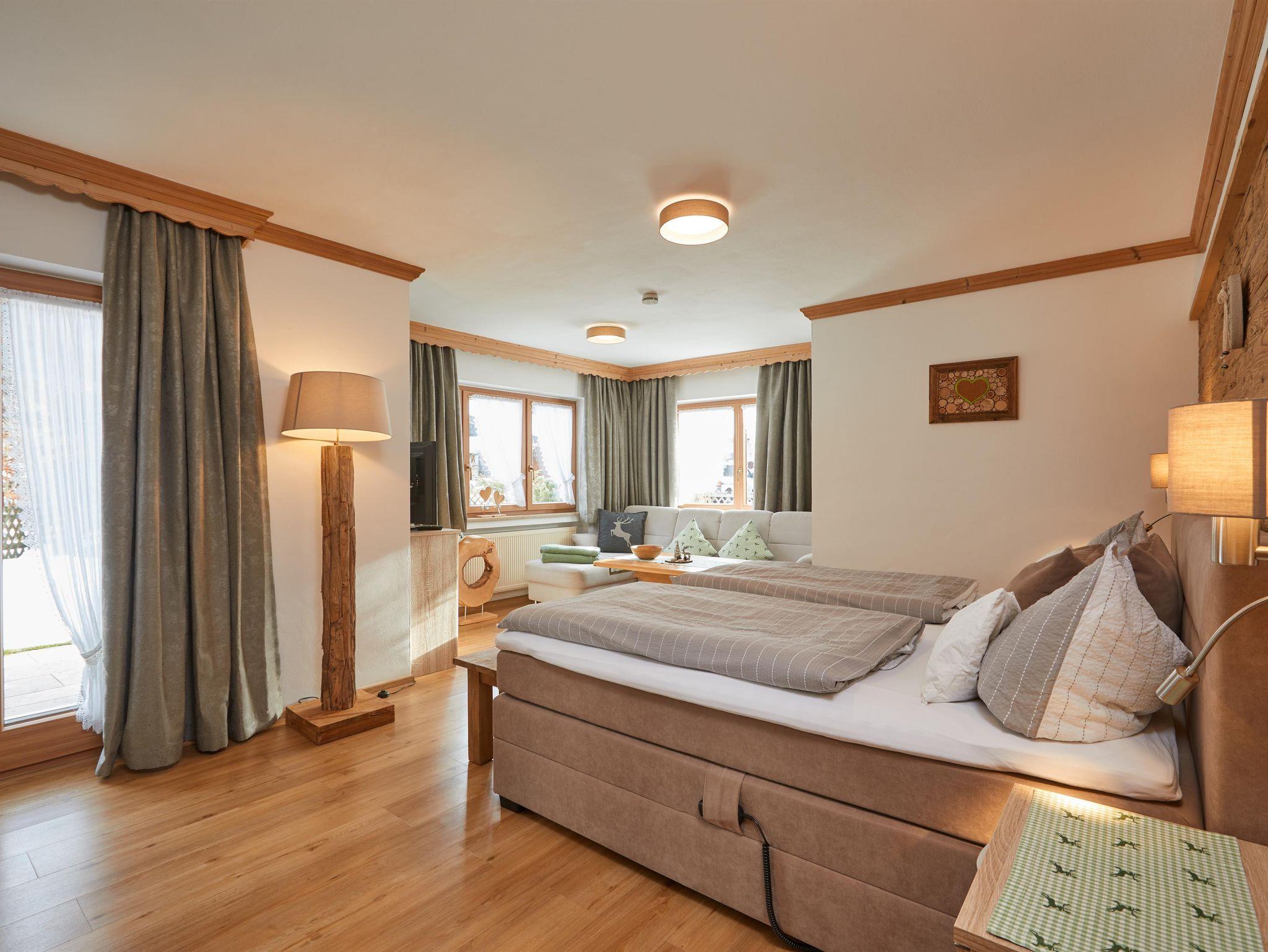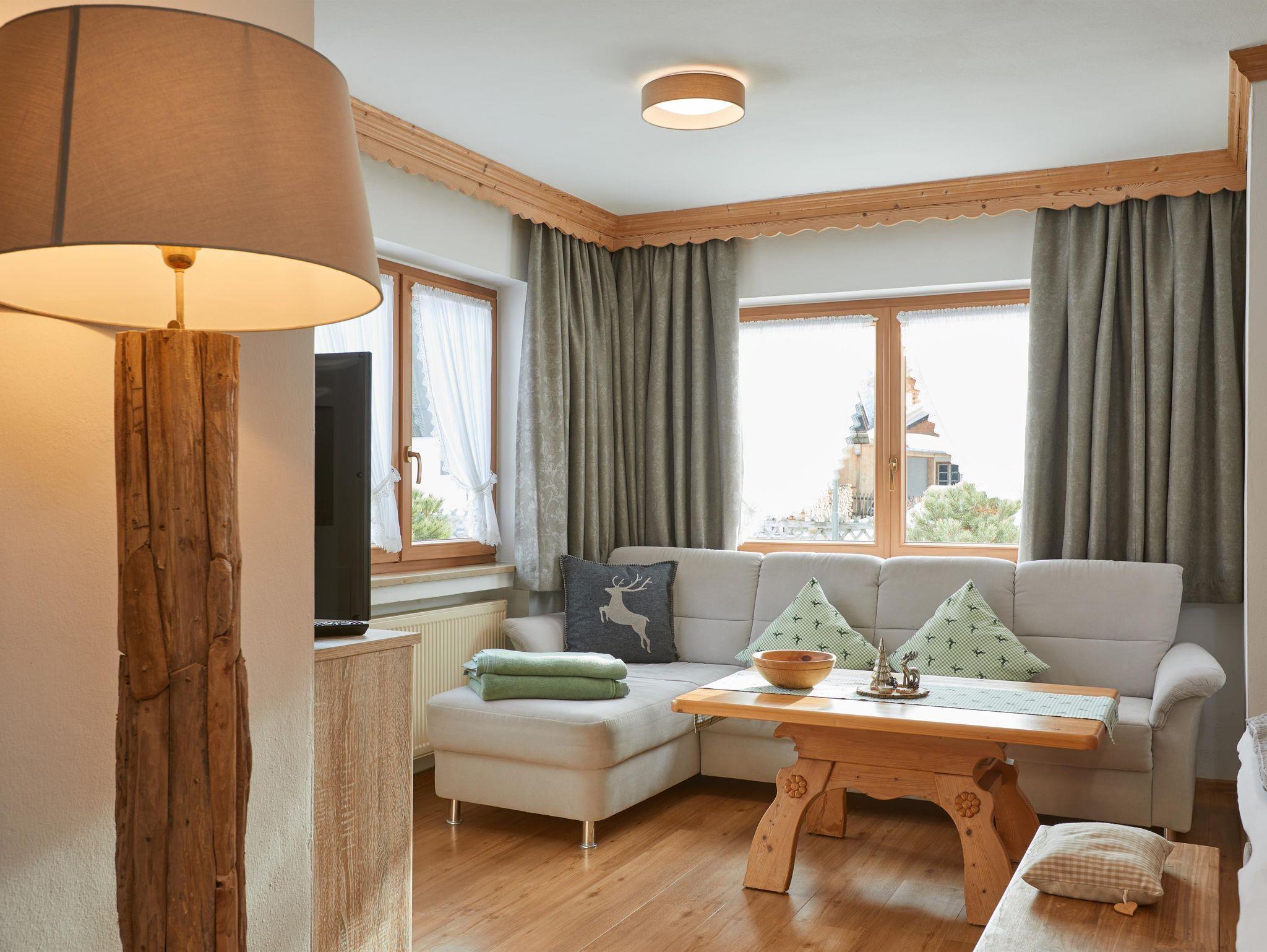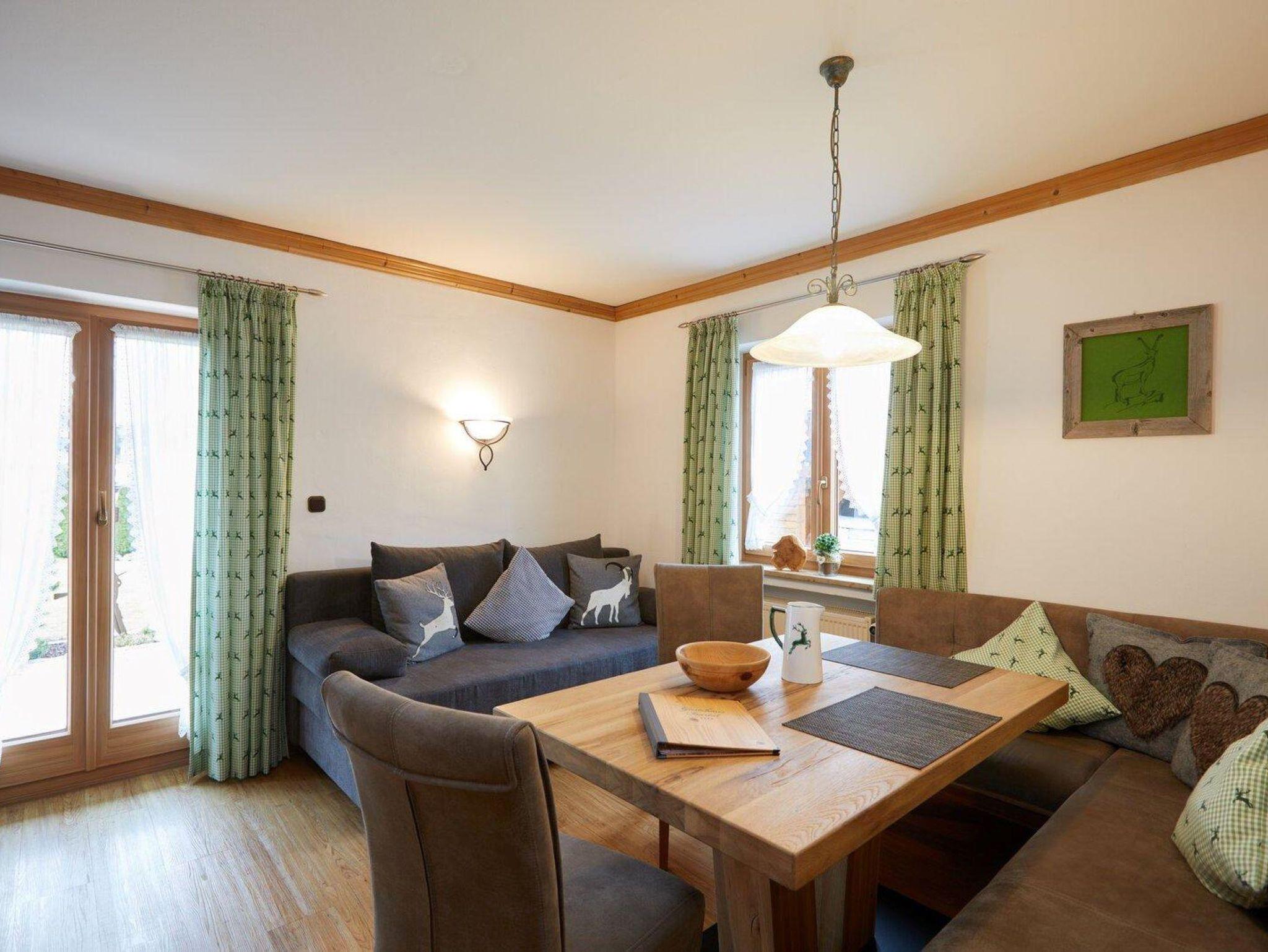 ****Wohnung Steinbock mit 53 qm, Erdgeschoß mit möblierter Ost- und Südterrasse, Panoramablick auf das Karwendel- und Wettersteingebirge. Hochwertige Ausstattung, Holzvinylboden, Altholzwand, großes Schlafzimmer mit elektr. verstellbaren Boxspringbett (2x2 m) und komfortabler Sitzecke . Wohnküche mit Küchenzeile, Spülmaschine, Backofen mit Ceranfeld und sämtlichen elekt. Geräten, gemütliche Eckbank und Sofa. Dusche/WC mit Regendusche,Handtuchwärmer, LED-Beleuchung, Kosmetikspiegel und Haarfön. Flachbildschirm, Digitalradio, Safe, kostenloser W-LAN Internetzugang.