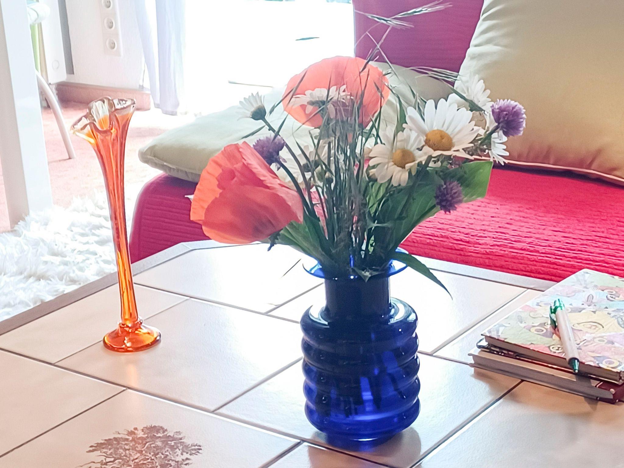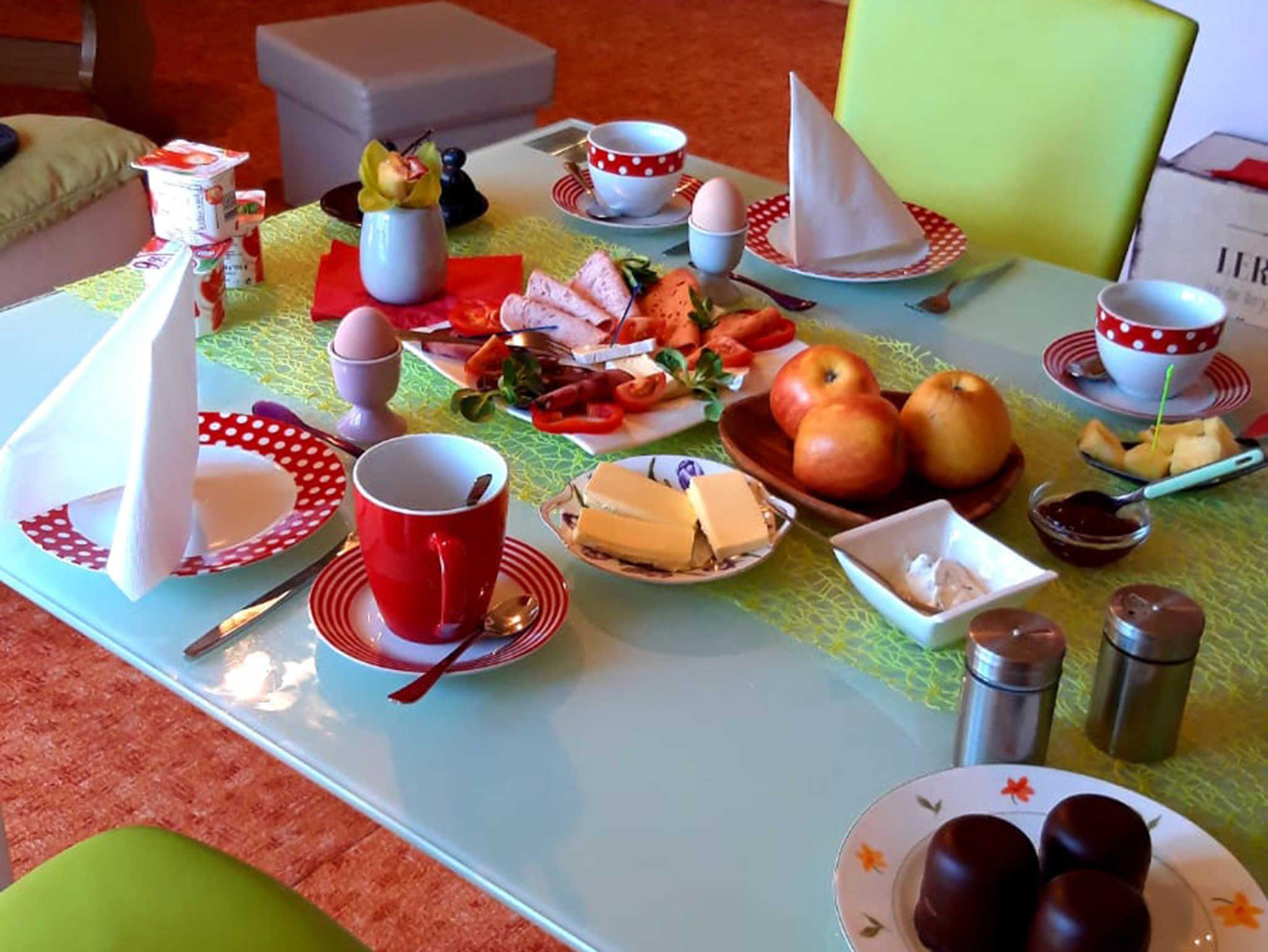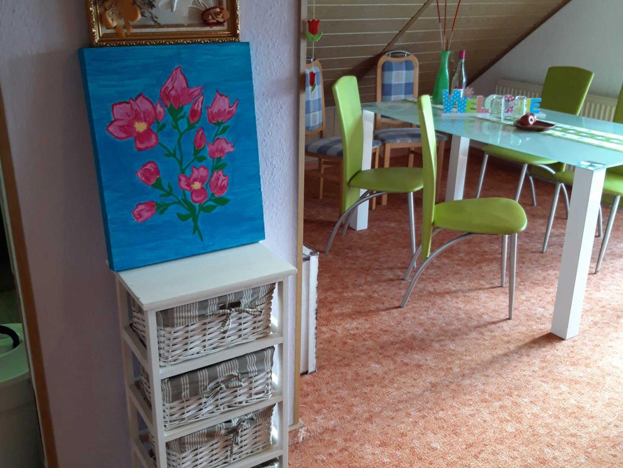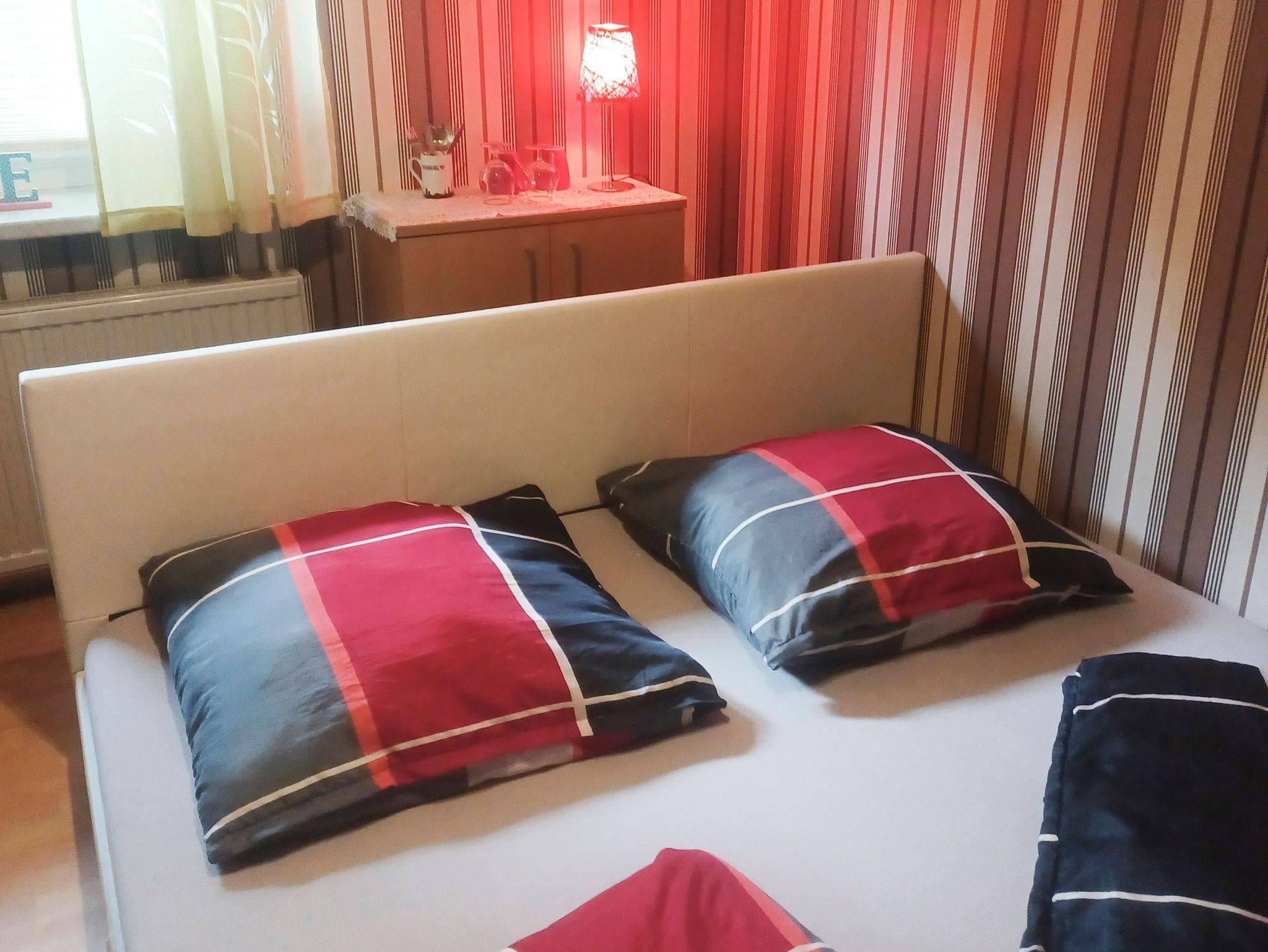 Die 70m² Ferienwohnung für 4 Personen befindet sich im Obergschoss des Einfamilienhauses. Sie besteht aus einem Wohnraum mit TV, offener Küche, Essecke, Schlafsofa, Schaukelstuhl und Kleiderschrank, einem Schlafzimmer mit 2 Doppelbetten (180x200; getrennte Matratzen) sowie einem eigenen Bad mit Dusche und WC. Die offene Küche ist im Wohnraum integriert und verfügt über Backofen, Mikrowelle, Kühlschrank mit Gefrierfach, Wasserkocher, Kaffeemaschine, Toaster, Geschirr und allen nötigen Kochutensilien. Vom Wohnraum gelangt man auf den geräumigen Balkon, der einen schönen Ausblick bietet. WLAN steht kostenfrei zur Verfügung.