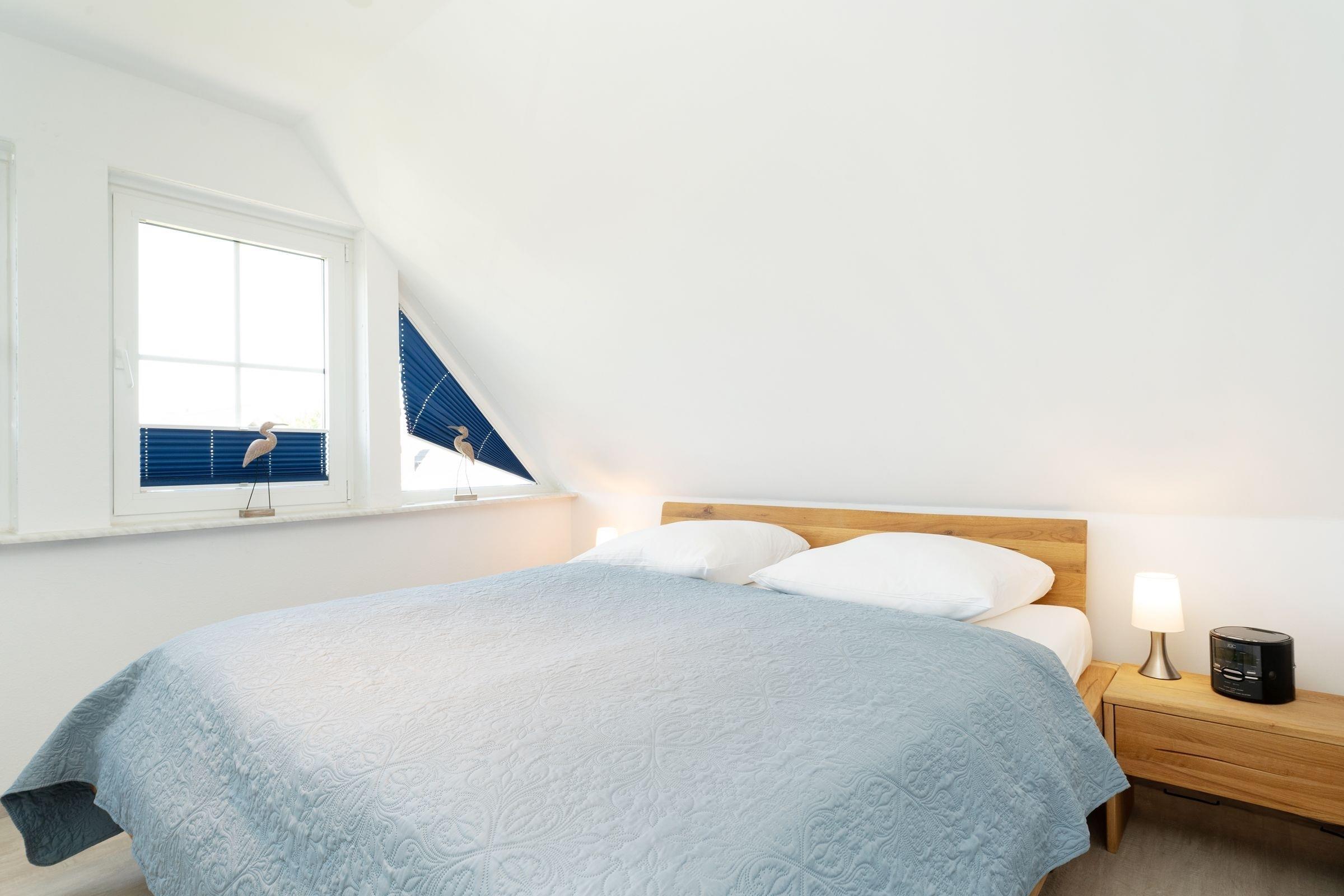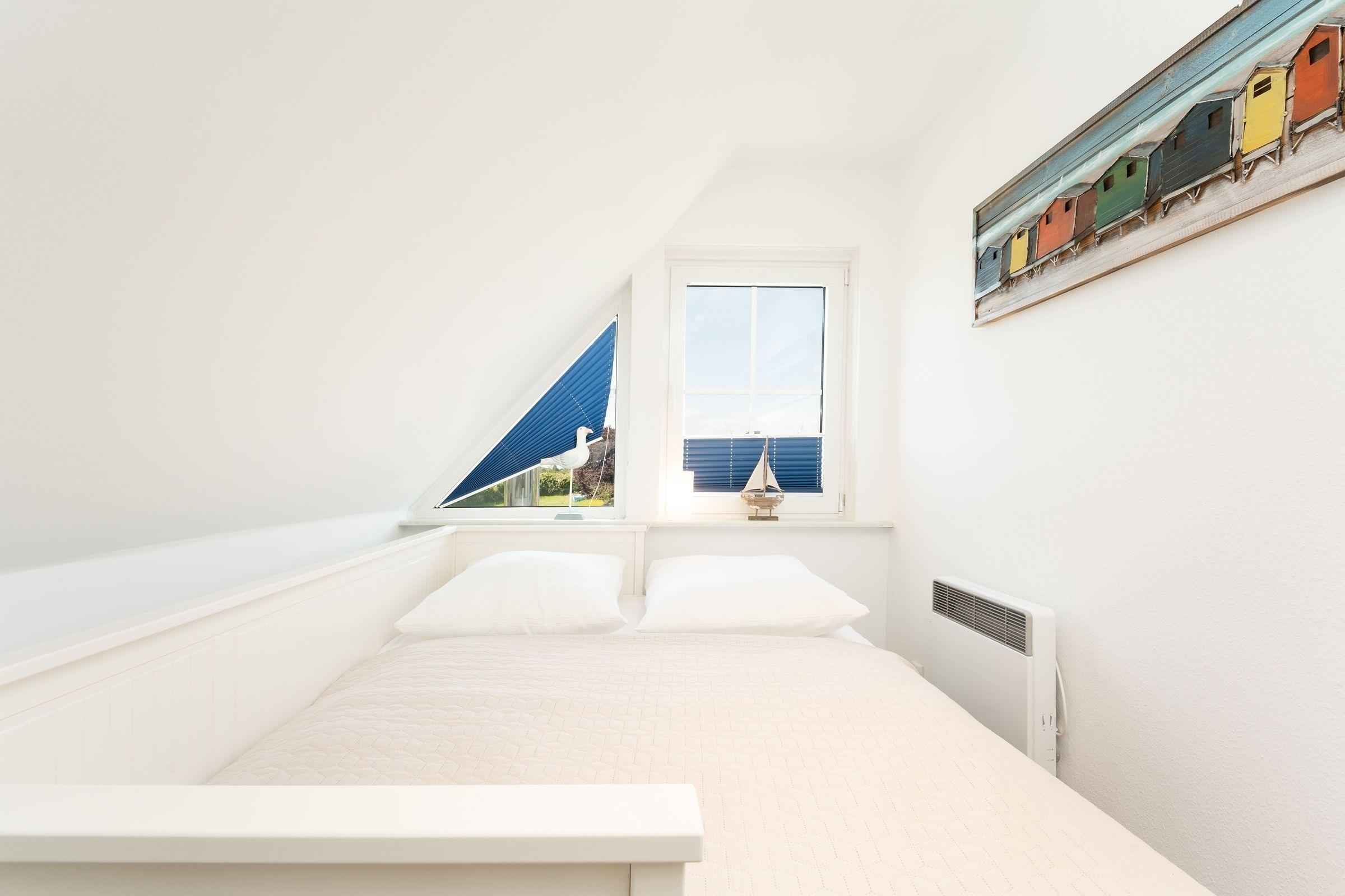 Schlafzimmer 1 (OG): 1 Doppelbett (2x 90x200 cm), TV, Kommode, Plissees zur Verdunkelung, kein Platz für Babybett vorhanden
